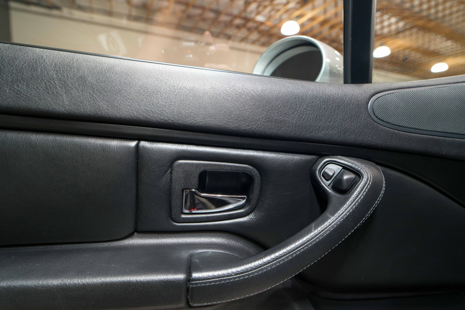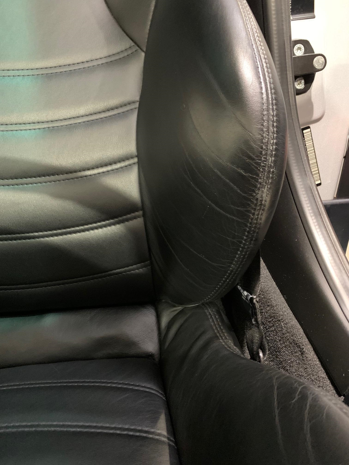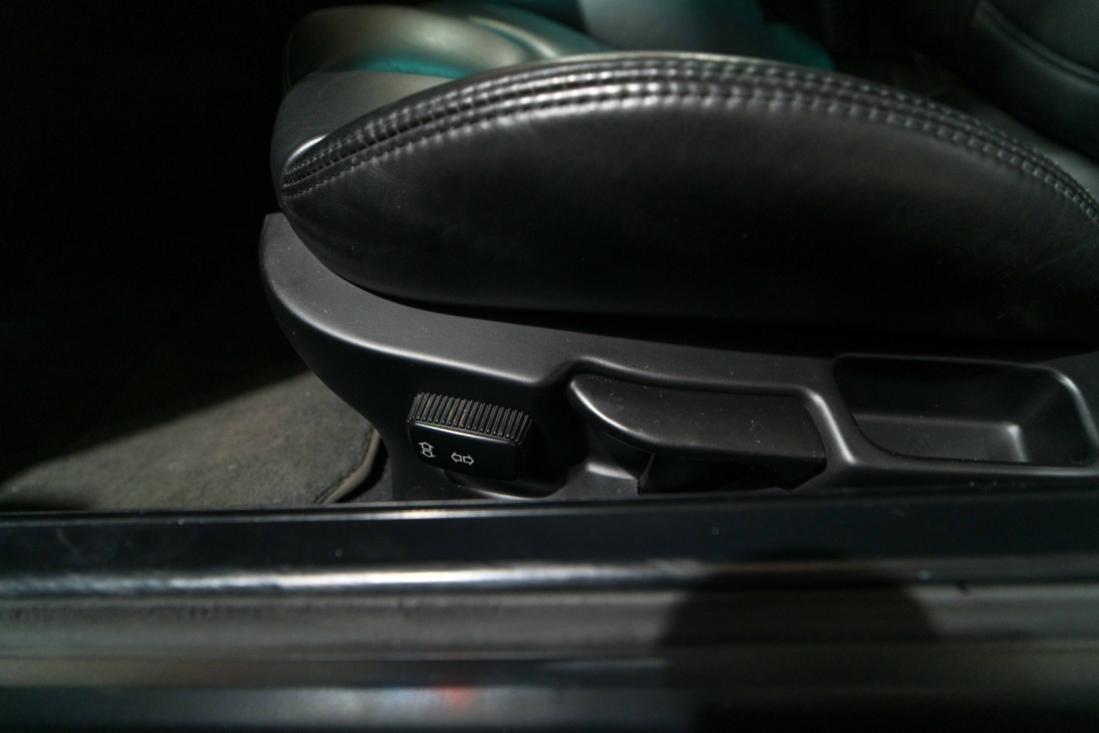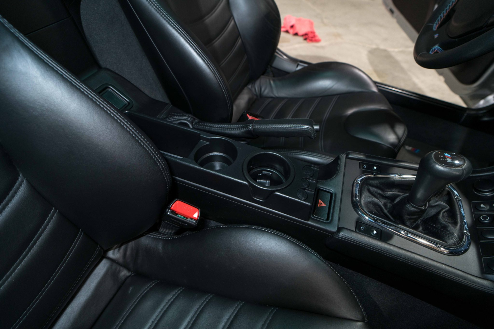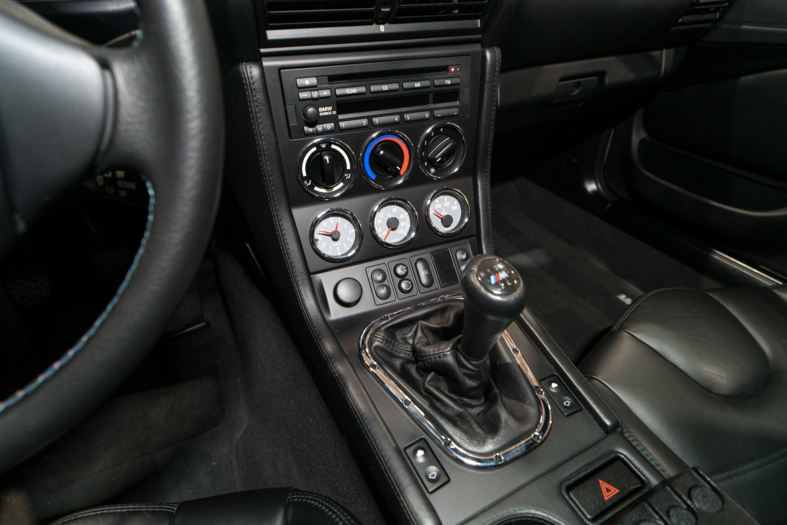 The cabin is trimmed in black Nappa leather upholstery with a matching center console, door panels, carpets, and M-embroidered floor mats. Amenities include heated seats, air conditioning, cruise control, a lockable glovebox, and a BMW Business CD stereo with a Harman Kardon audio system. Wear is present on the driver’s seat outer bolster.