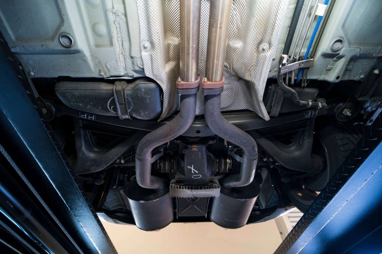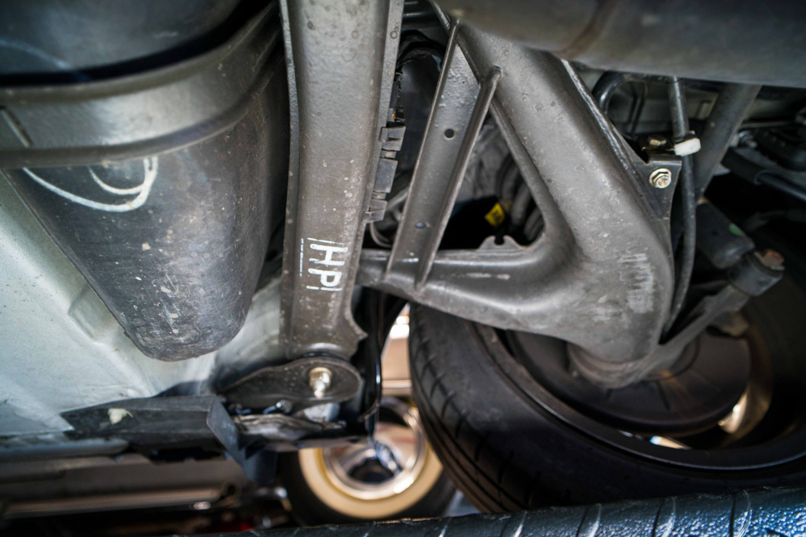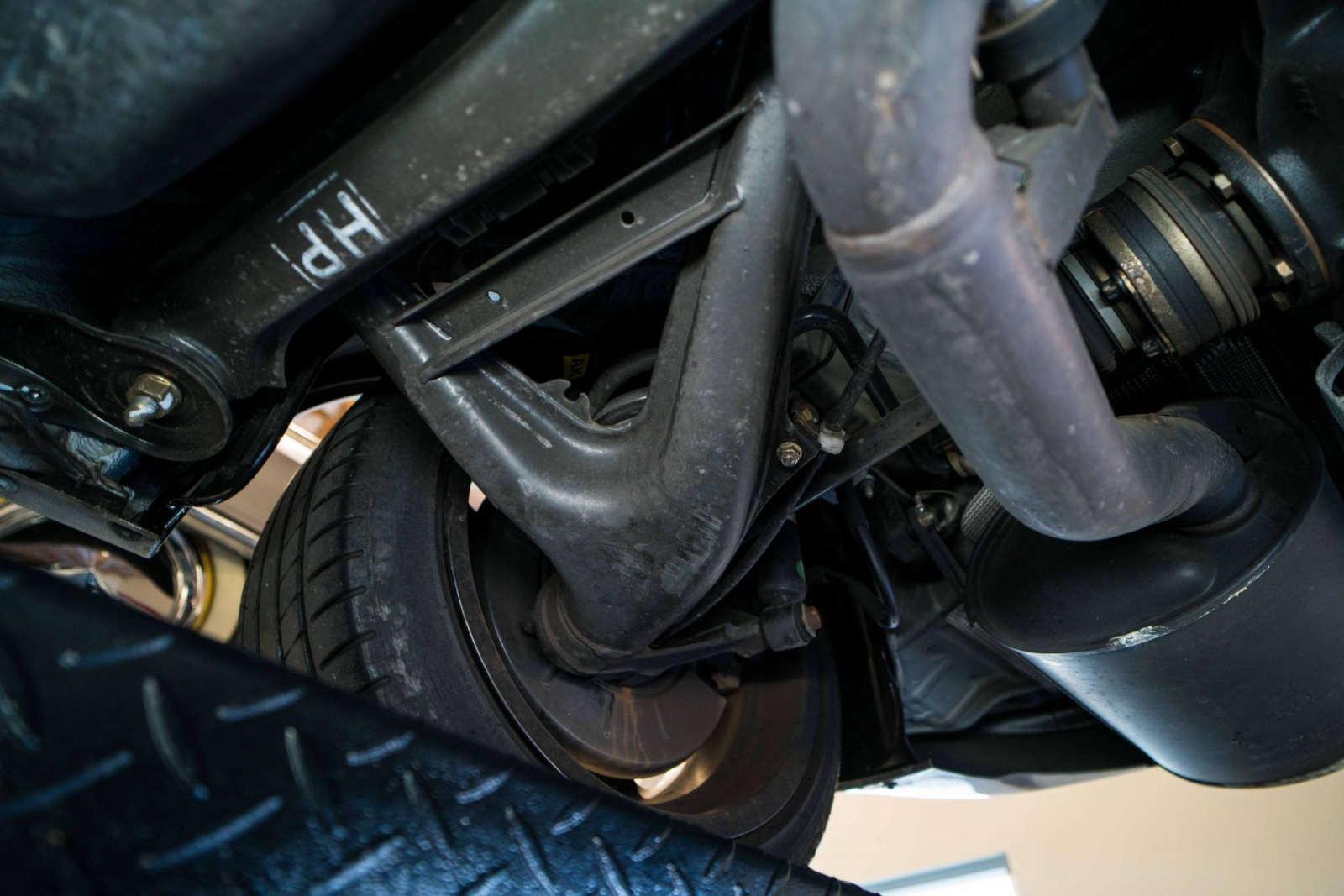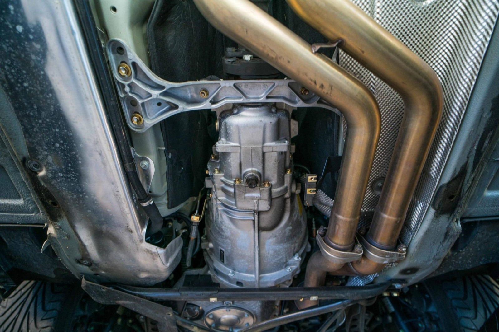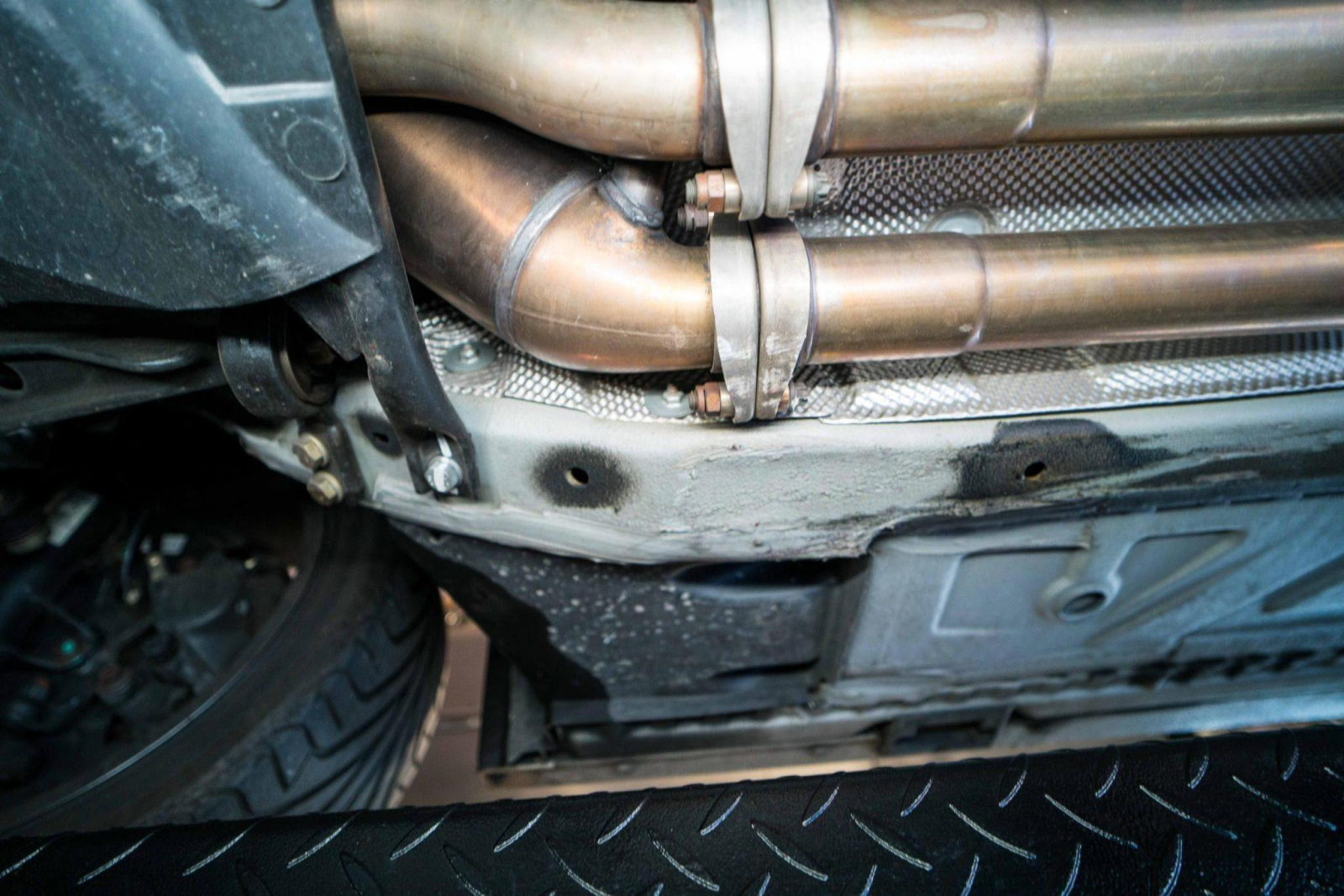 Power is sent to the rear wheels through a five-speed manual transmission and a limited-slip differential. Additional photos of the underside, suspension, and exhaust are viewable in the gallery.