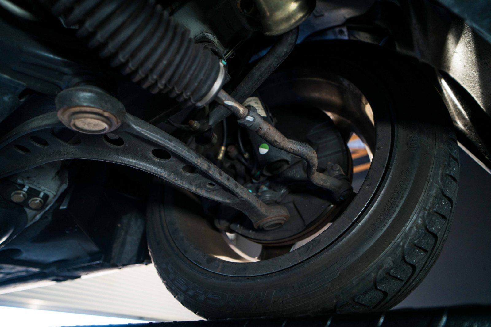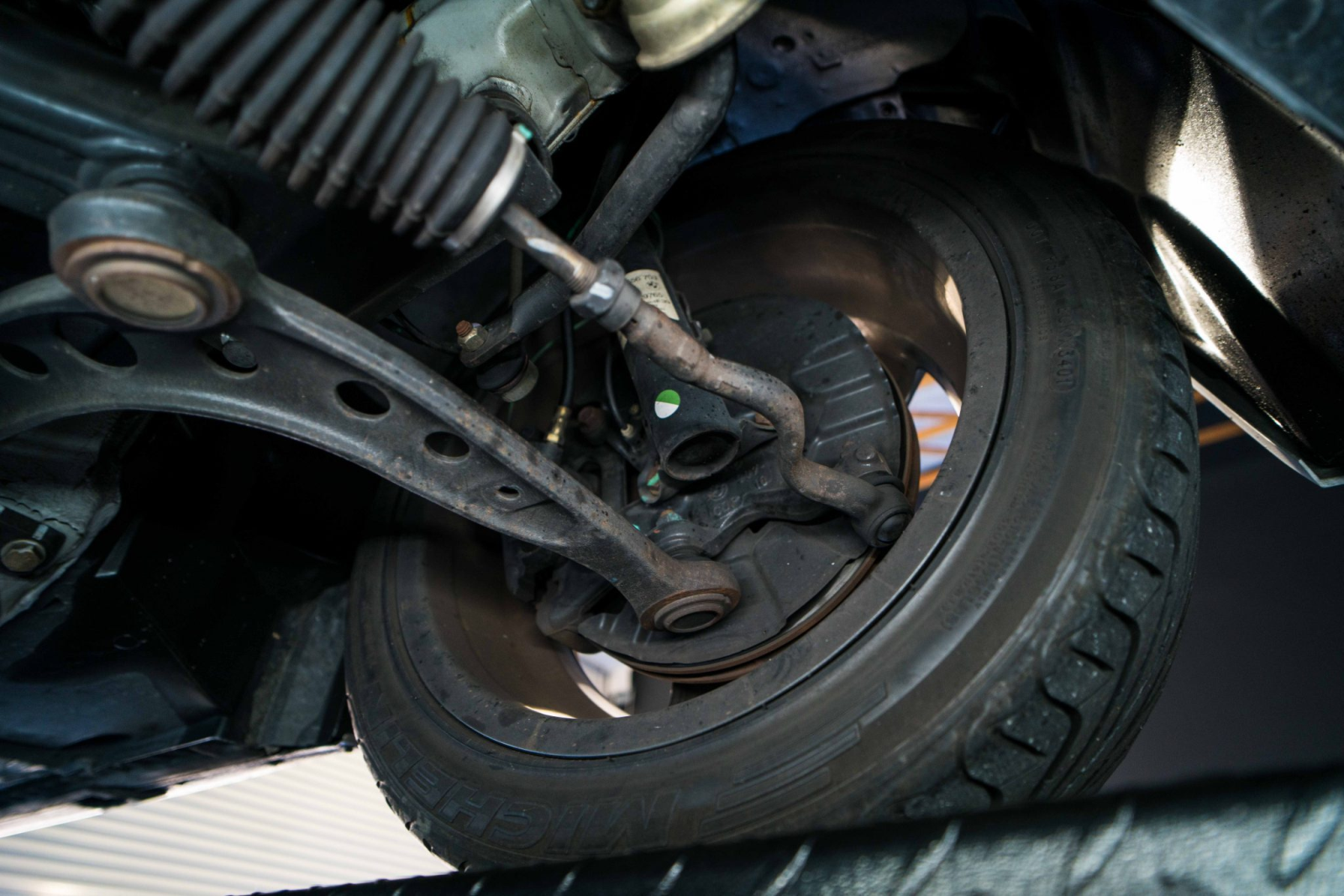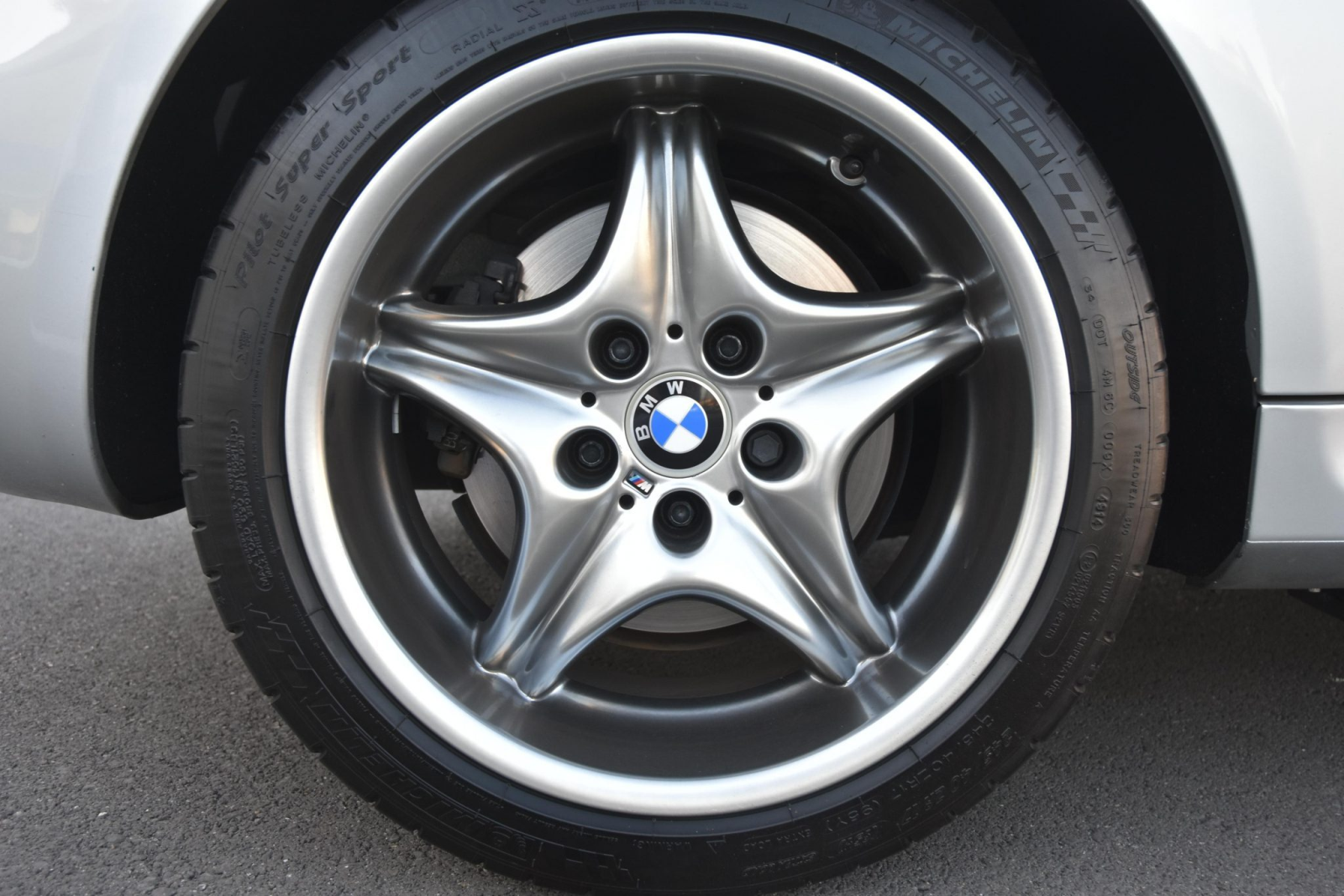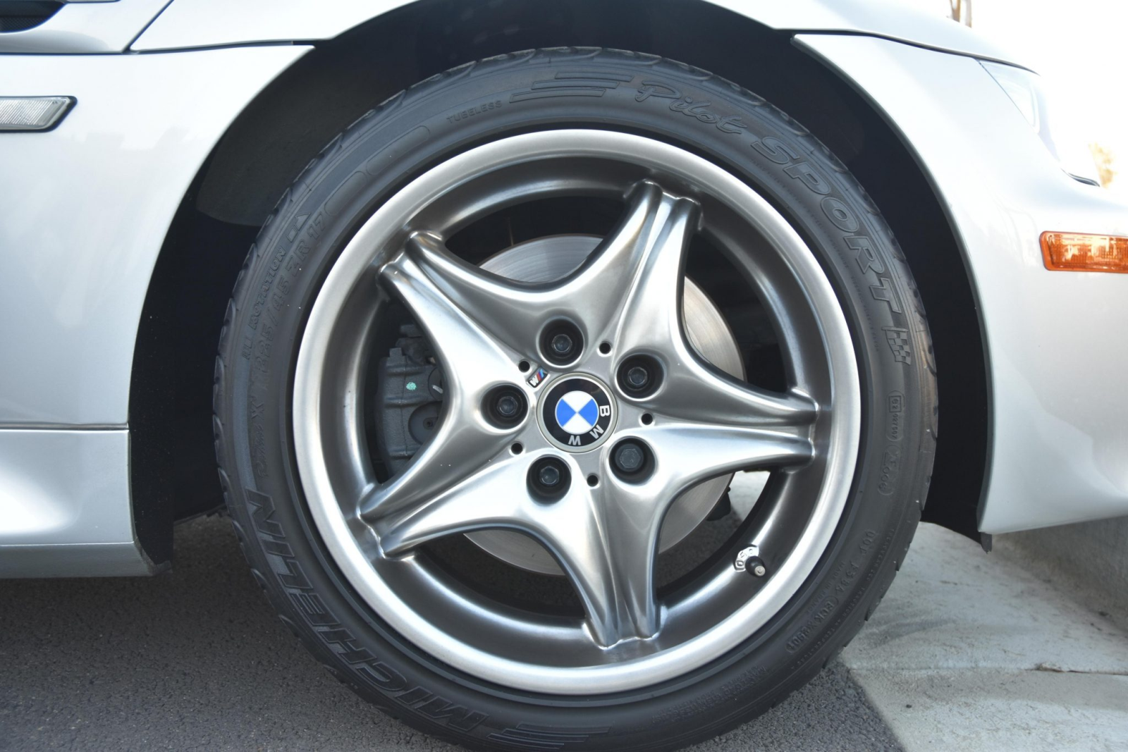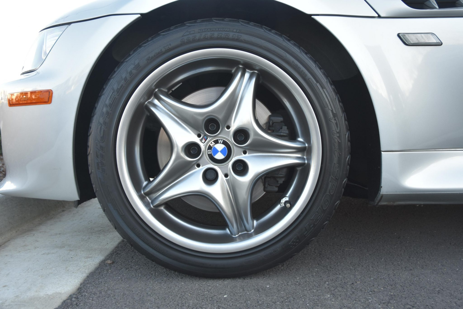 Factory 17″ Style 40 wheels wear 225/45 and 245/40 Michelin rubber. One of the tires shows a date code from 2014, while the other three display codes from 2001, and the seller notes that the three older tires show cracks.