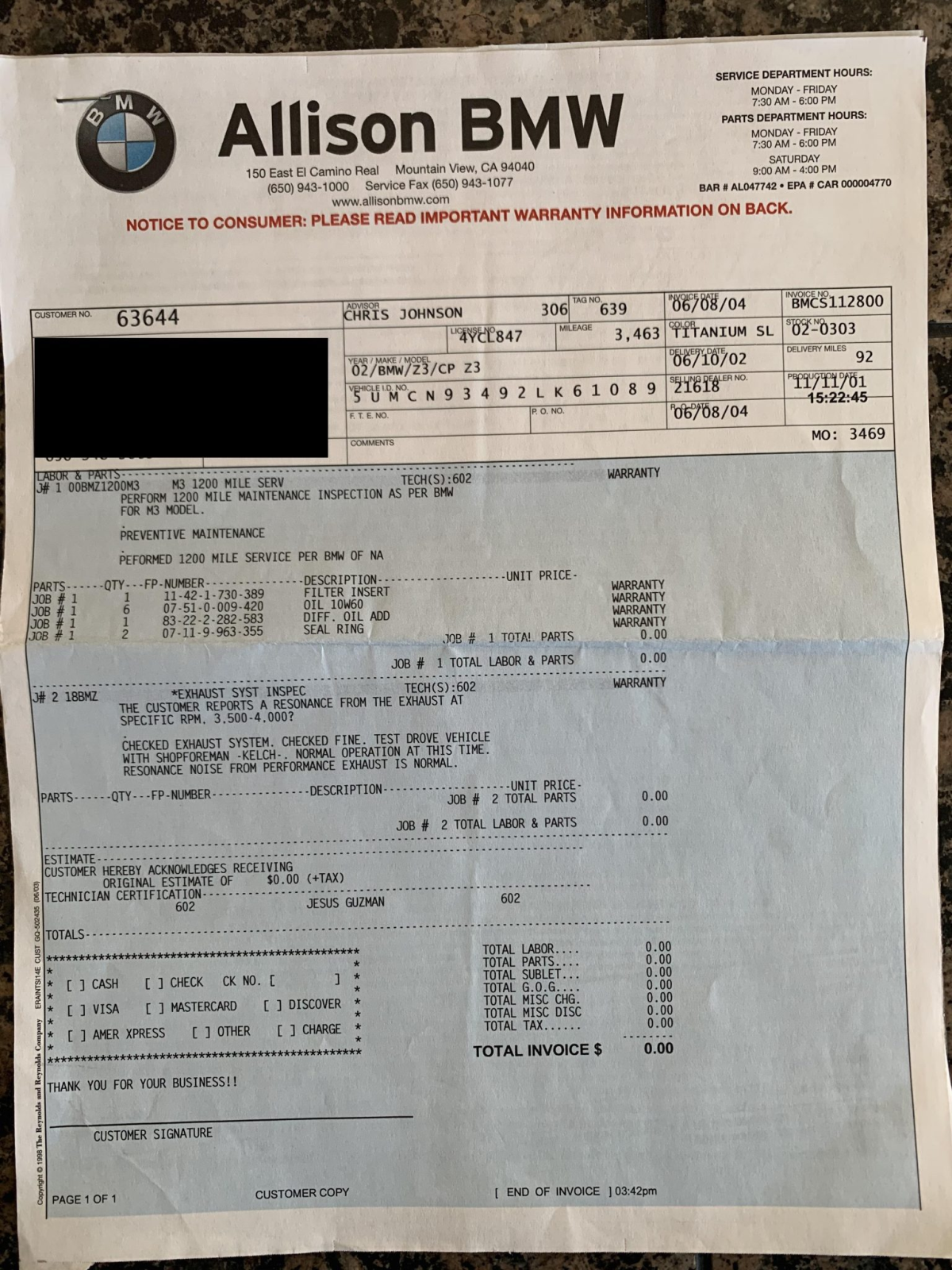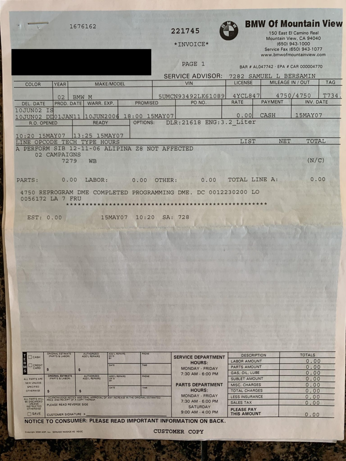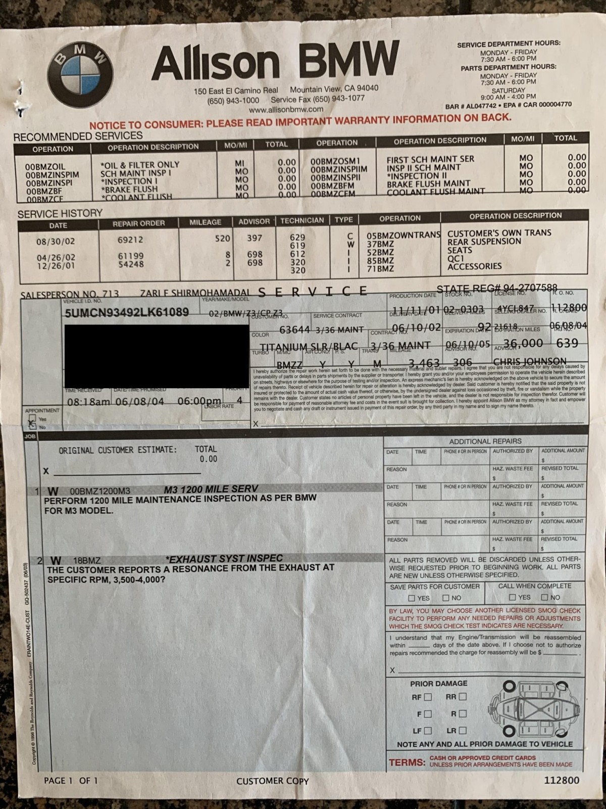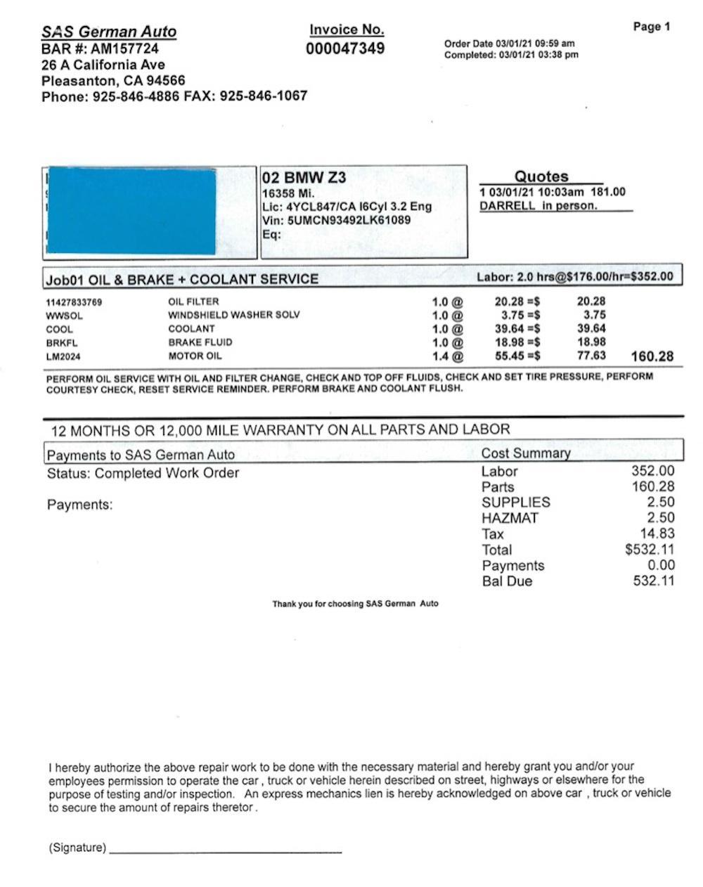 The 3.2-liter S54 inline-six was factory rated at 315 horsepower and 251 lb-ft of torque. Work performed on March 1st, 2021 included a coolant and brake fluid flush as well as an oil and filter change.