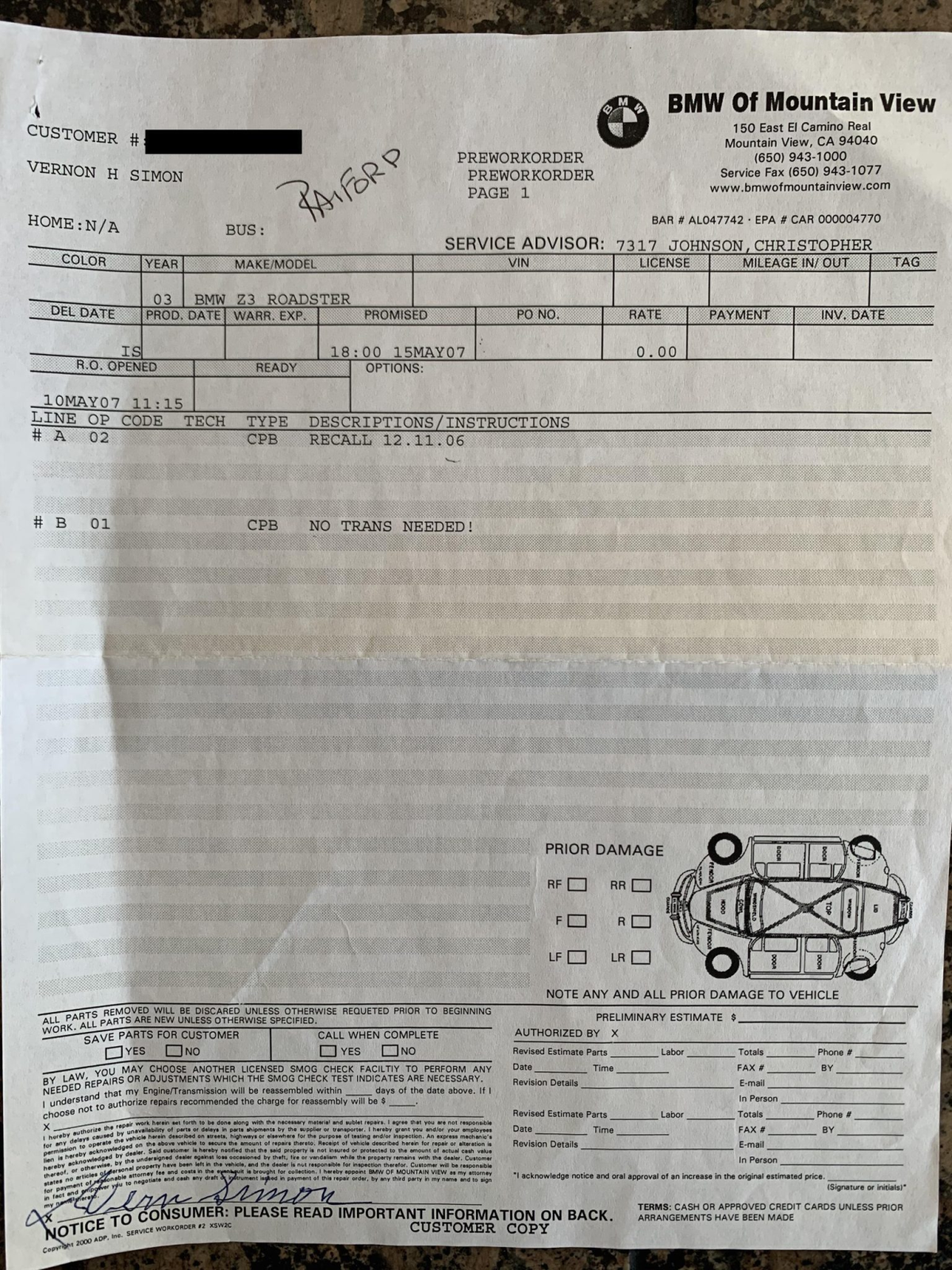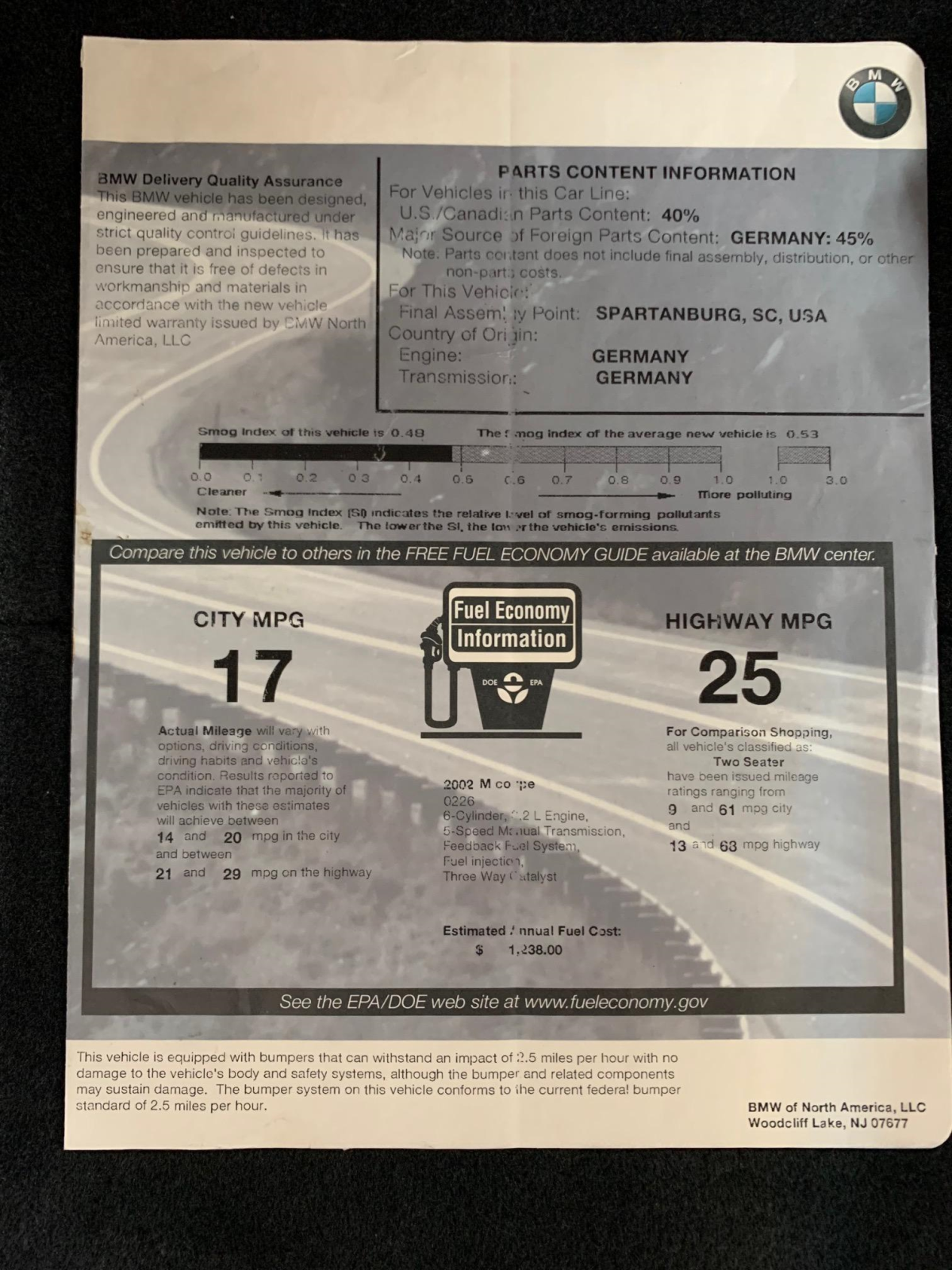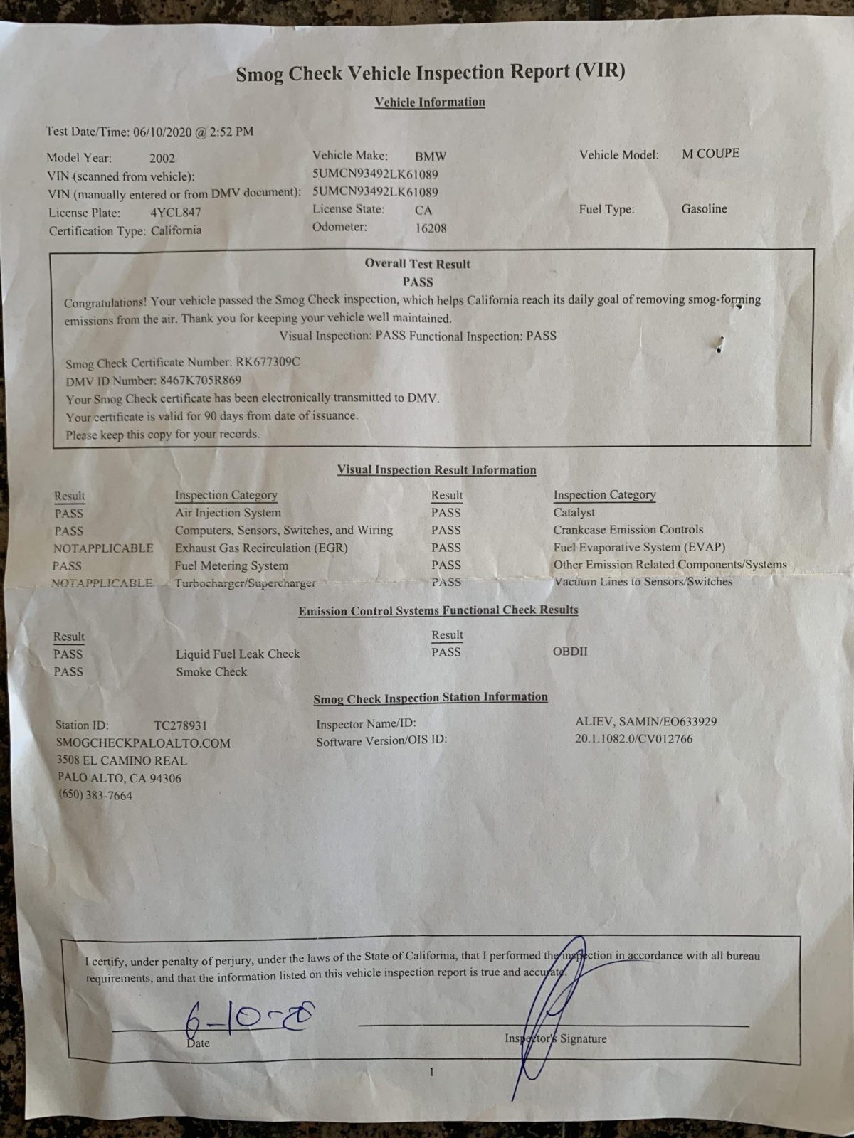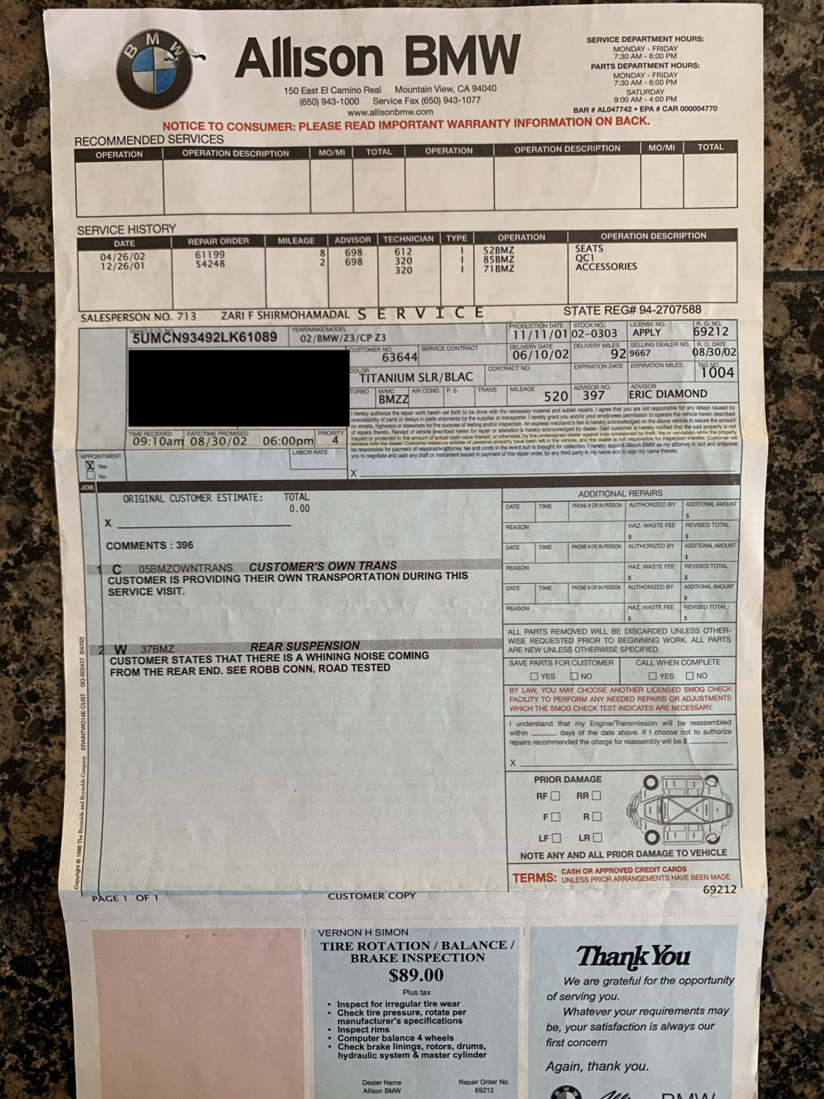 The 3.2-liter S54 inline-six was factory rated at 315 horsepower and 251 lb-ft of torque. Work performed on March 1st, 2021 included a coolant and brake fluid flush as well as an oil and filter change.
