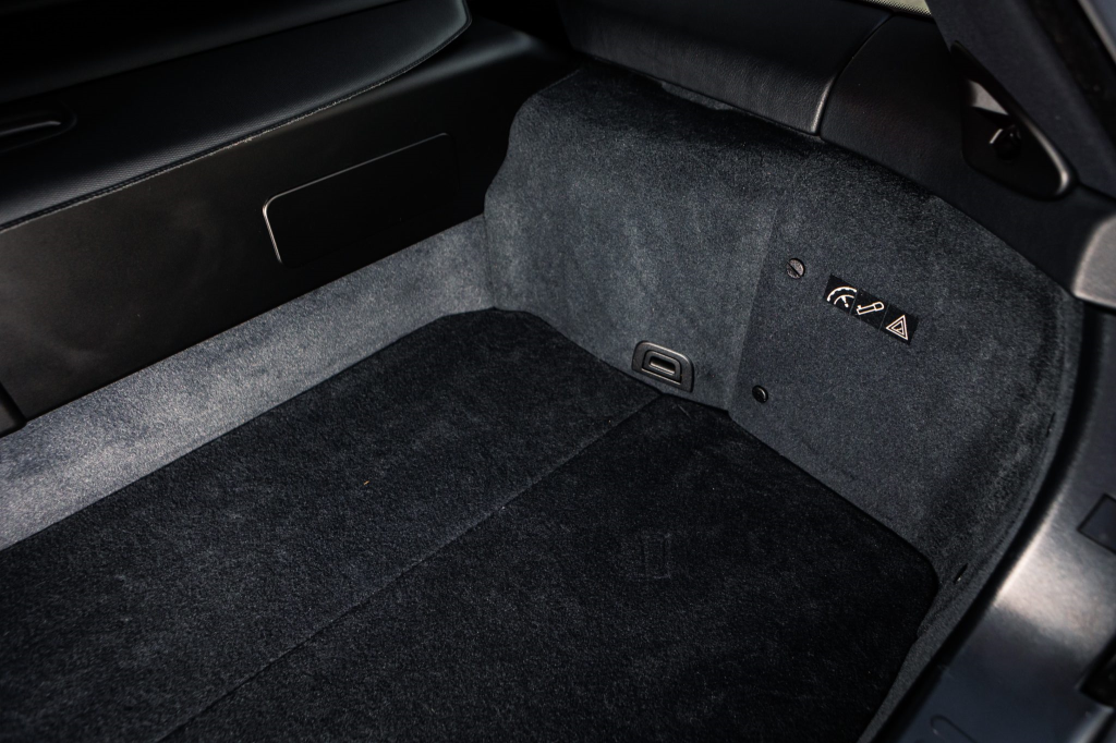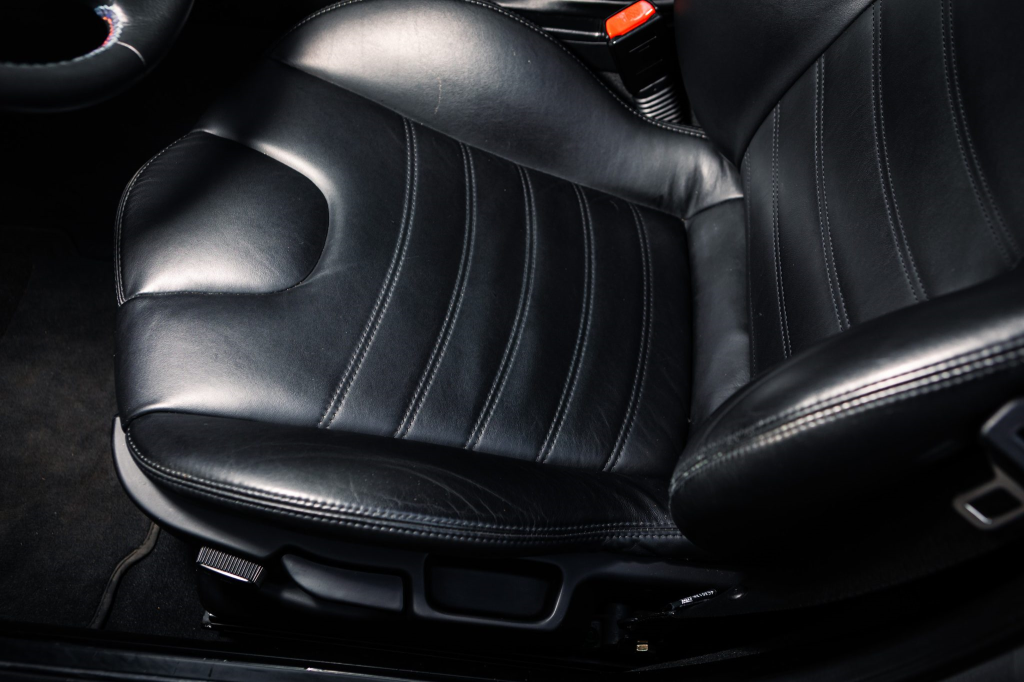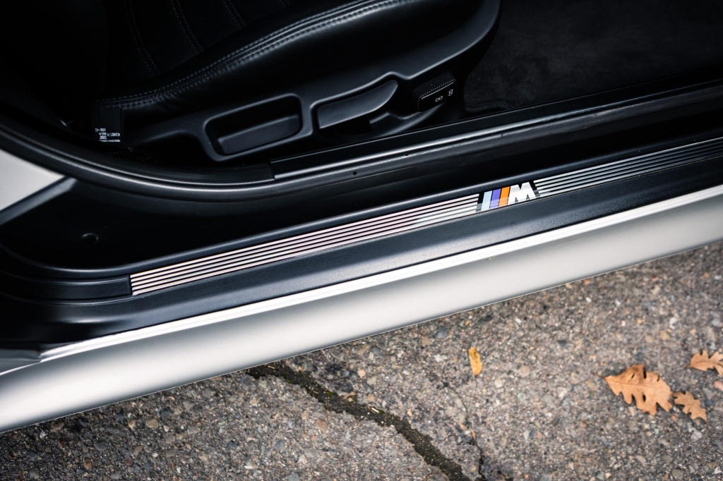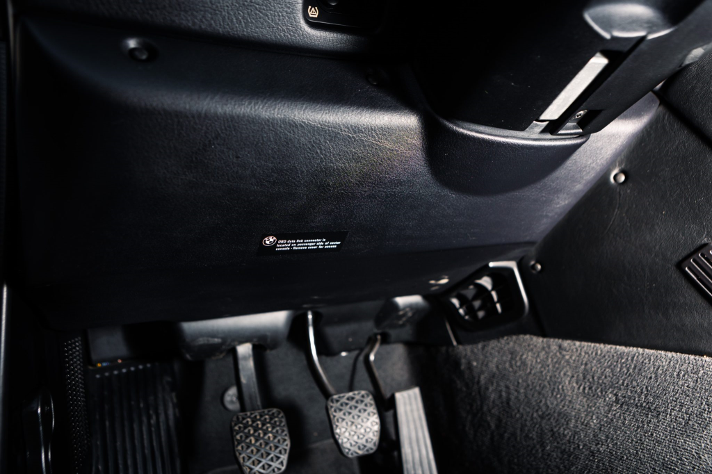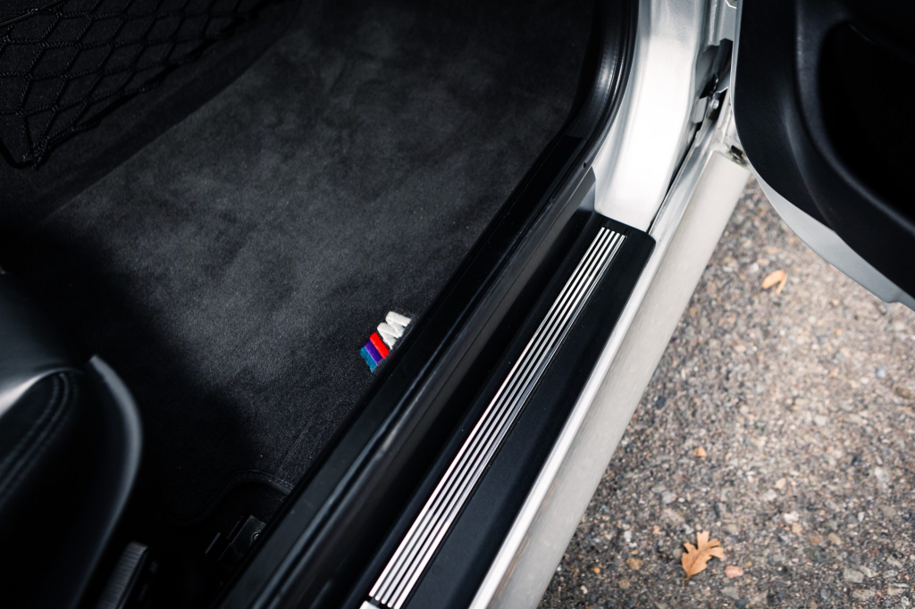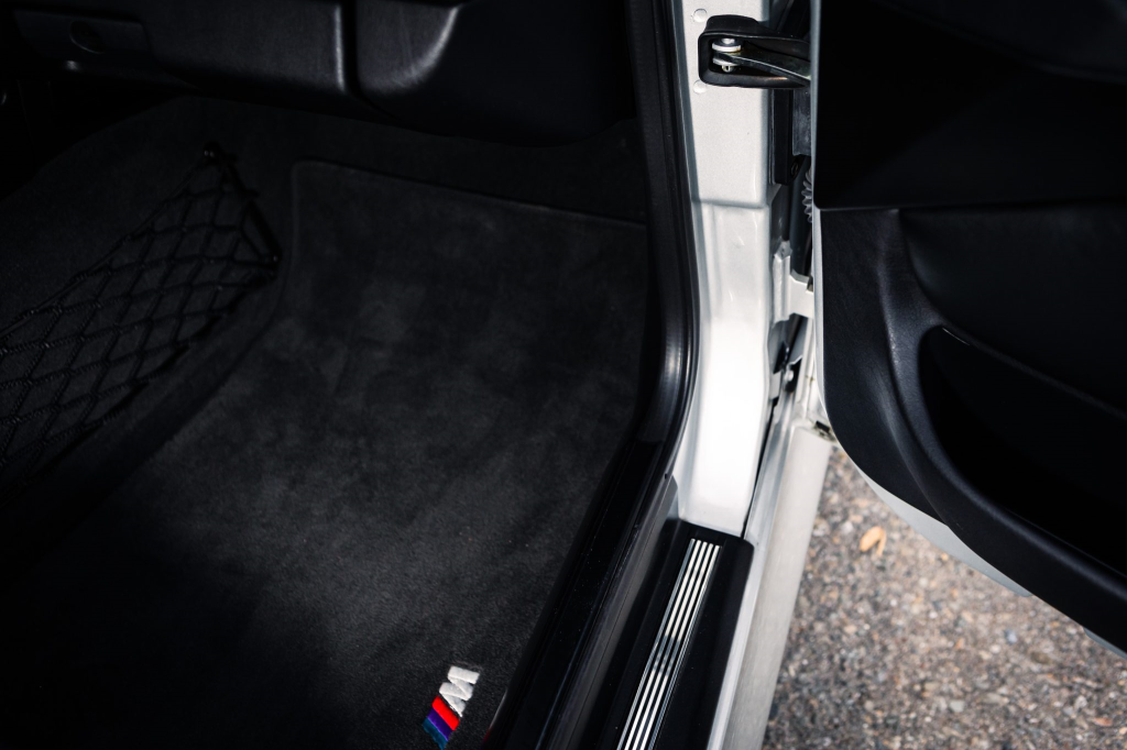 The heated seats are trimmed in black Nappa leather upholstery, and the cabin features a matching center console, door panels, carpets, and M-embroidered floor mats. Amenities include air conditioning, cruise control, a lockable glovebox, and a BMW Business CD stereo with a Harman Kardon audio system. The driver’s seat outer bolster shows wear