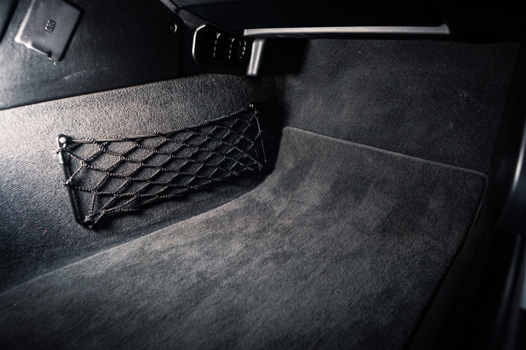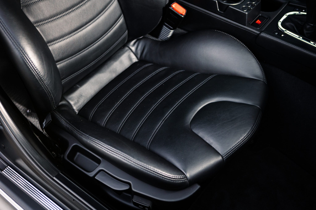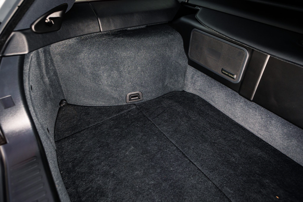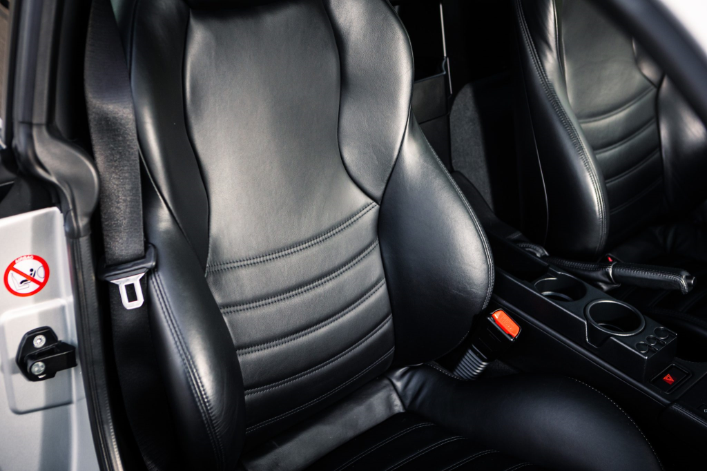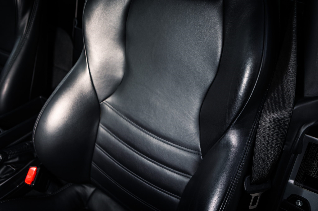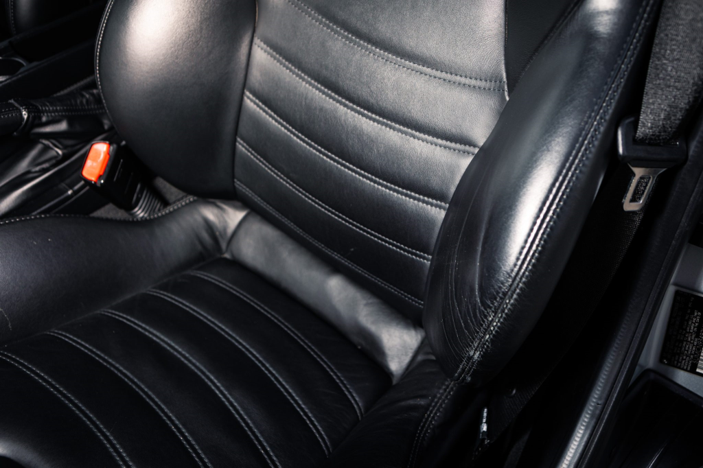 The heated seats are trimmed in black Nappa leather upholstery, and the cabin features a matching center console, door panels, carpets, and M-embroidered floor mats. Amenities include air conditioning, cruise control, a lockable glovebox, and a BMW Business CD stereo with a Harman Kardon audio system. The driver’s seat outer bolster shows wear