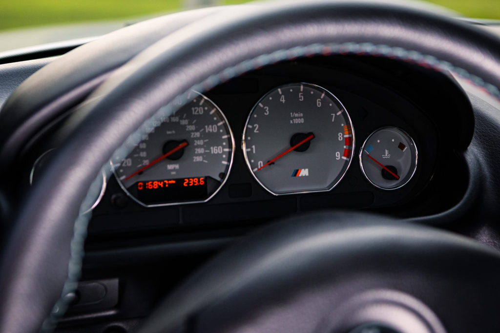 An M Sport steering wheel frames a 170-mph speedometer, a tachometer with an 8k-rpm redline, and auxiliary gauges. The digital odometer indicates 17k miles, approximately 400 of which were added under current ownership.