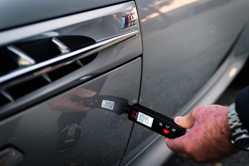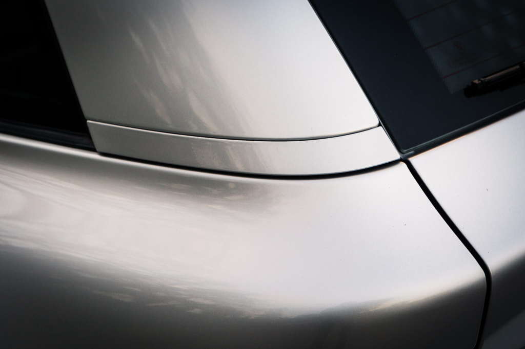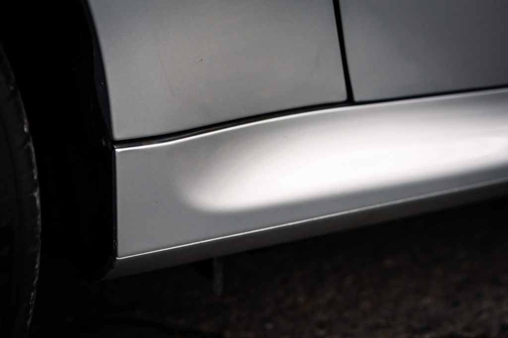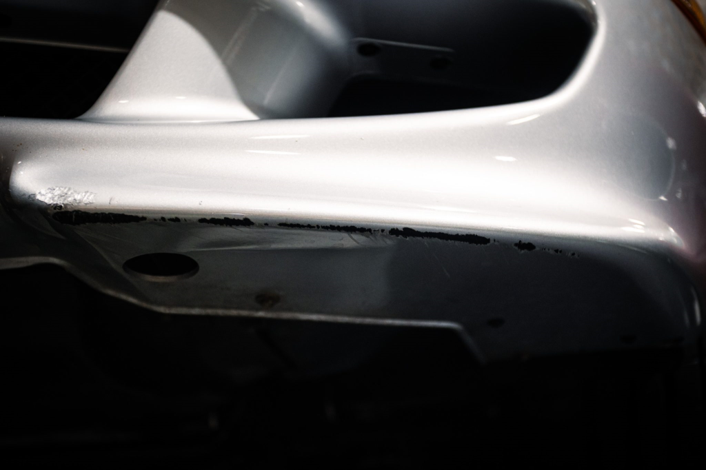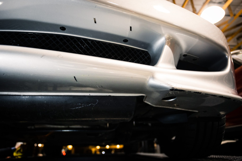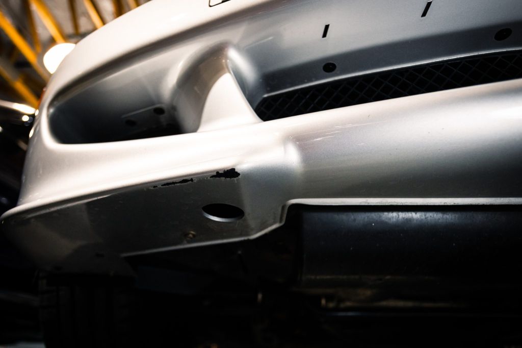 The car is finished in Titanium Silver Metallic (354) with a sunroof, a rear wiper, and four exhaust outlets. Imperfections include scuffs on the lower portion of the left side of the front bumper cover and abrasion on the rear bumper cover. Photographs of paint meter readings are provided in the gallery below.