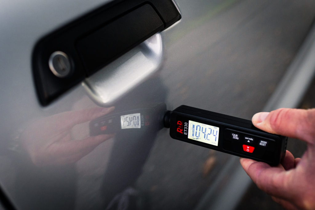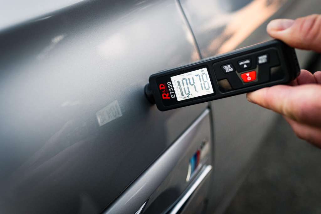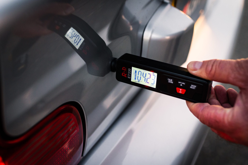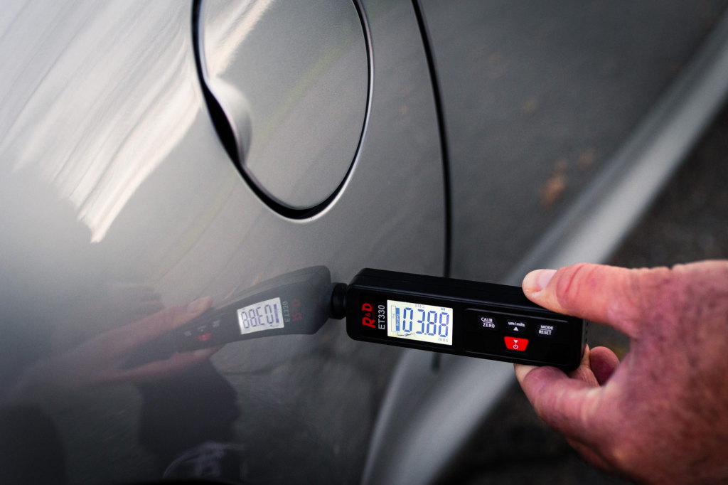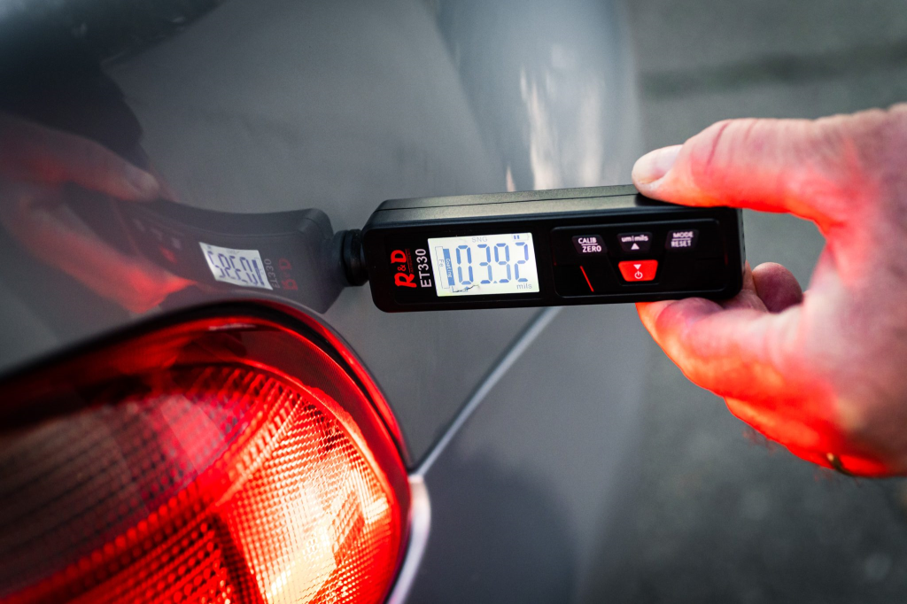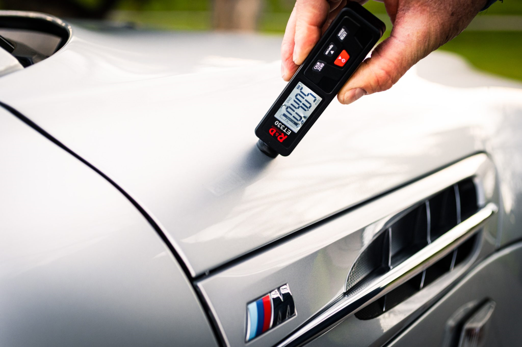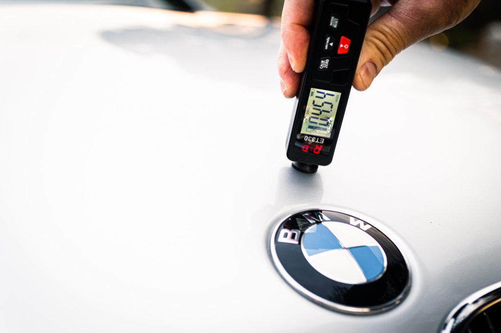 The car is finished in Titanium Silver Metallic (354) with a sunroof, a rear wiper, and four exhaust outlets. Imperfections include scuffs on the lower portion of the left side of the front bumper cover and abrasion on the rear bumper cover. Photographs of paint meter readings are provided in the gallery below.