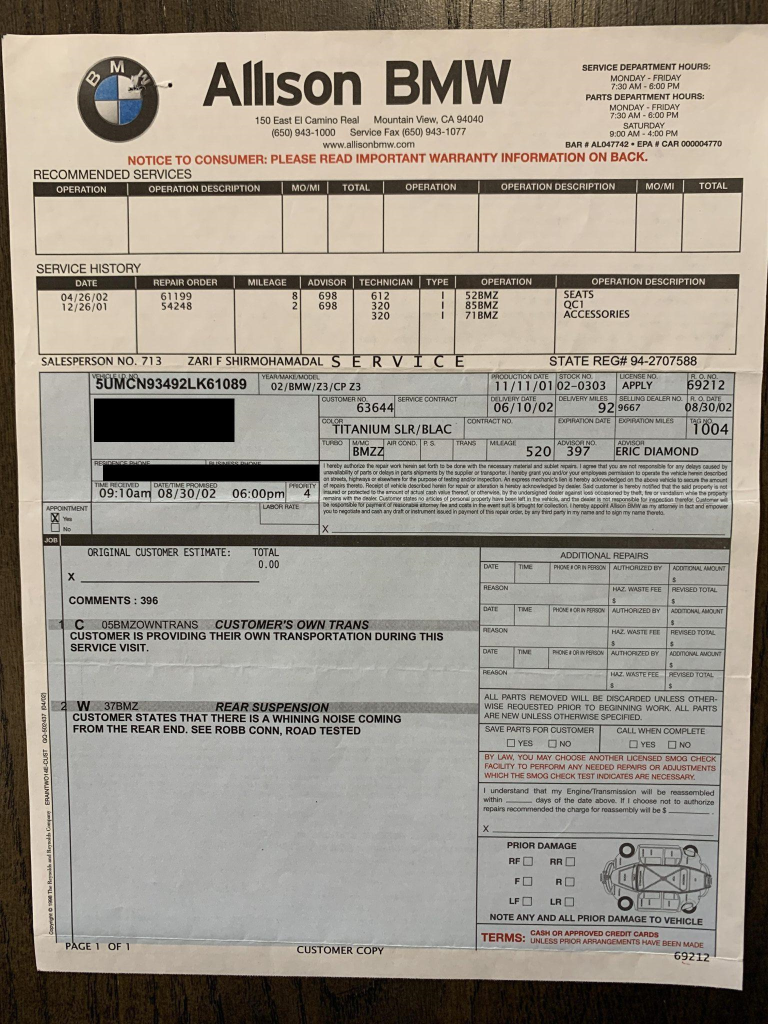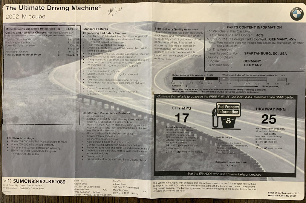 This 2002 BMW M Coupe is finished in Titanium Silver Metallic over black leather and is powered by a 3.2-liter S54 inline-six mated to a five-speed manual transmission and a limited-slip differential. Equipment includes a sunroof, staggered-width 17? Style 40 wheels, cruise control, heated seats, a Harman Kardon audio system, and a CD player. The car was first sold by Allison BMW of Mountain View, California, and was acquired by the owning dealer on BaT in March 2021. This M Coupe has 17k miles and is now offered by the seller on behalf of the owning dealer with factory literature, a window sticker, original purchase documentation, accessories, a clean Carfax report, and a clean California title.