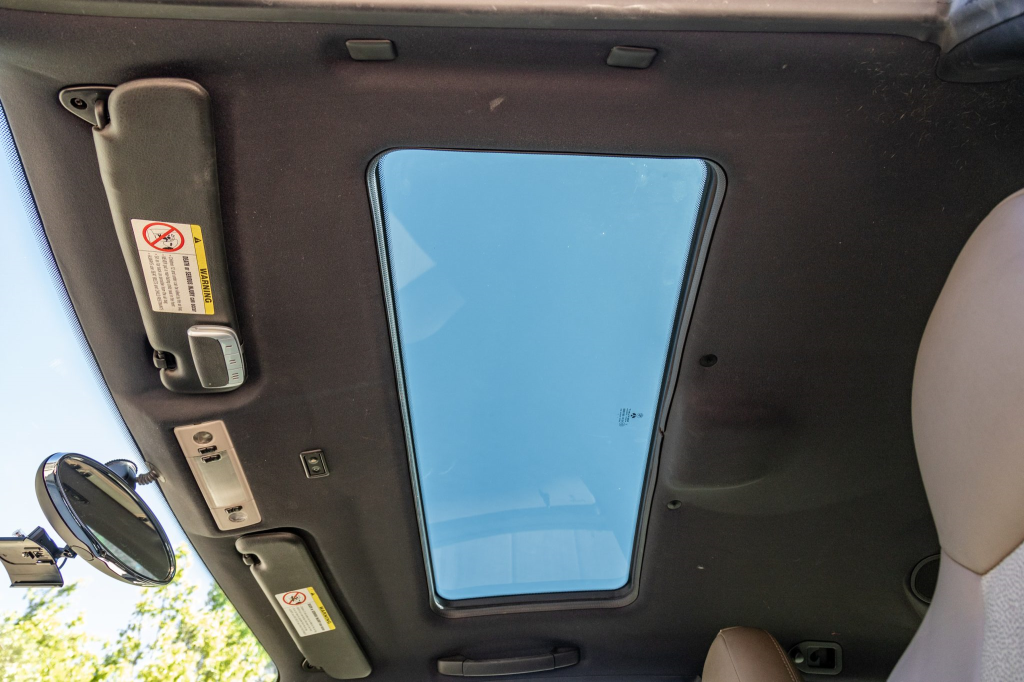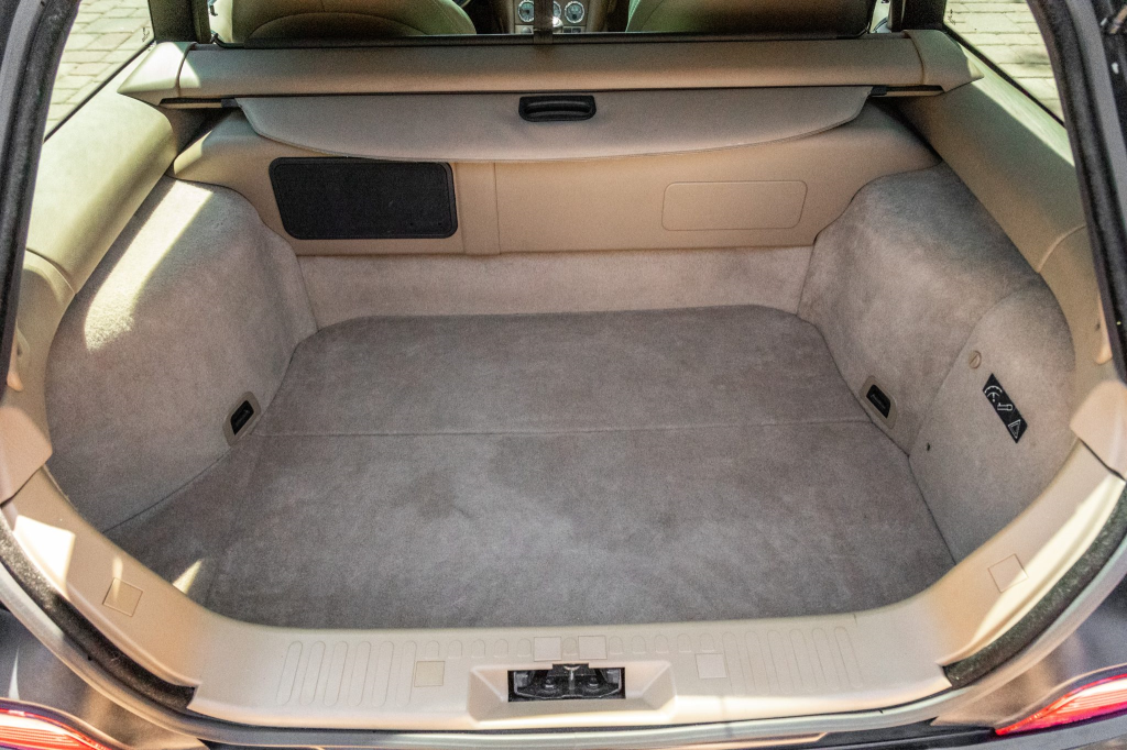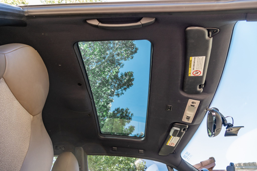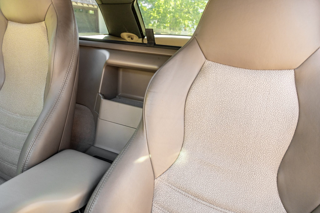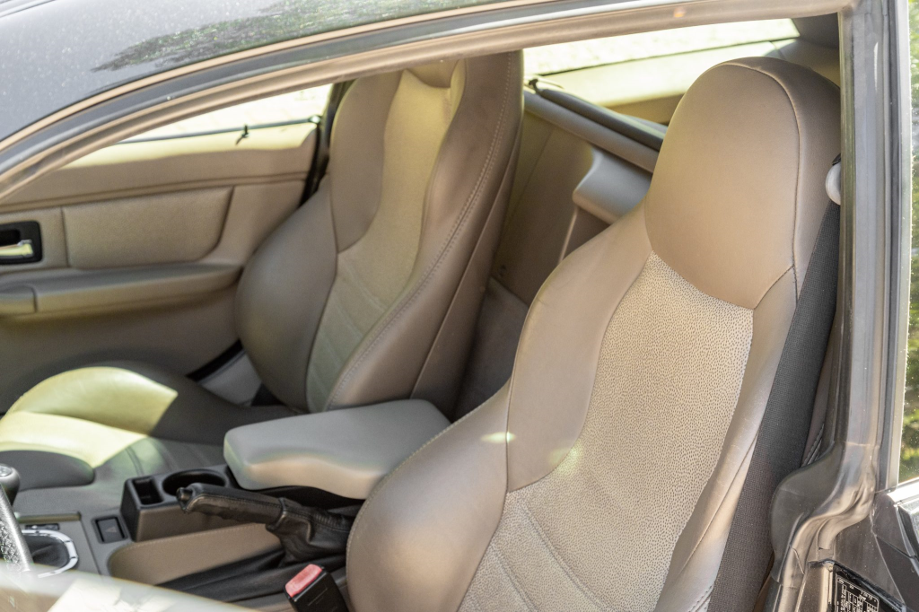 The cabin features Dark Beige Oregon leather covering the heated sport seats, door panel inserts, and center console. Amenities include air conditioning, cruise control, a CD stereo, a ZHP-specification shift knob, and a Harman Kardon sound system. Replacement beige and black door panel armrests are included in the sale.