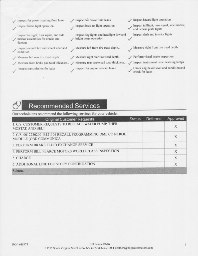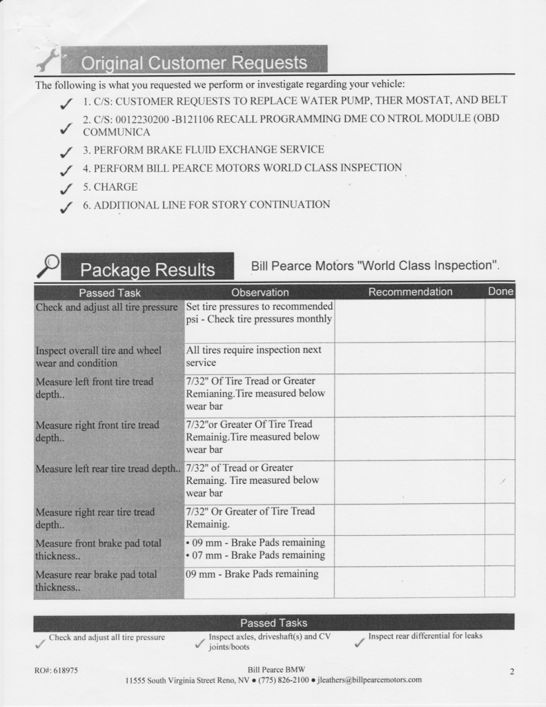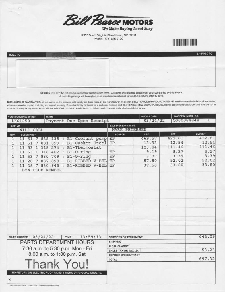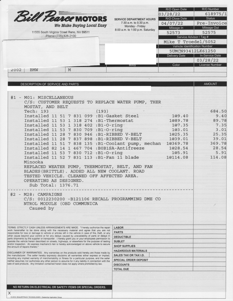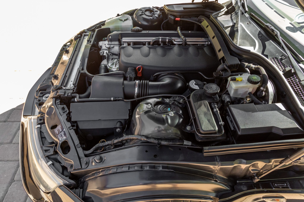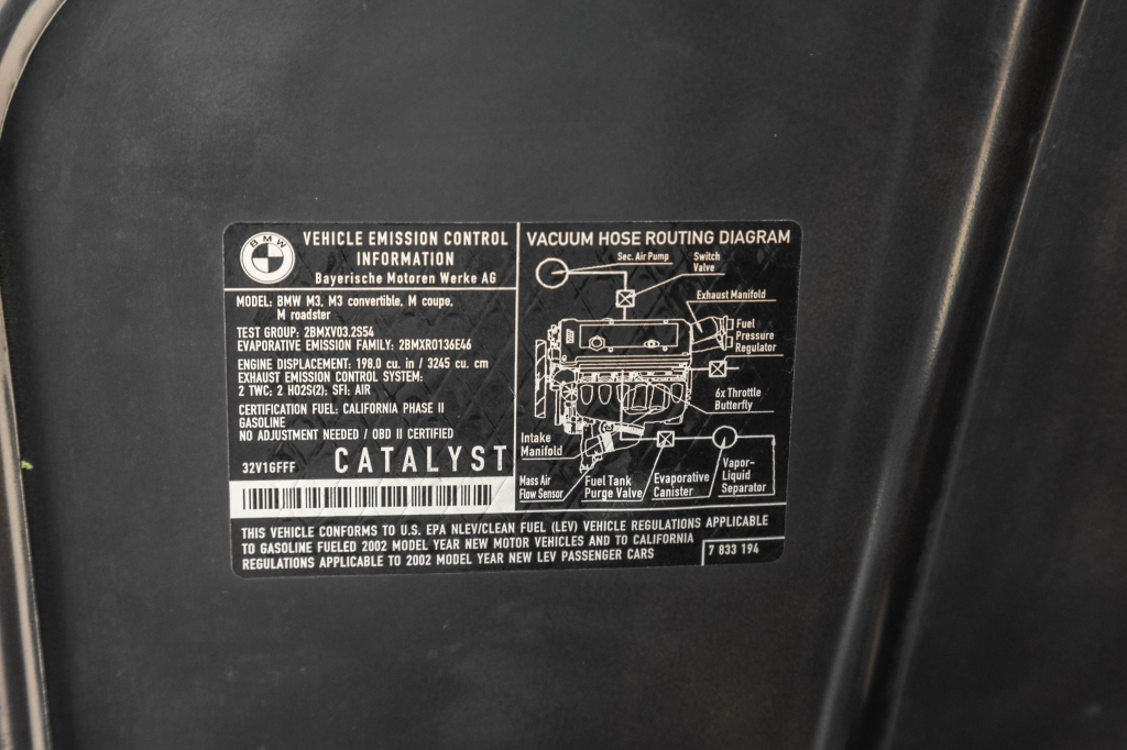 The 3.2-liter S54B32 inline-six features double-VANOS variable valve timing and a Siemens MSS 54 engine management control system. Output was factory rated at 315 horsepower and 258 lb-ft of torque. Records indicate that work completed in March 2022 included reprogramming the DME control module and replacing the water pump, thermostat, drive belts, and fan blades.