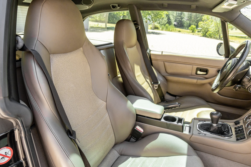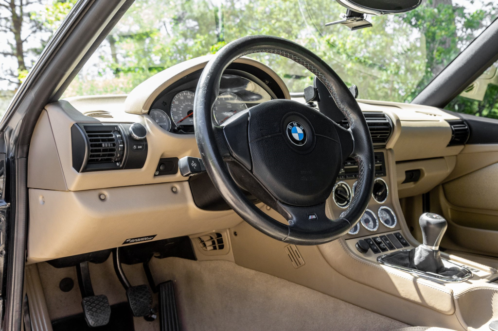 This M Coupe is one of just nine finished in Black Sapphire Metallic over Dark Beige Oregon leather for the North American market for the model year. Features include an electric sunroof, front fender vents, a rear window wiper, quad exhaust outlets, and tinted glass.