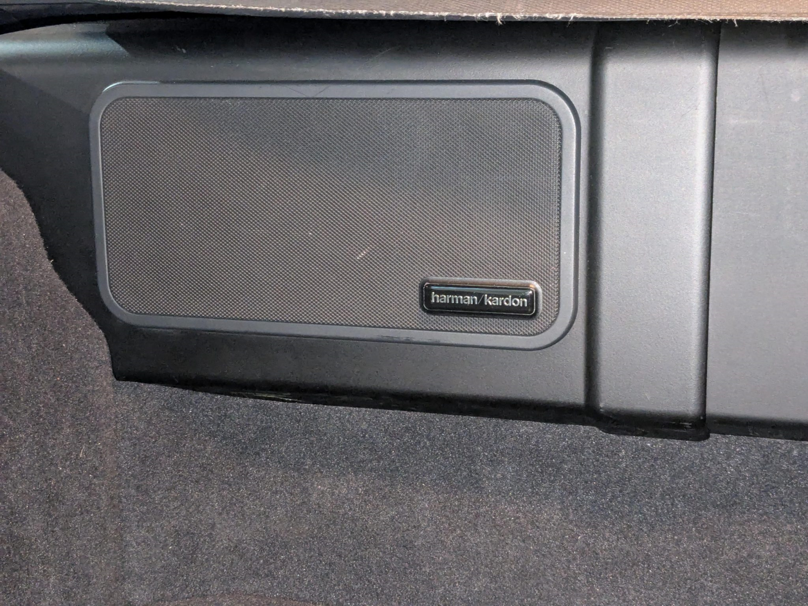 The cabin features black Nappa leather covering the heated sport seats, door panel inserts, and center console. Amenities include air conditioning, cruise control, a Harman Kardon sound system, and a Continental head unit with Bluetooth connectivity. The seat bushings were replaced and the glove box was repaired in 2022. The seller notes squeaking and rattling during use, and reports that the one-touch window operation intermittently does not work.