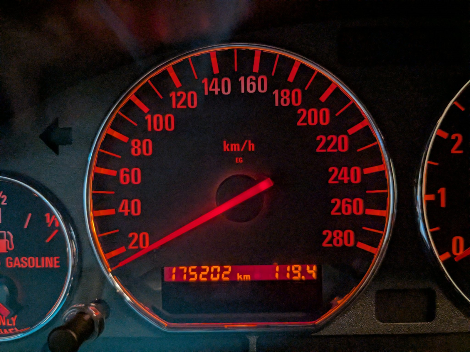 The M-Tech II steering wheel features tri-color stitching and frames a tachometer with a 6,800-rpm redline, a 280-km/h speedometer, and gauges for coolant temperature and fuel level. The digital odometer indicates 175k kilometers (~109k miles), approximately 5k kilometers of which were added under current ownership. A potential odometer rollback is noted in an April 2016 entry on the Carfax report, which the seller believes is a result of a clerical error.