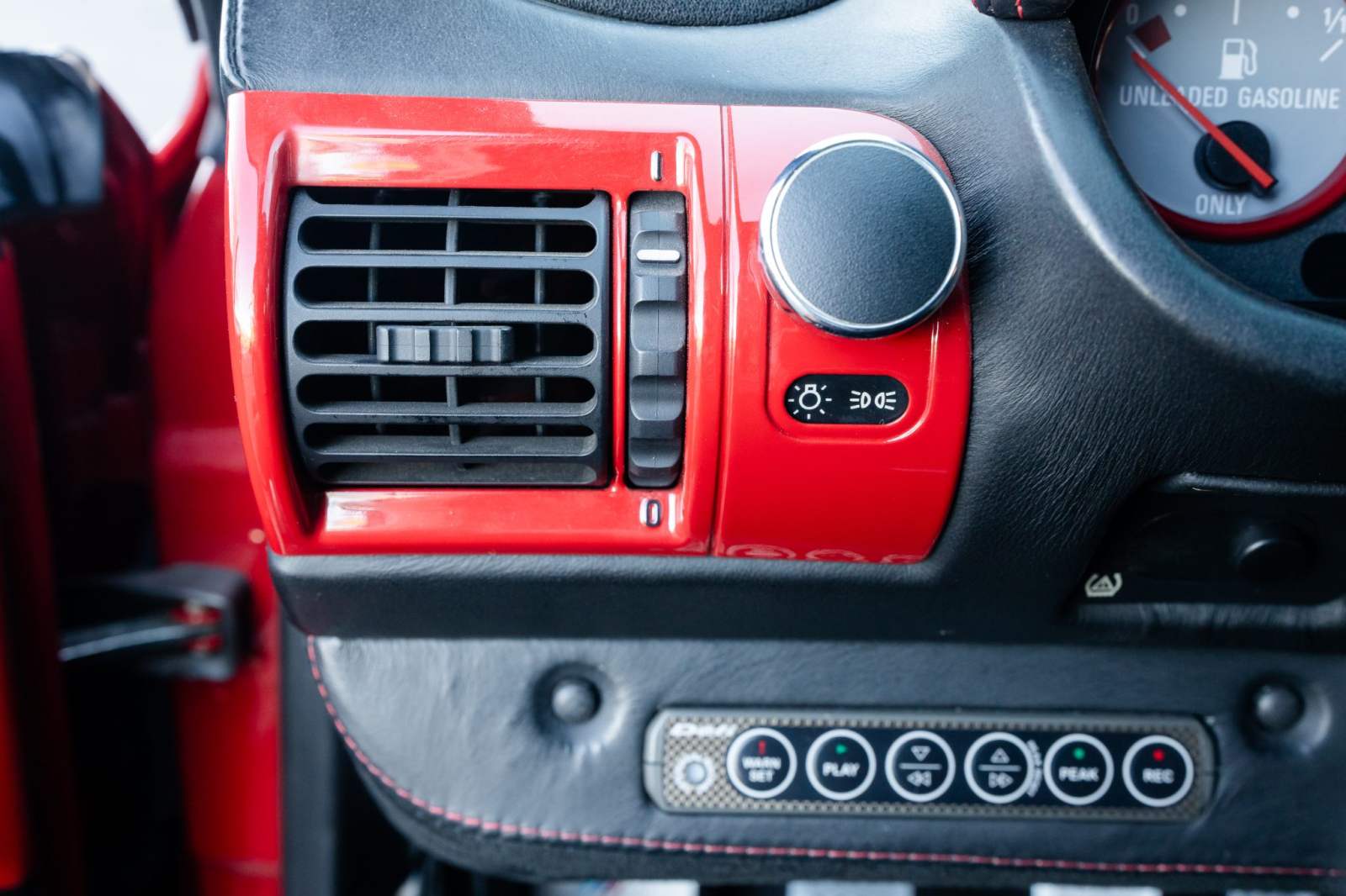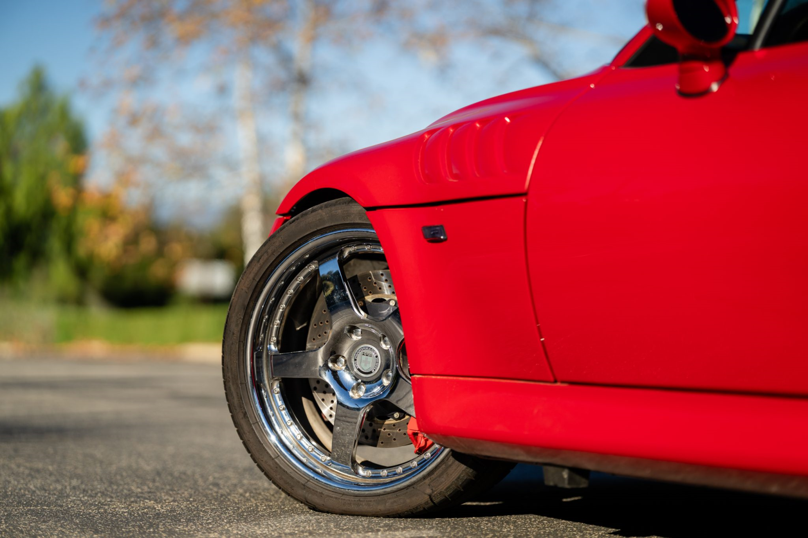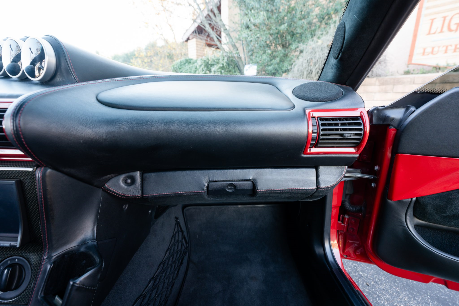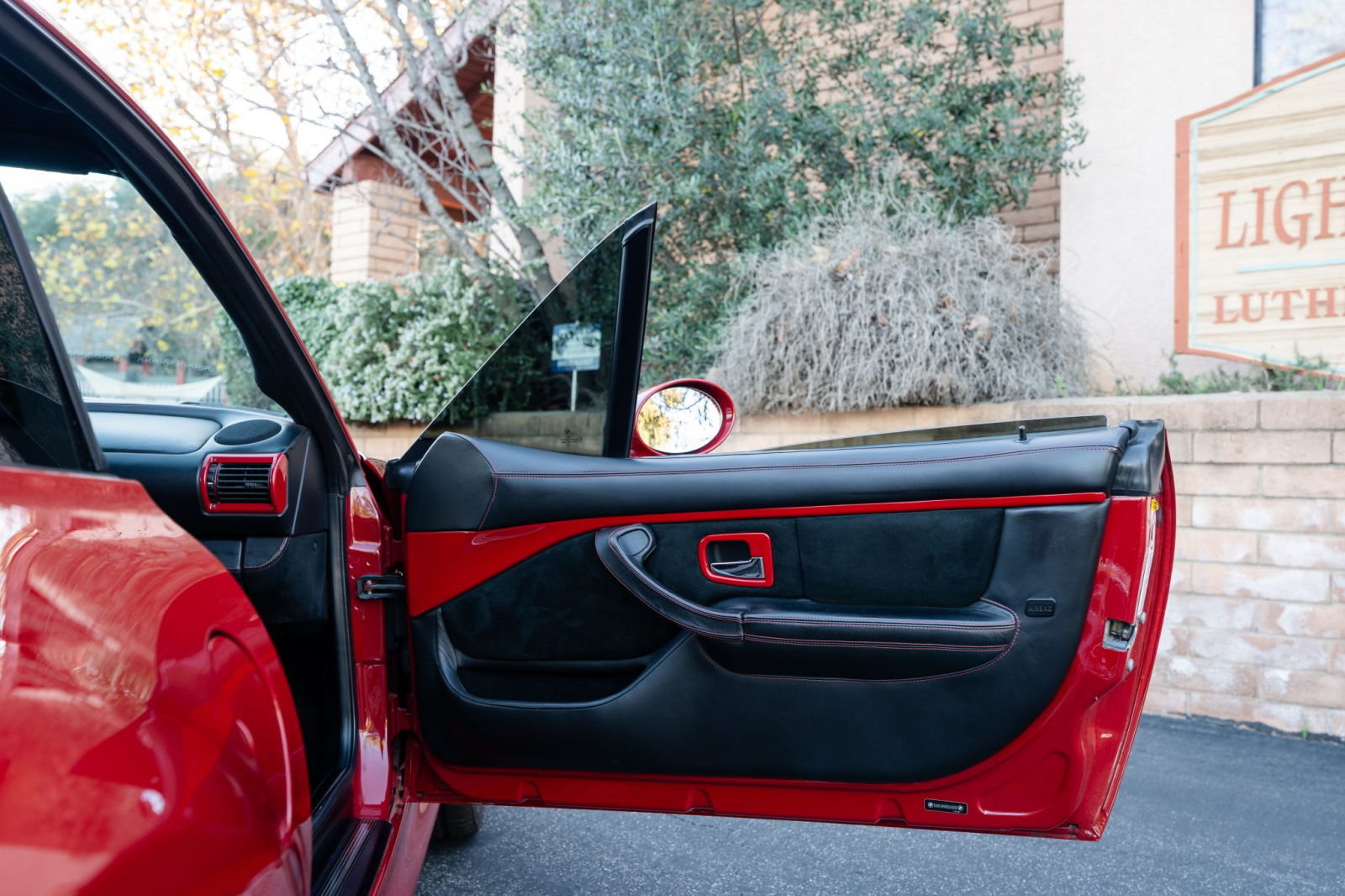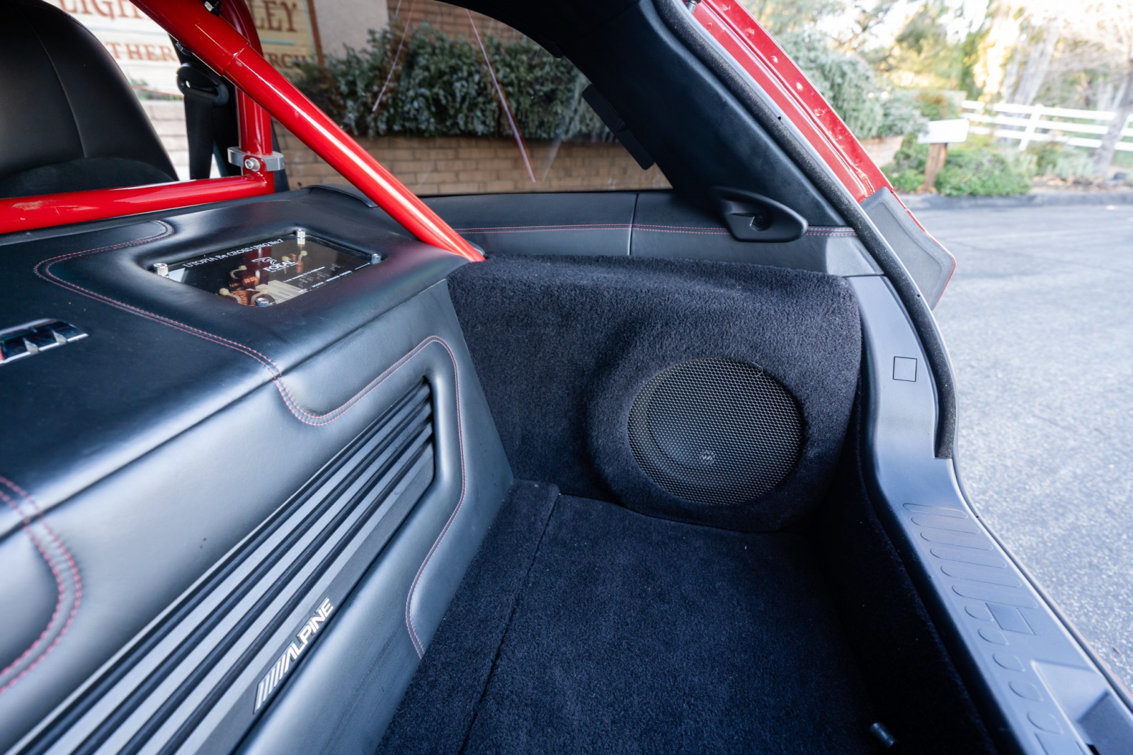 The roll bar was painted to match the body, and the interior was redone with black leather, an Alcantara headliner and inserts, and red contrast stitching. Sound insulation was added below the carpeting, and the trim was color-matched to the exterior.