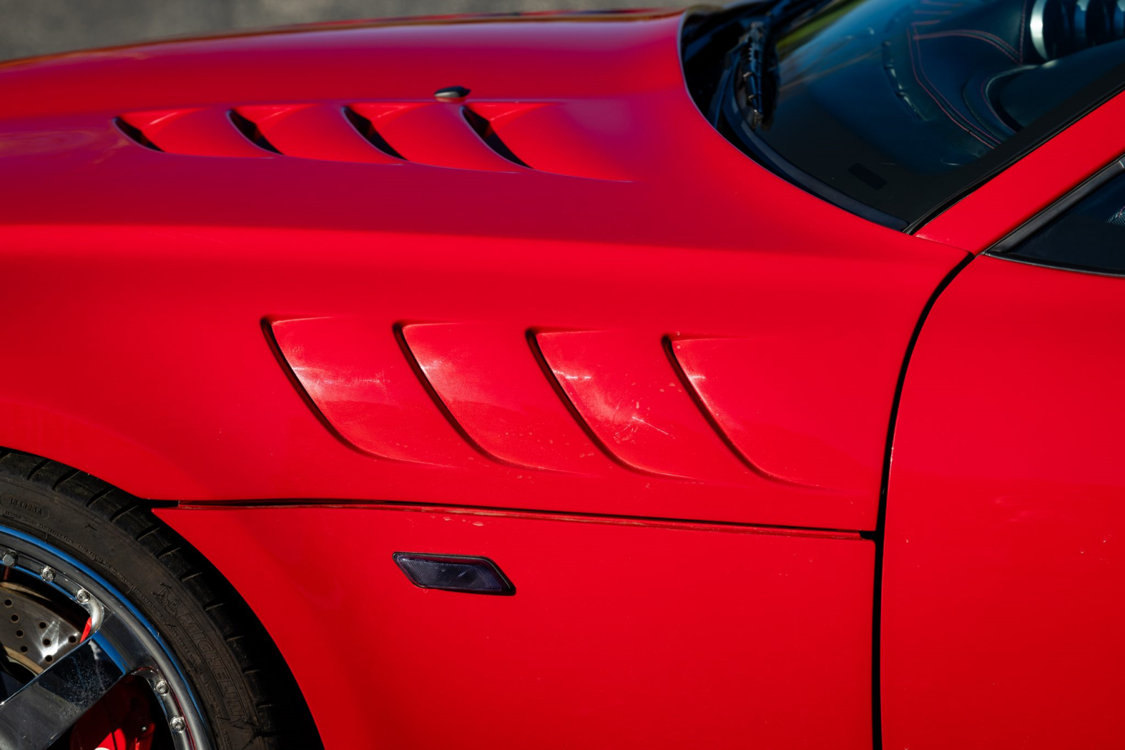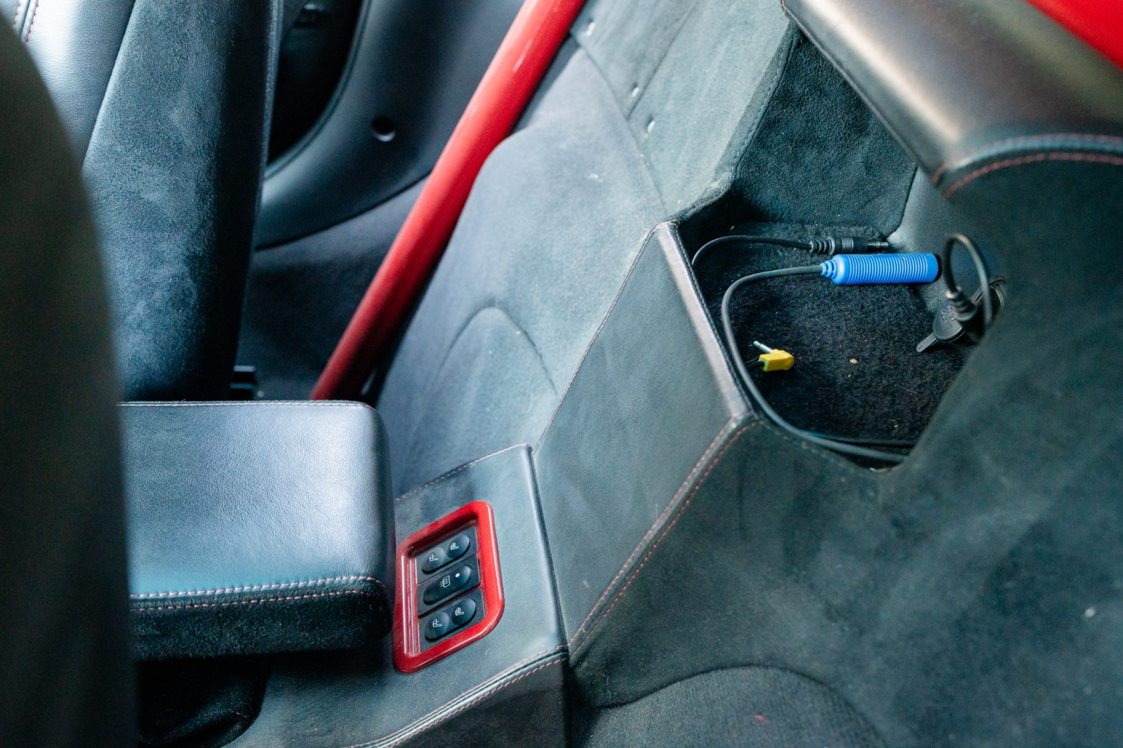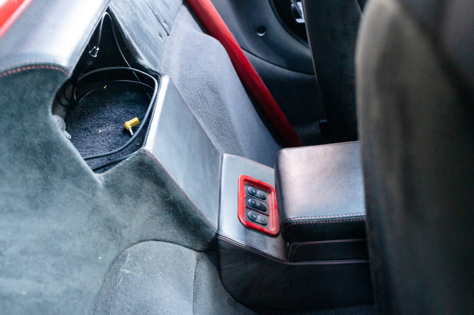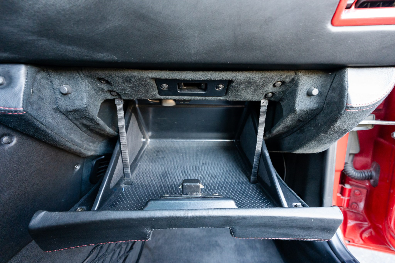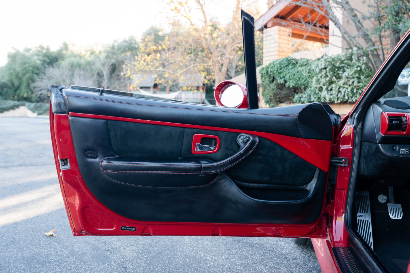 The roll bar was painted to match the body, and the interior was redone with black leather, an Alcantara headliner and inserts, and red contrast stitching. Sound insulation was added below the carpeting, and the trim was color-matched to the exterior.