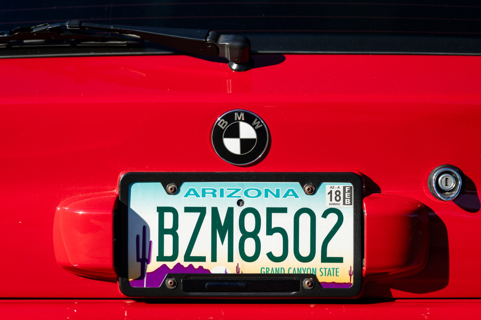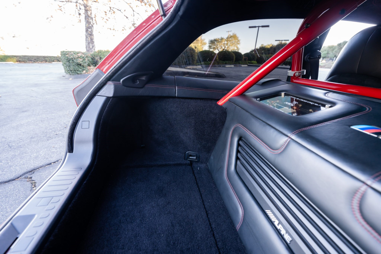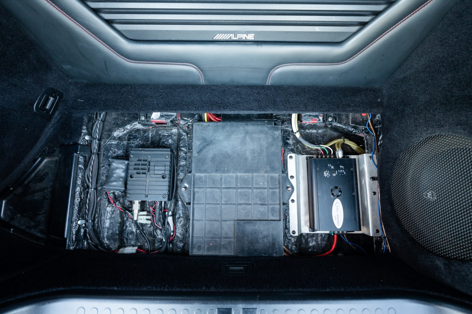 The car was fitted with a Hartge vented carbon-fiber hood and a Hamann front and rear spoilers before it was repainted its factory shade of Imola Red. A flush-mount reverse camera is integrated into the rear plate, and the factory antenna was removed and the hole was filled. HID headlights have been retrofitted, and fog lights were also mounted along with smoked taillights.