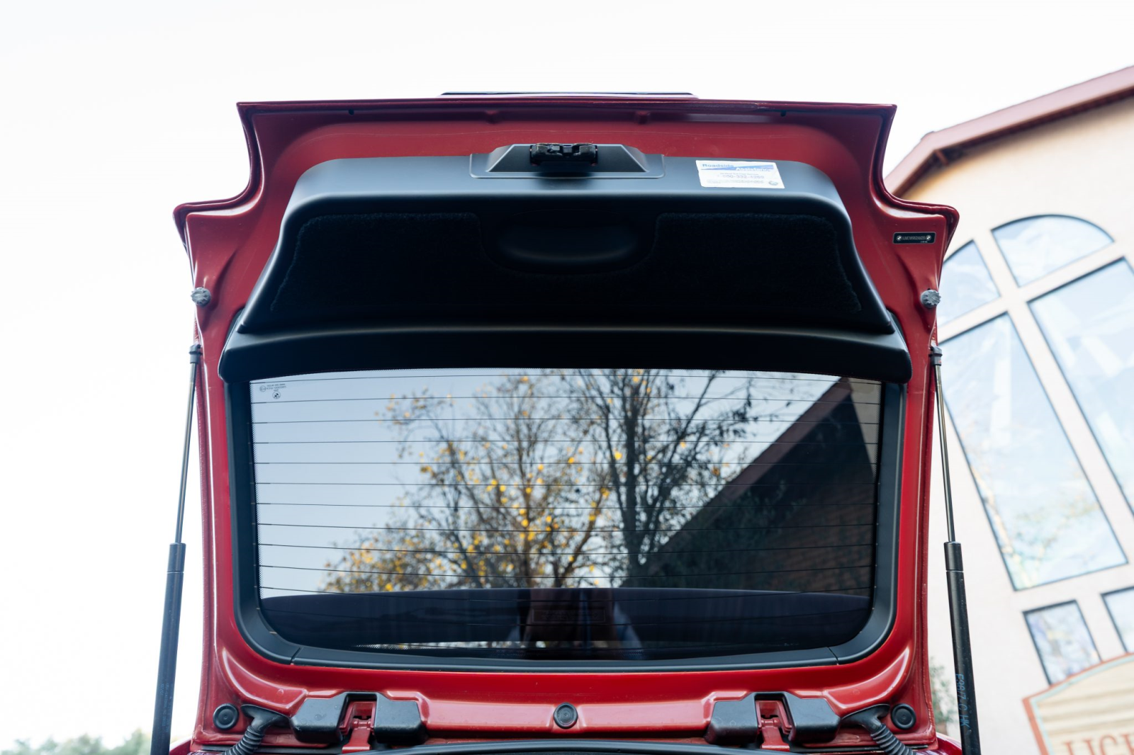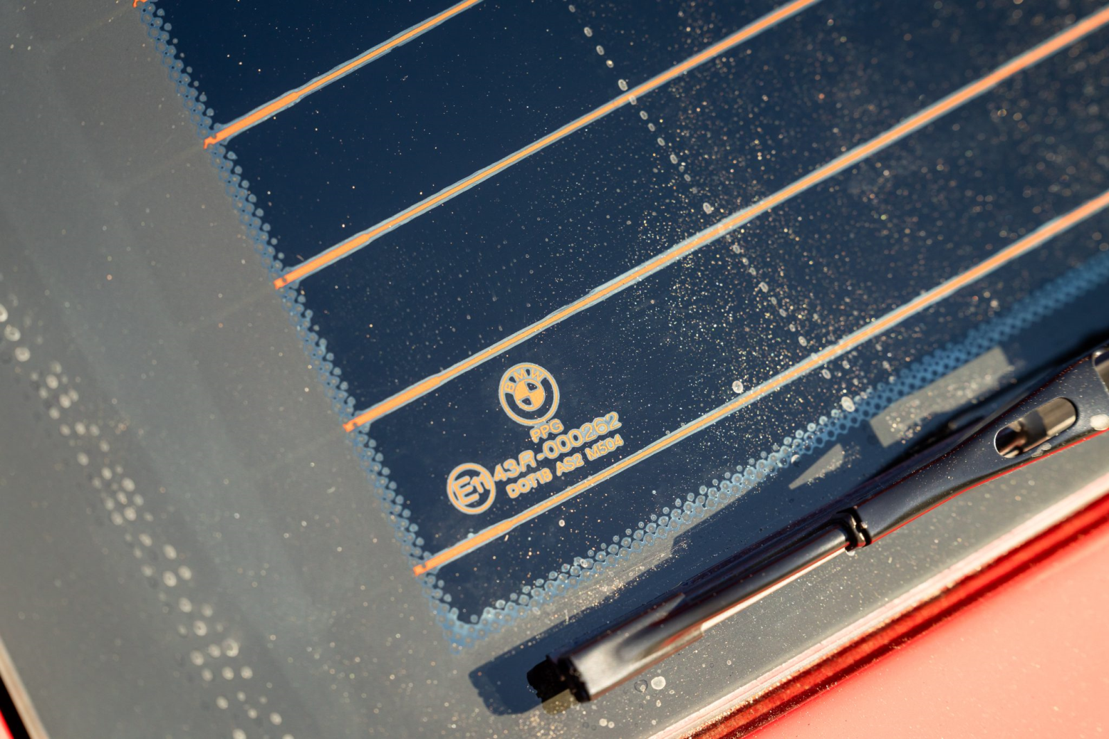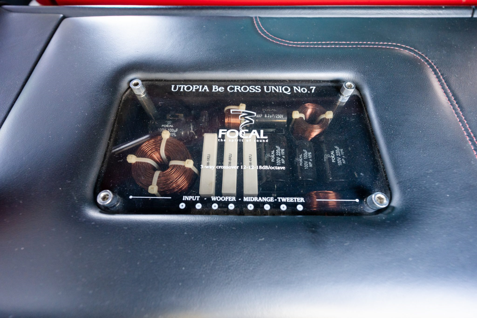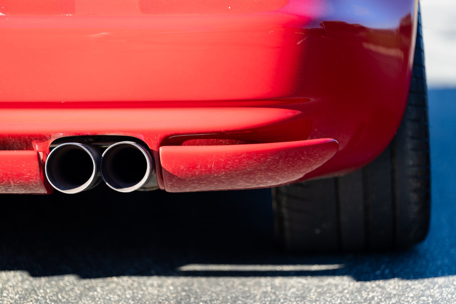 The car was fitted with a Hartge vented carbon-fiber hood and a Hamann front and rear spoilers before it was repainted its factory shade of Imola Red. A flush-mount reverse camera is integrated into the rear plate, and the factory antenna was removed and the hole was filled. HID headlights have been retrofitted, and fog lights were also mounted along with smoked taillights.