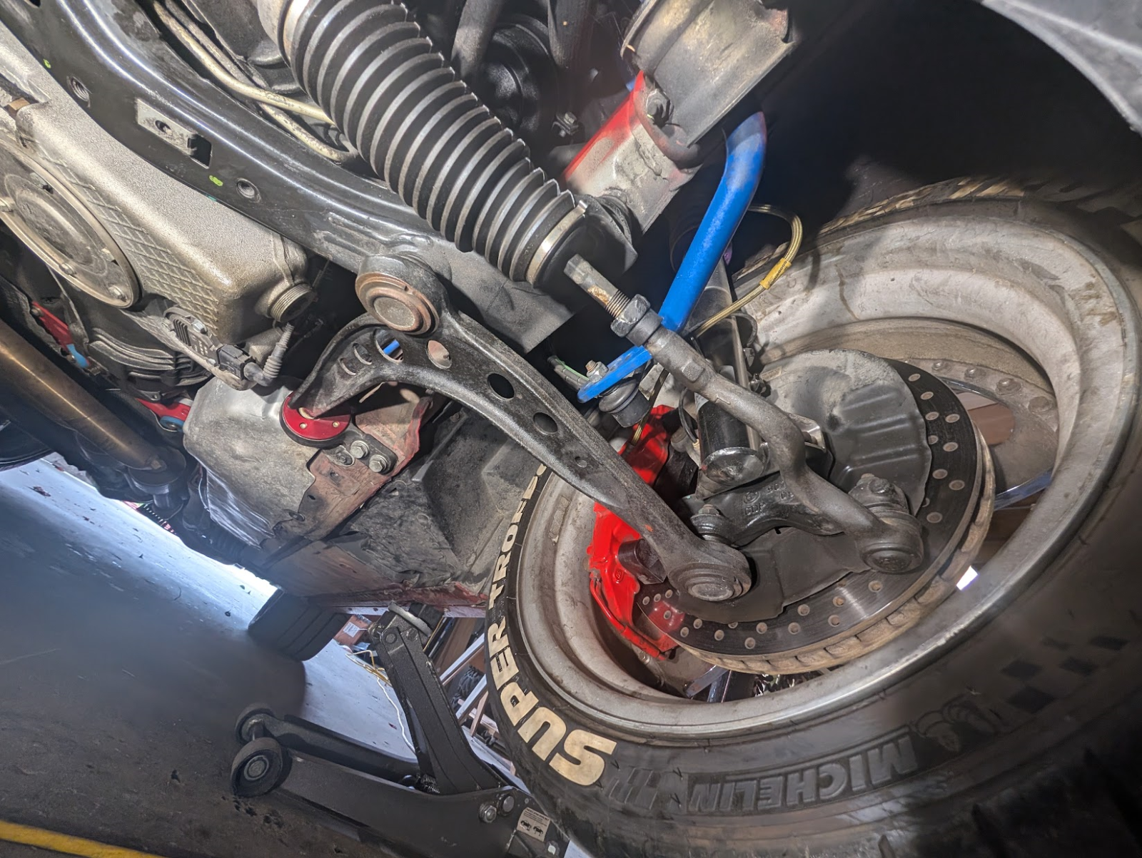 The suspension has been modified with KW Variant 3 two-way adjustable coilovers, PowerGrid sway bar end links, uprated sway bars, VAC suspension bushings, and TCKline spherical rear shock mounts.