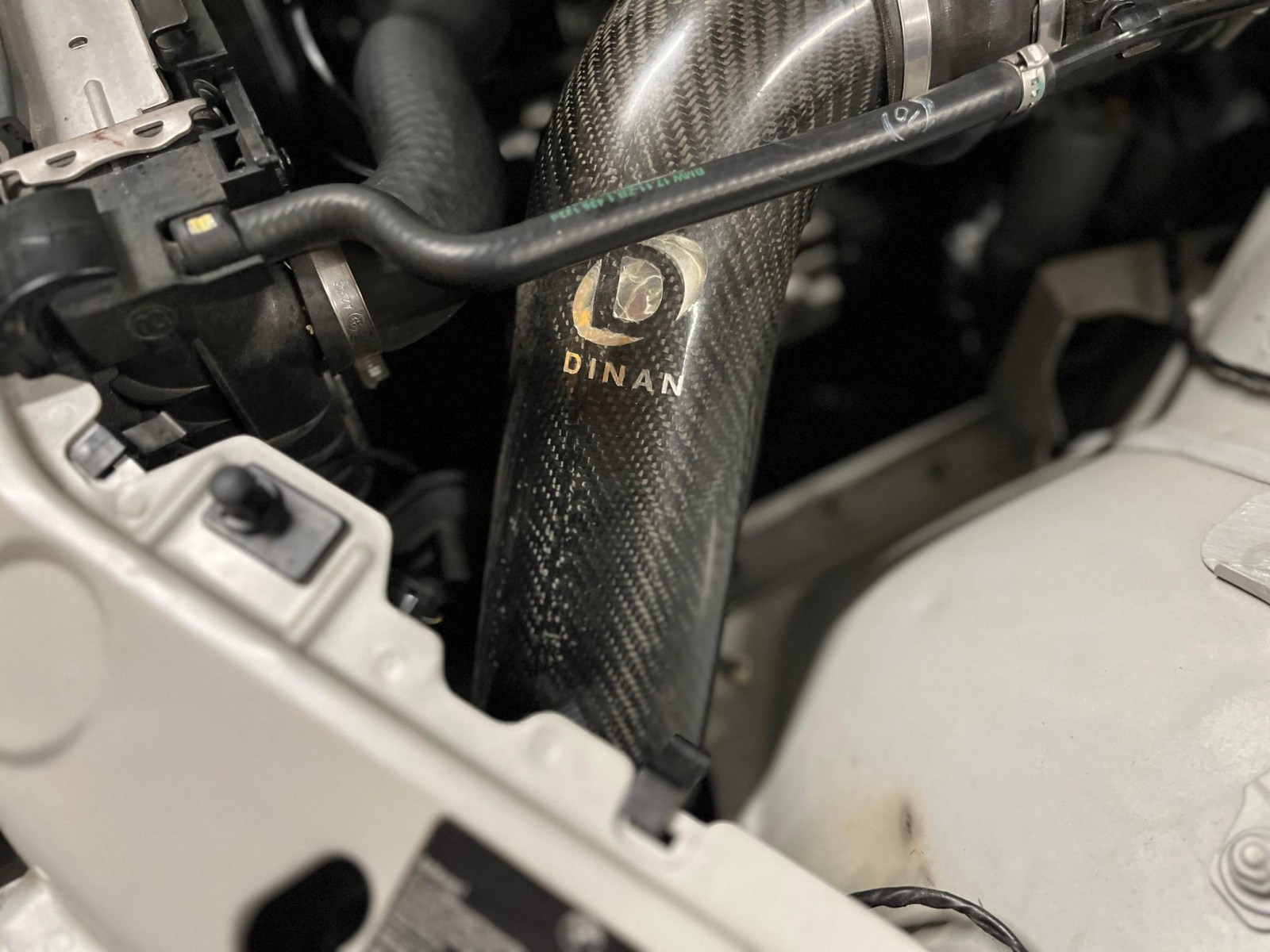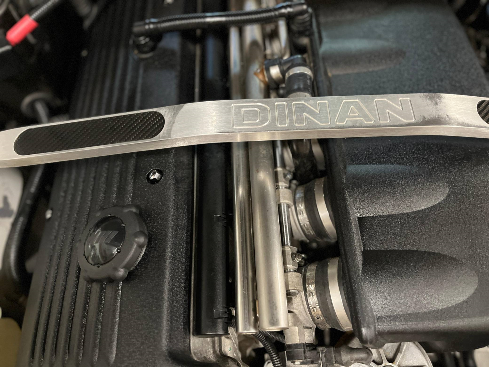 - Notable modifications reported by the seller include a Dinan air intake, a Dinan ECU tune, a Dinan front strut tower brace, an Alpine head unit, AC Schnitzer pedal covers, and rear spoilers.