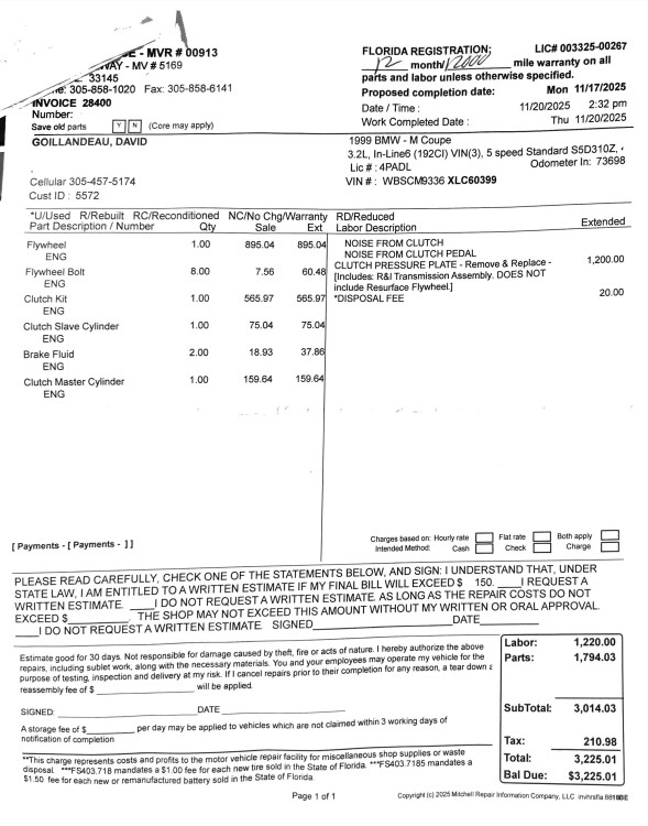 Z3 M COUPE - S52 Spent most of her life in NY state and last 2,5 years in South Florida Original stick shifter available Clutch done in NOV 2025 (3.2k - invoice available) AC cold and redone 6 months ago (2k - invoice available) Seats and leather in great condition, minor scratches on driver s seat. No leak, very clean car, runs and drives perfectly Clean title in hand No trade - serious buyers only