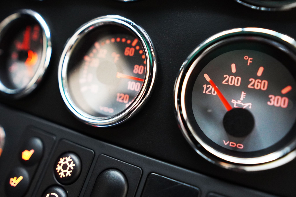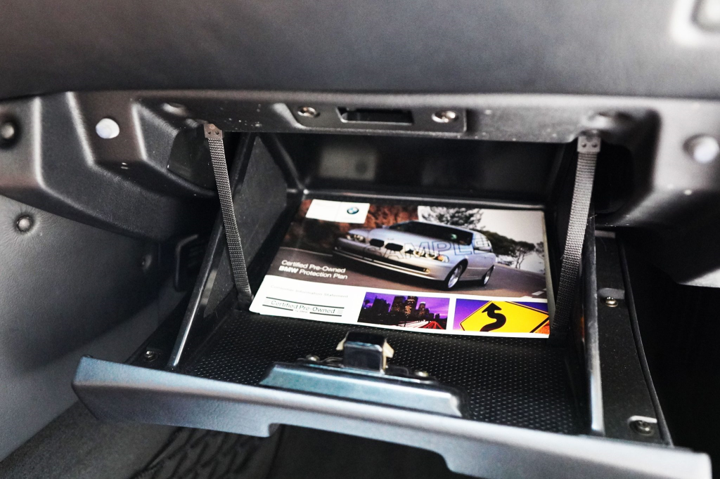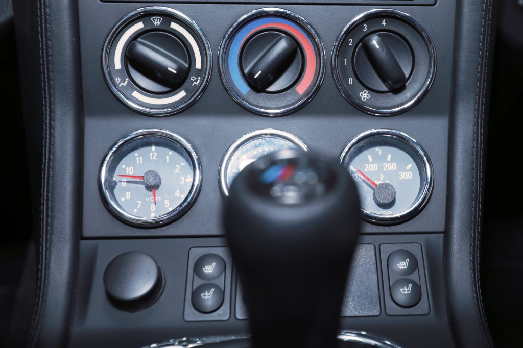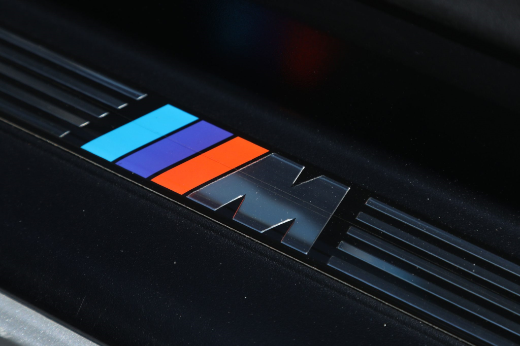 The M-branded leather-wrapped steering wheel features tri-color stitching and frames a tachometer with an 8k-rpm redline as well as a 170-mph speedometer and gauges for coolant temperature and fuel level. The digital odometer indicates 23k miles.