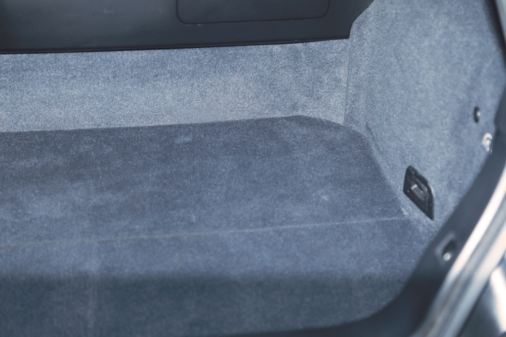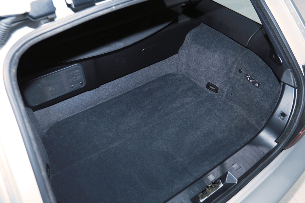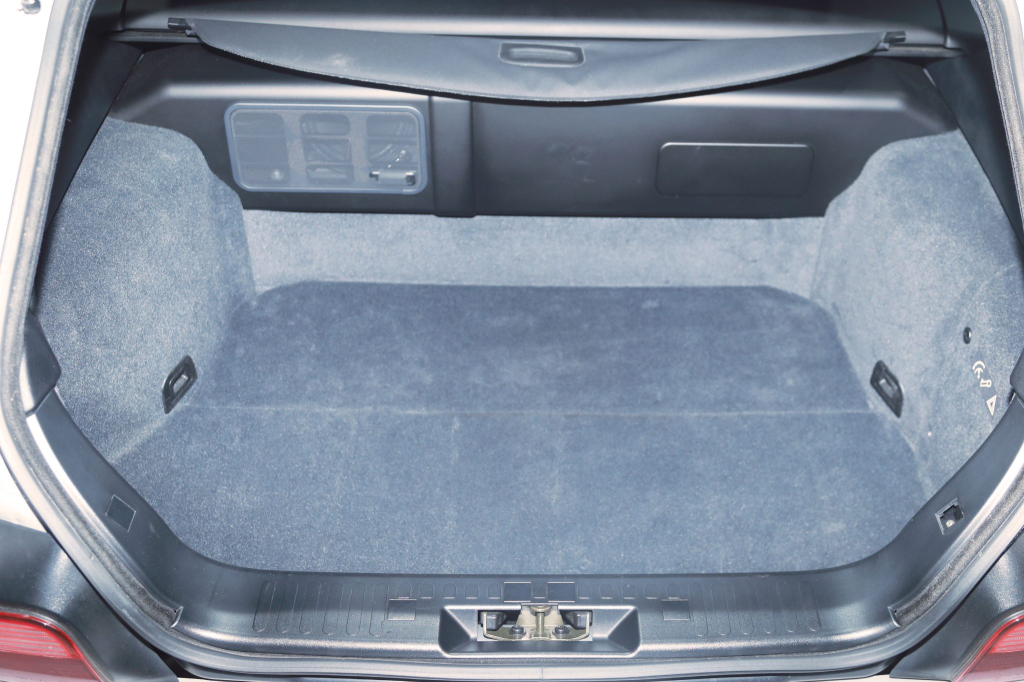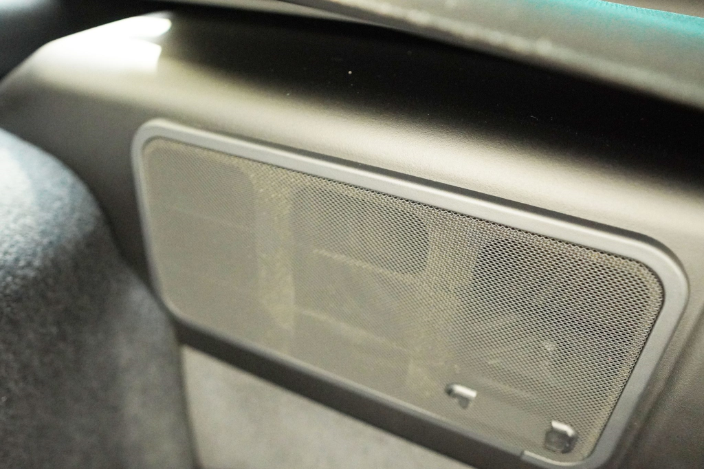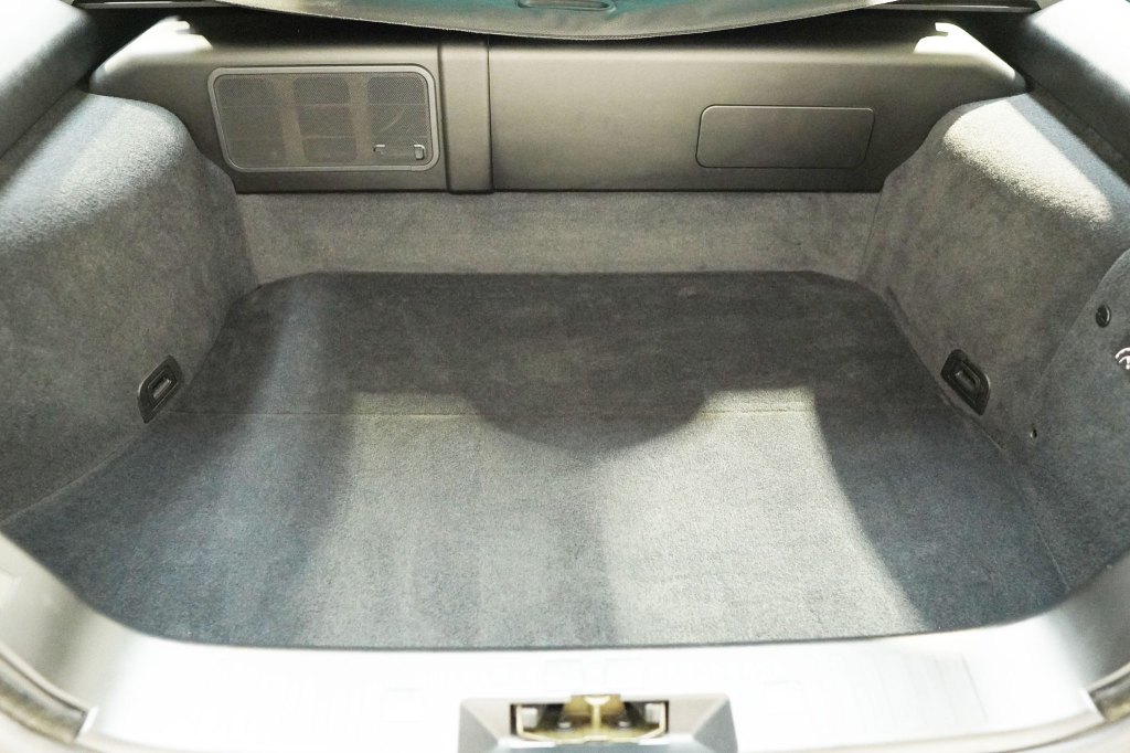 Black Nappa leather trims the heated Sport seats and extends to the center console and door panel inserts. Amenities include cruise control, a CD stereo, and a Harman Kardon sound system. The speaker grille in the rear cargo area has a damaged Harman Kardon emblem.