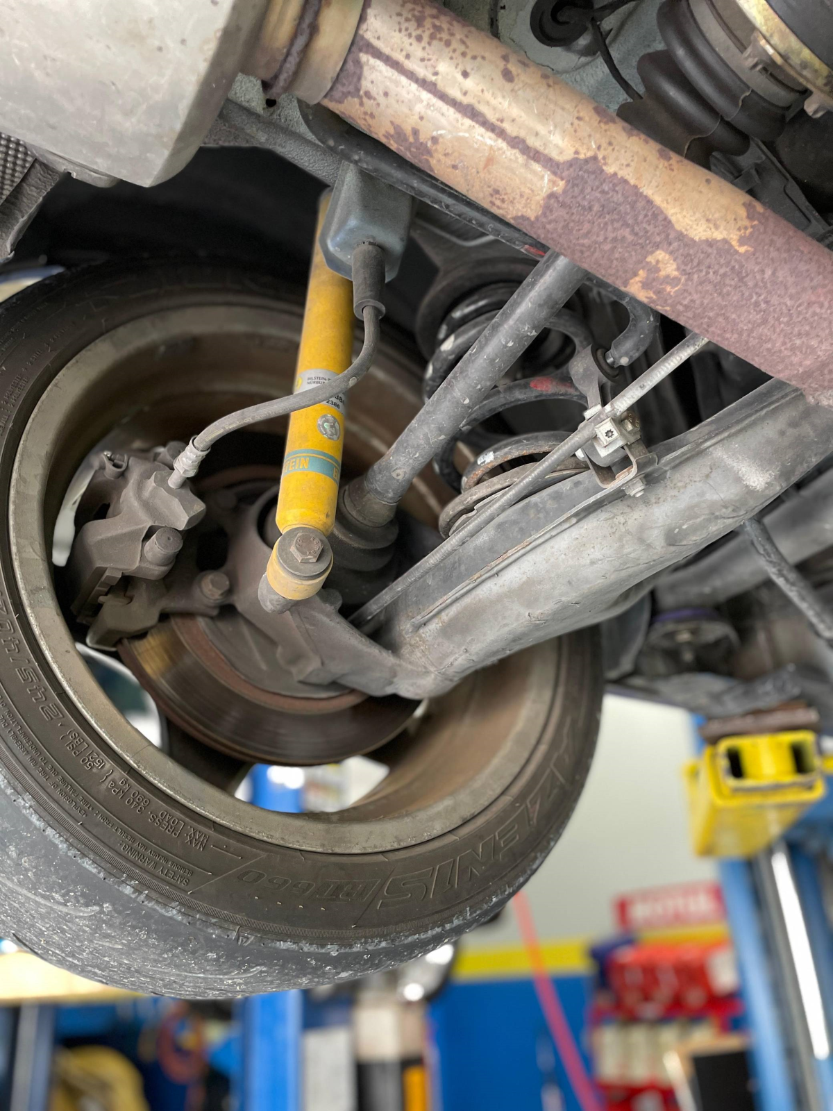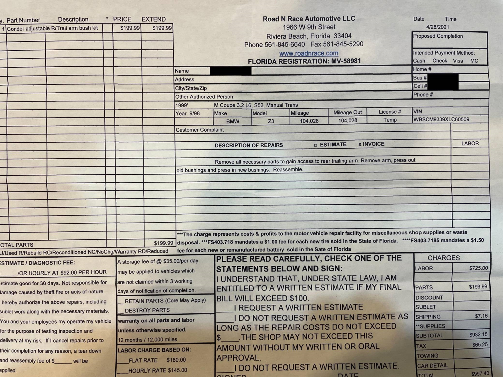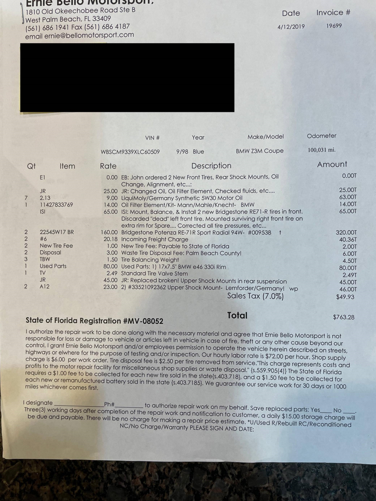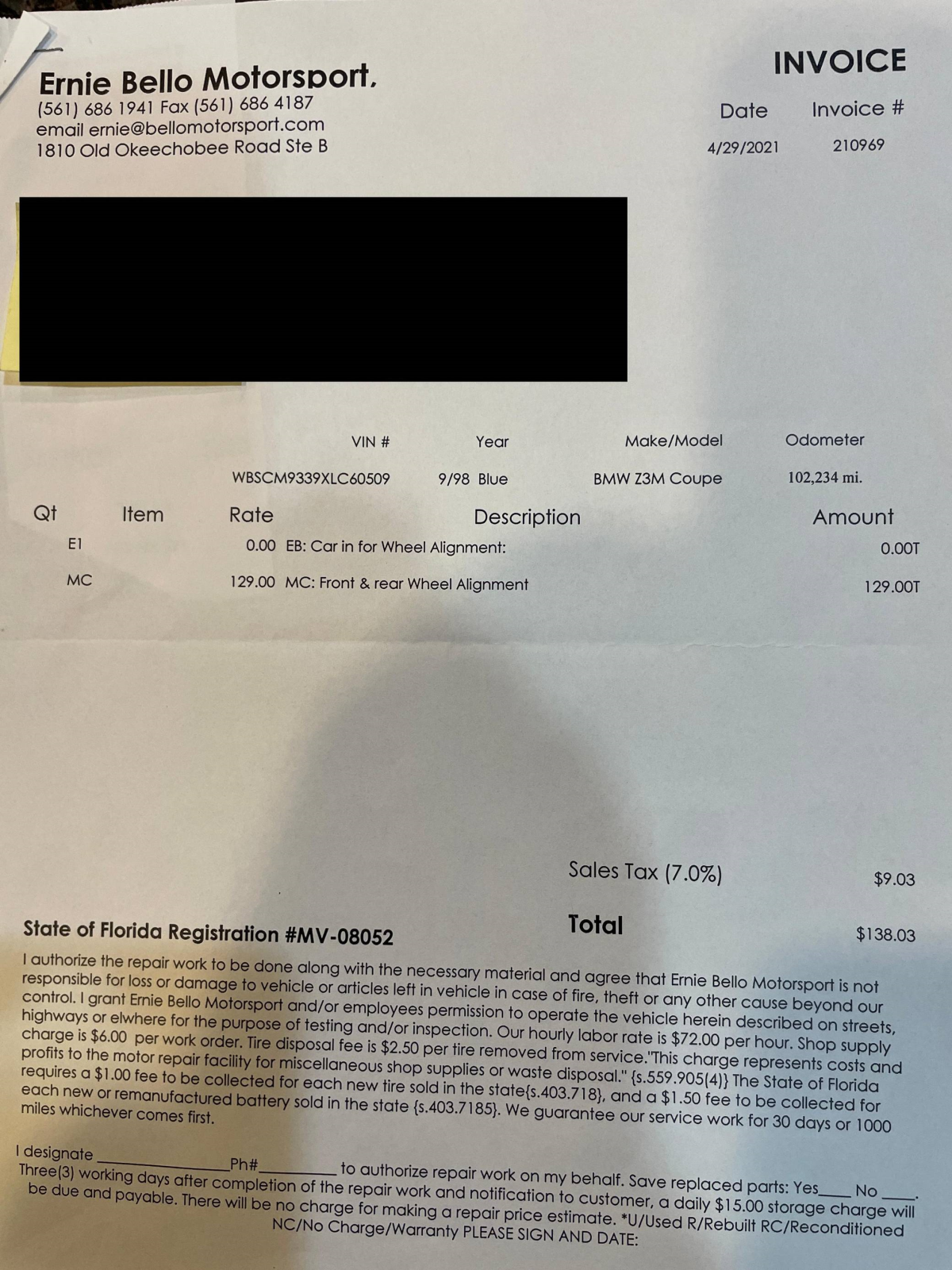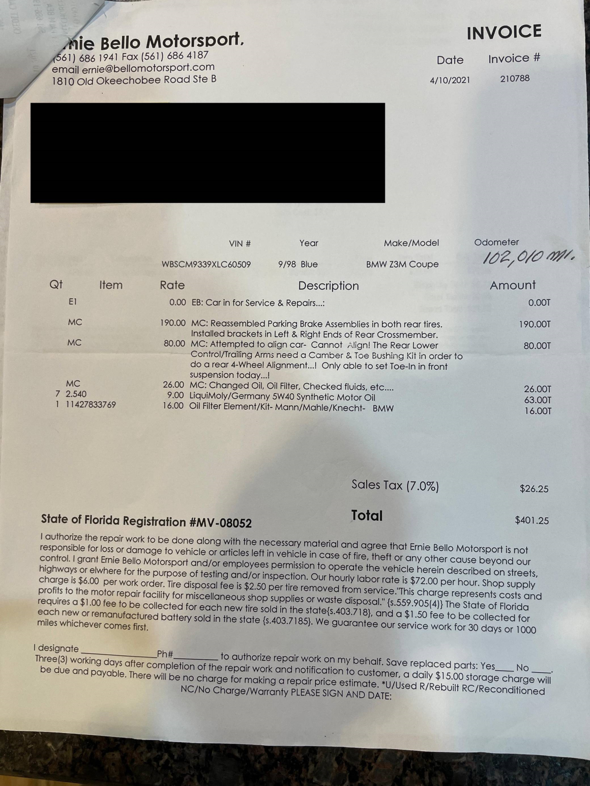 - April 2021: Four-wheel alignment performed, rear trailing arm bushings replaced, parking brake assemblies repaired, engine oil and filter changed