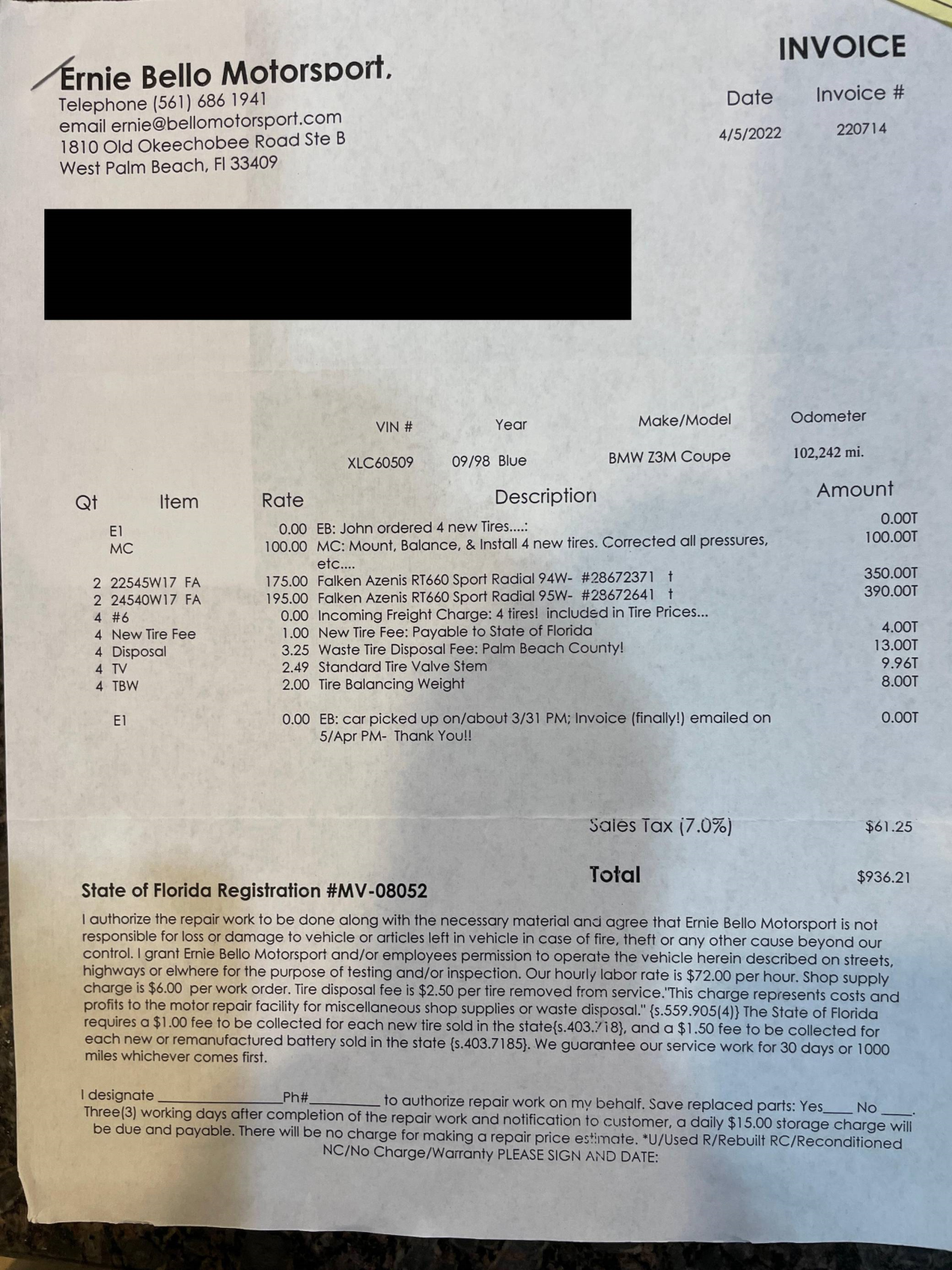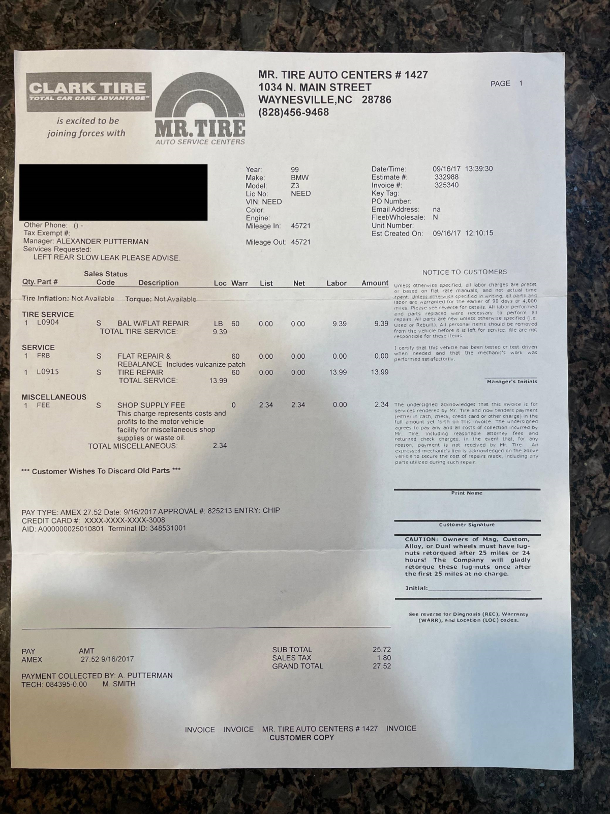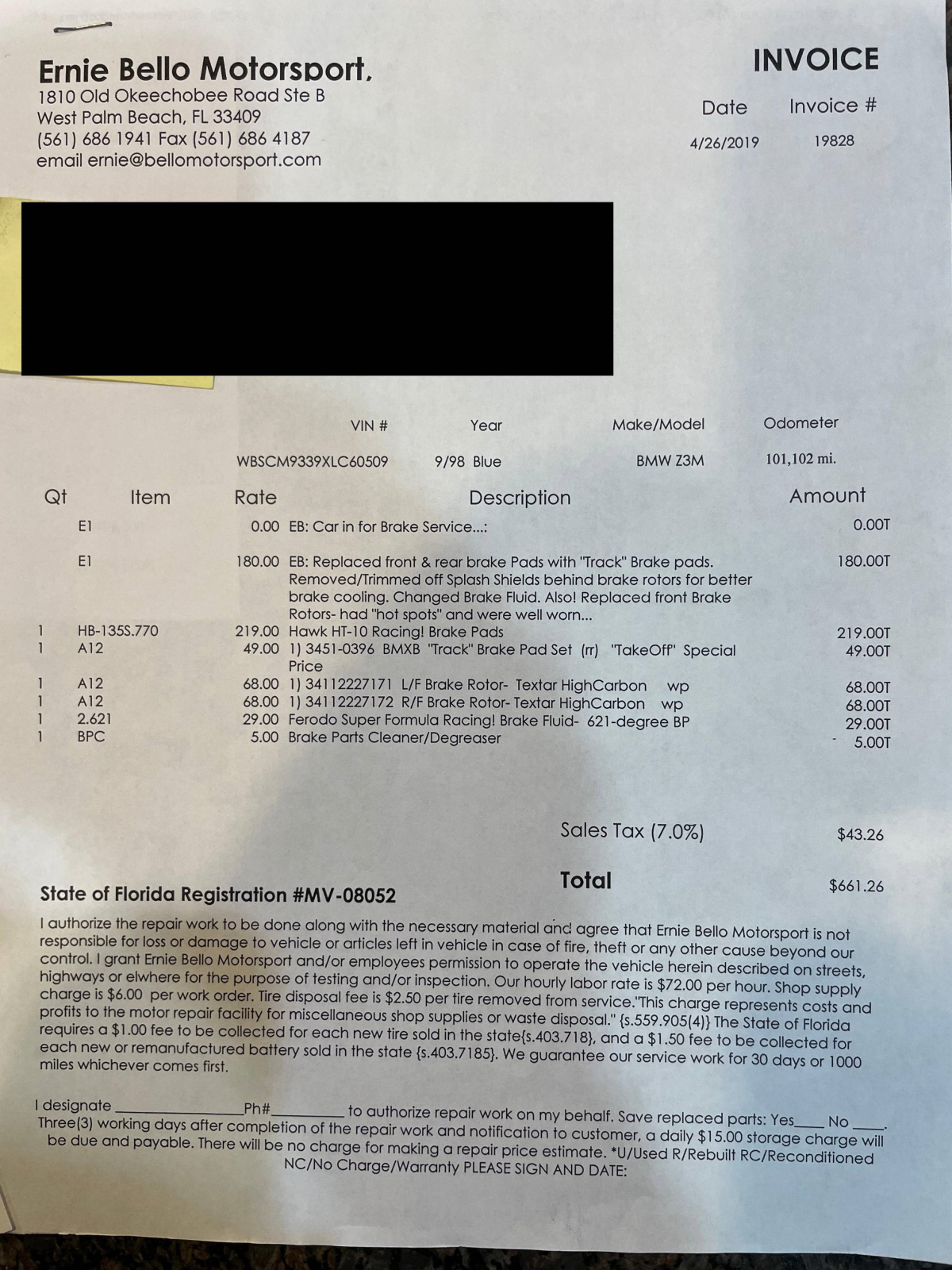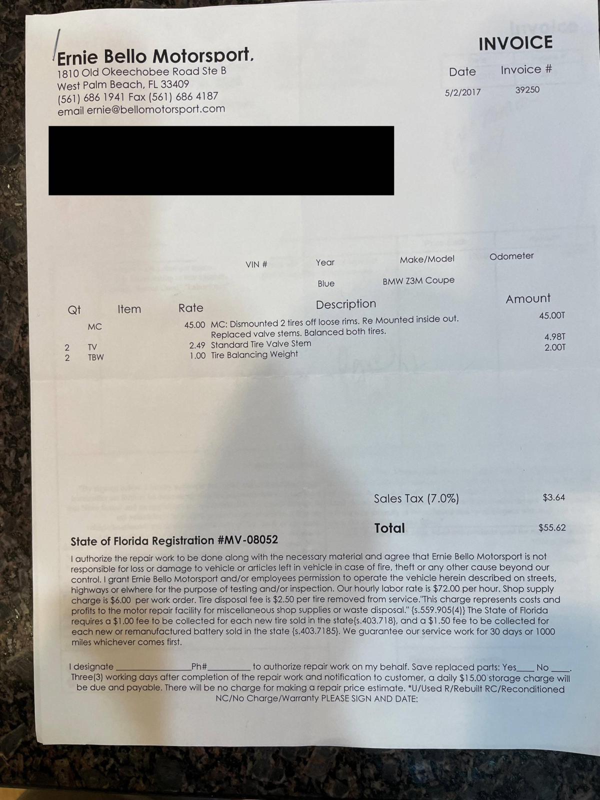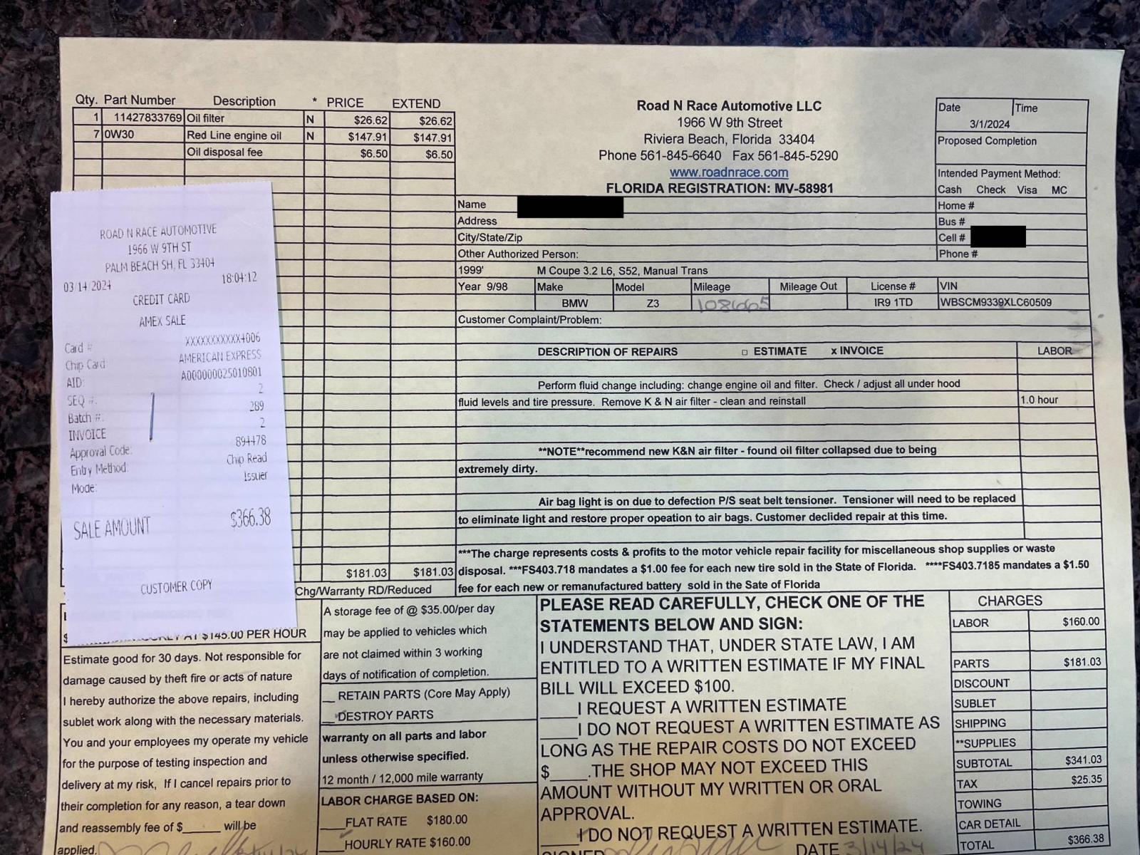 - April 2021: Four-wheel alignment performed, rear trailing arm bushings replaced, parking brake assemblies repaired, engine oil and filter changed