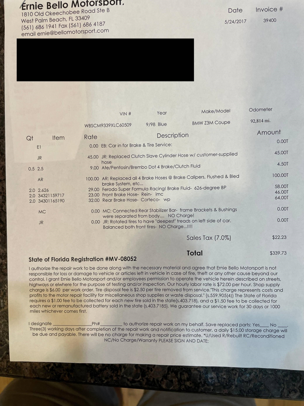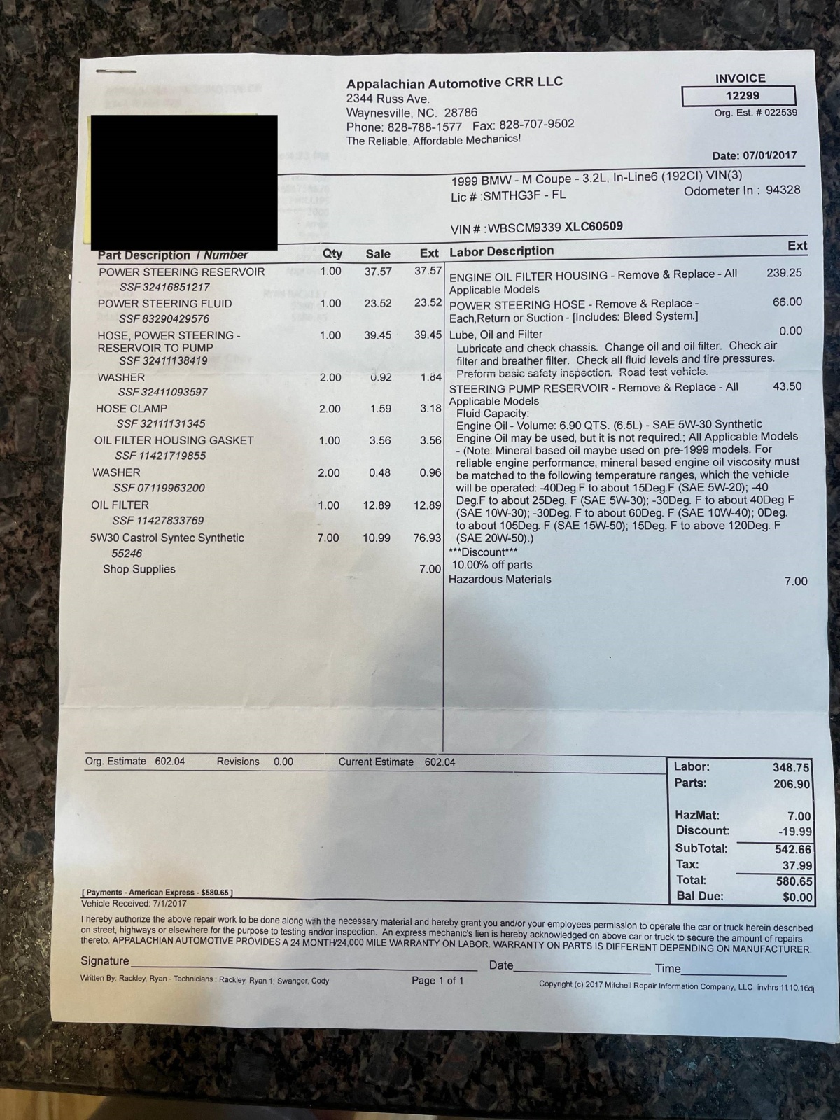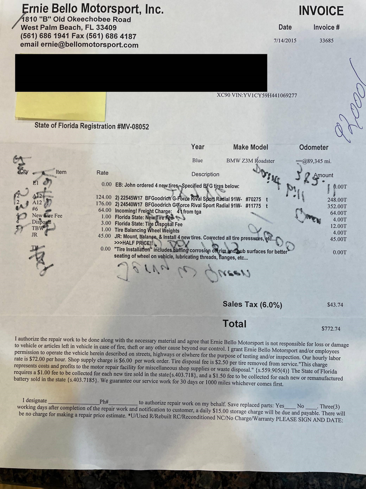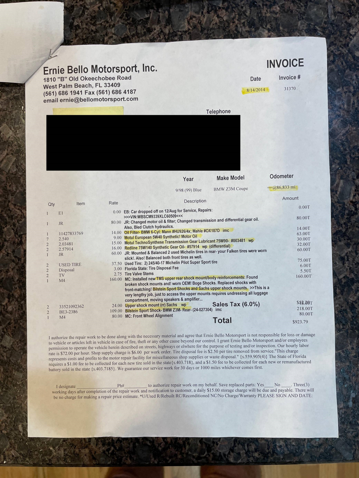 - April 2021: Four-wheel alignment performed, rear trailing arm bushings replaced, parking brake assemblies repaired, engine oil and filter changed