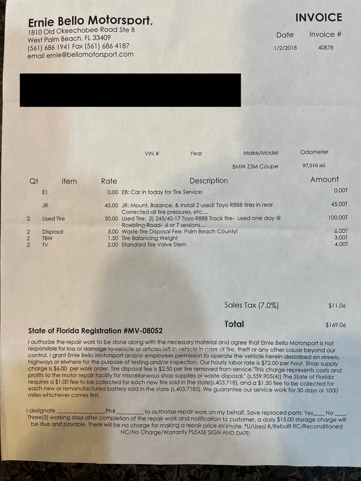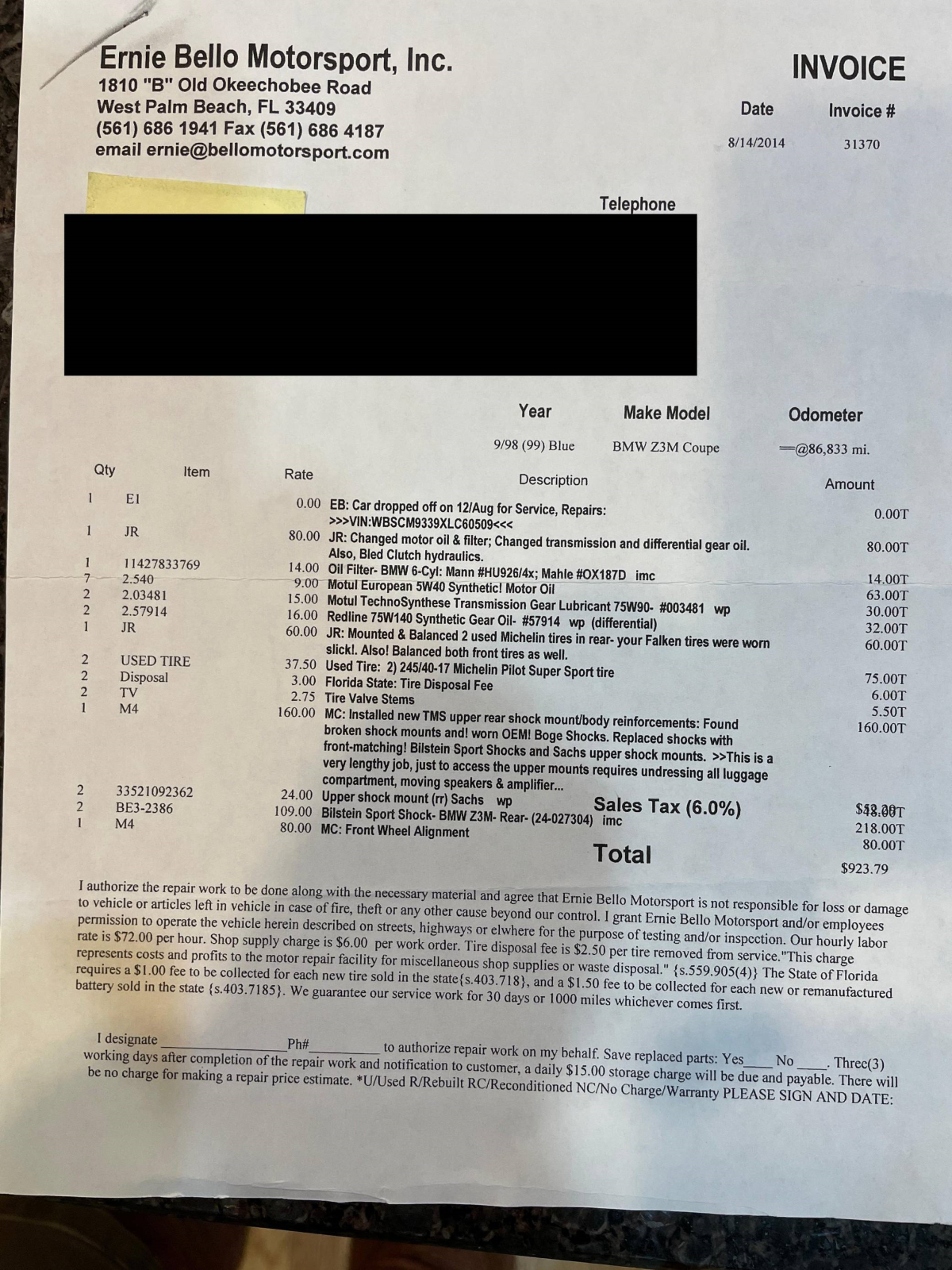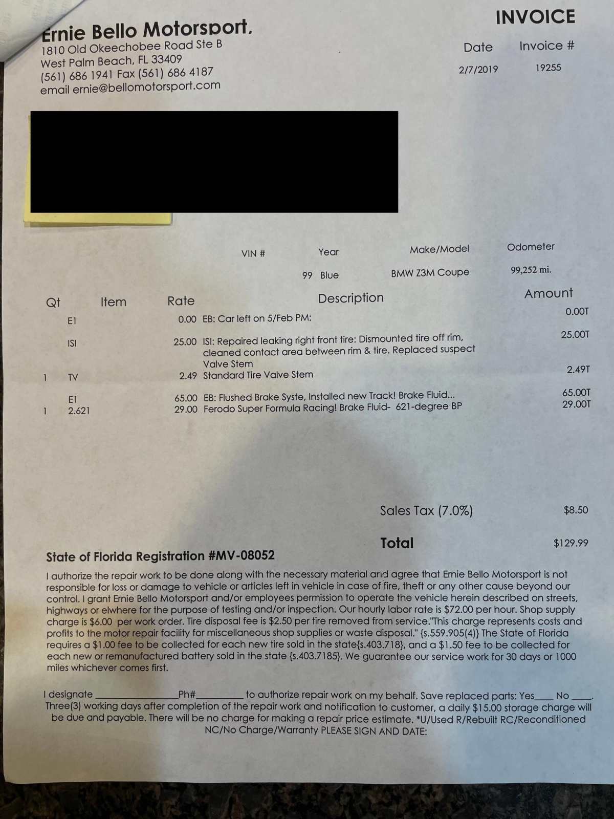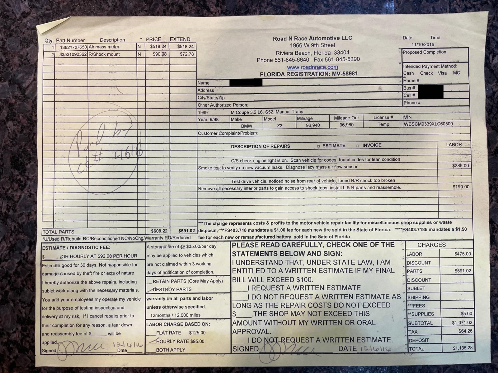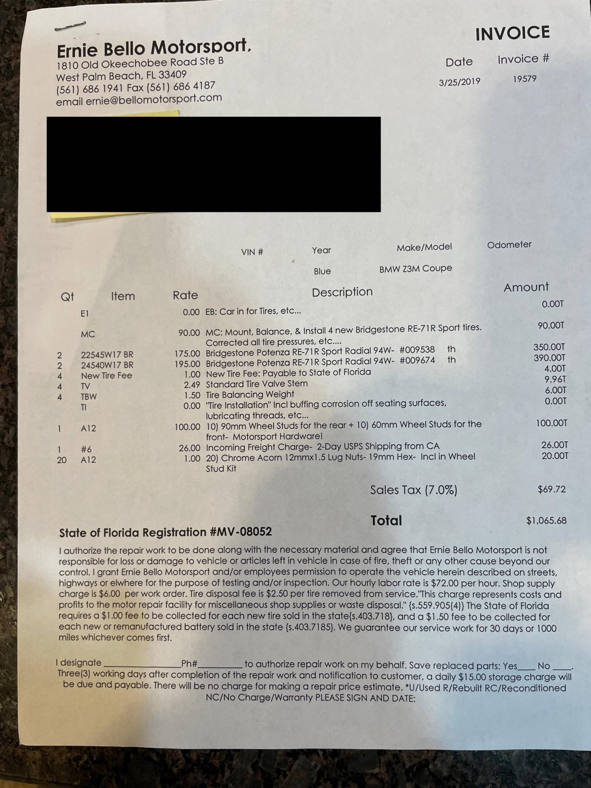 - April 2021: Four-wheel alignment performed, rear trailing arm bushings replaced, parking brake assemblies repaired, engine oil and filter changed