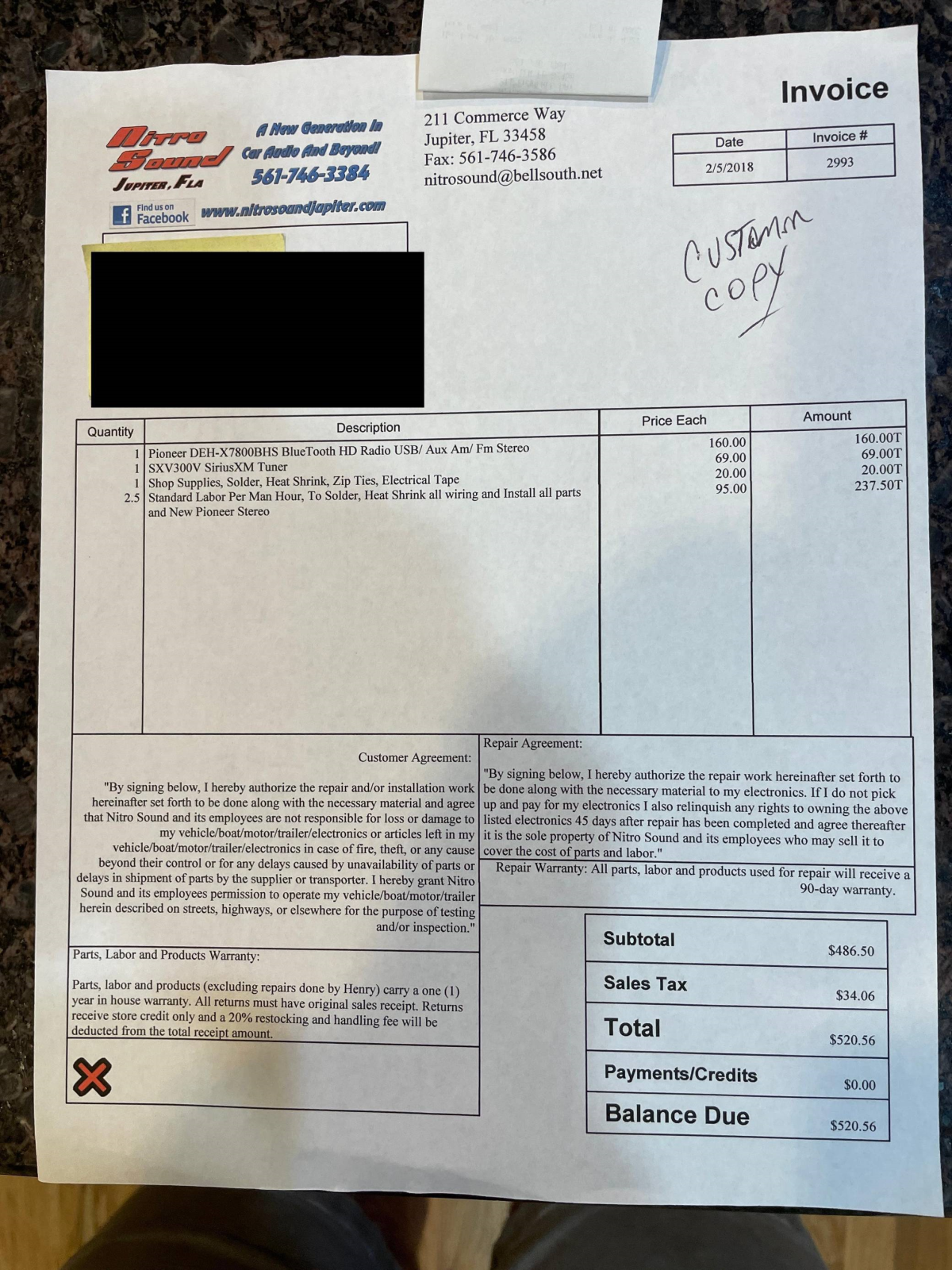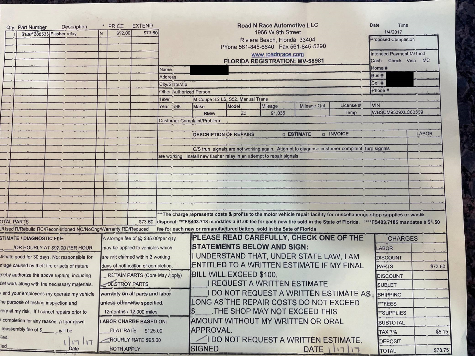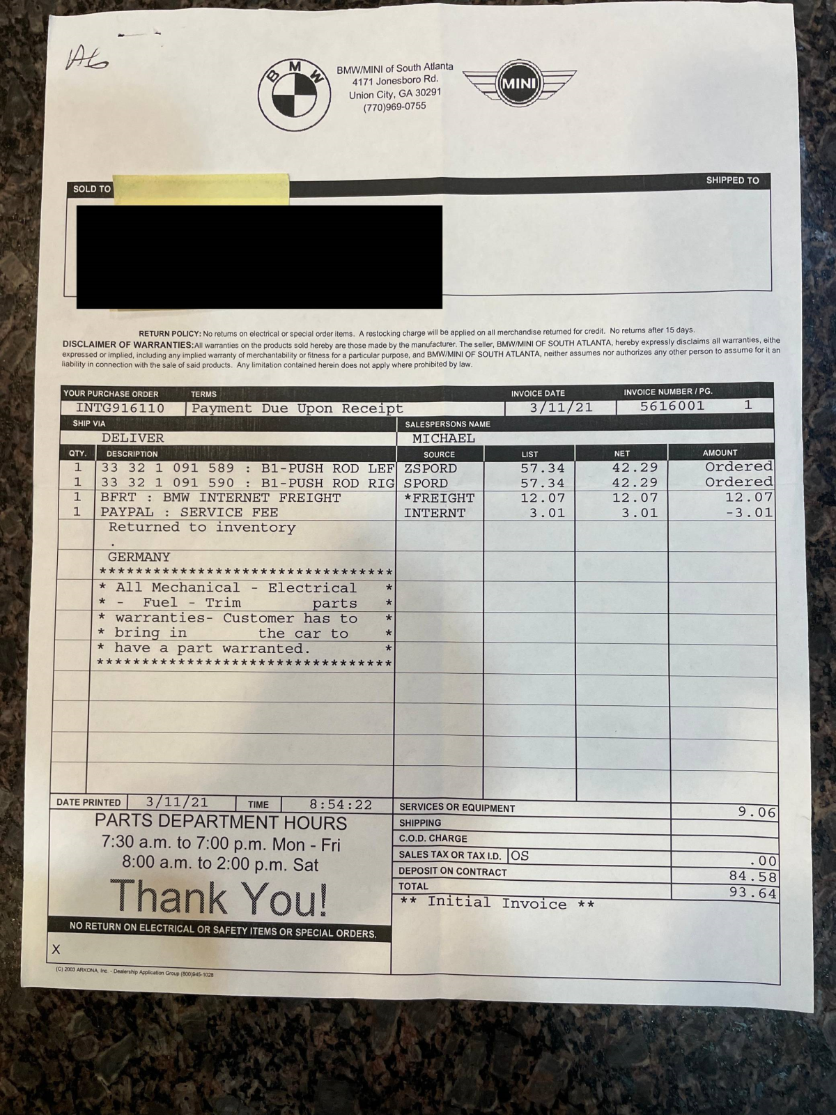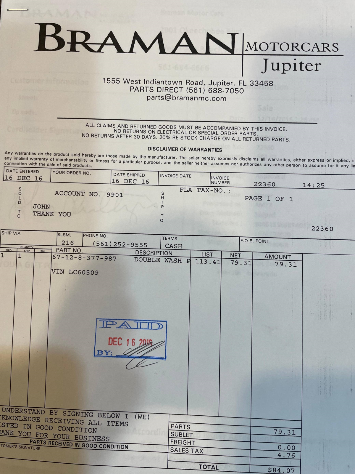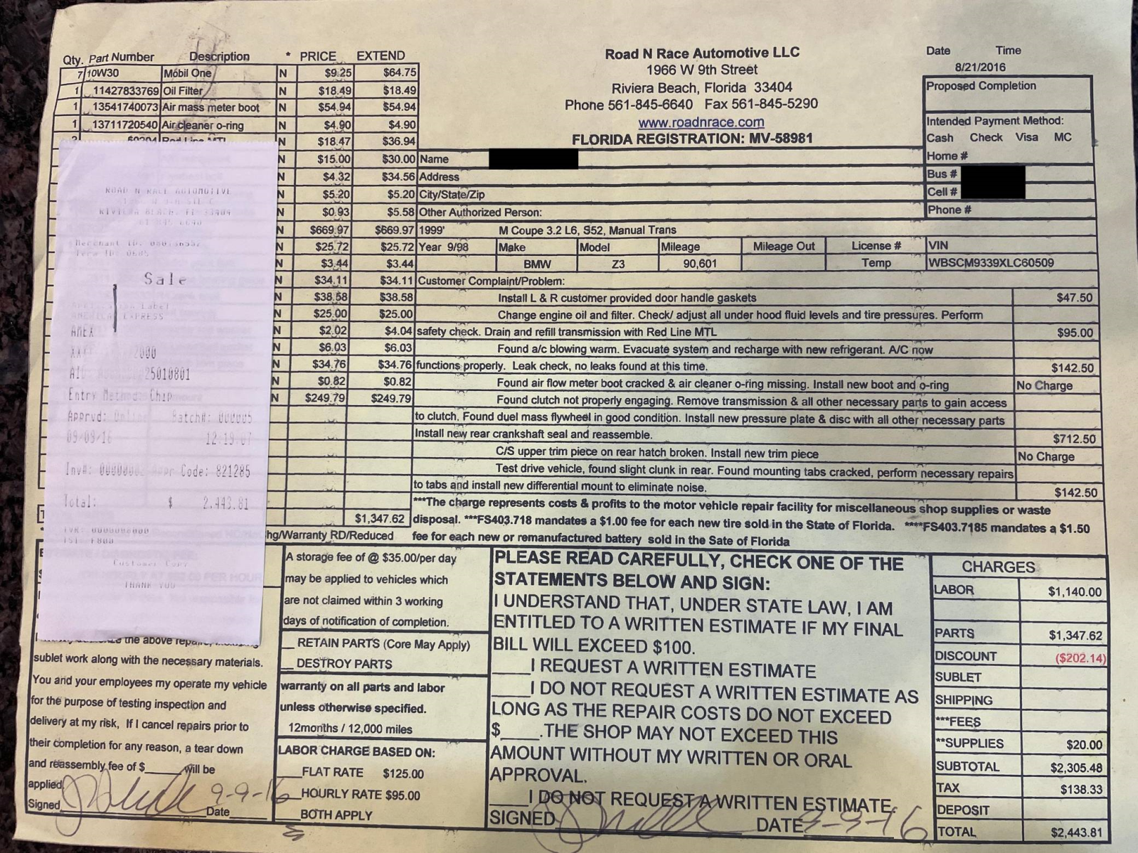 - April 2021: Four-wheel alignment performed, rear trailing arm bushings replaced, parking brake assemblies repaired, engine oil and filter changed