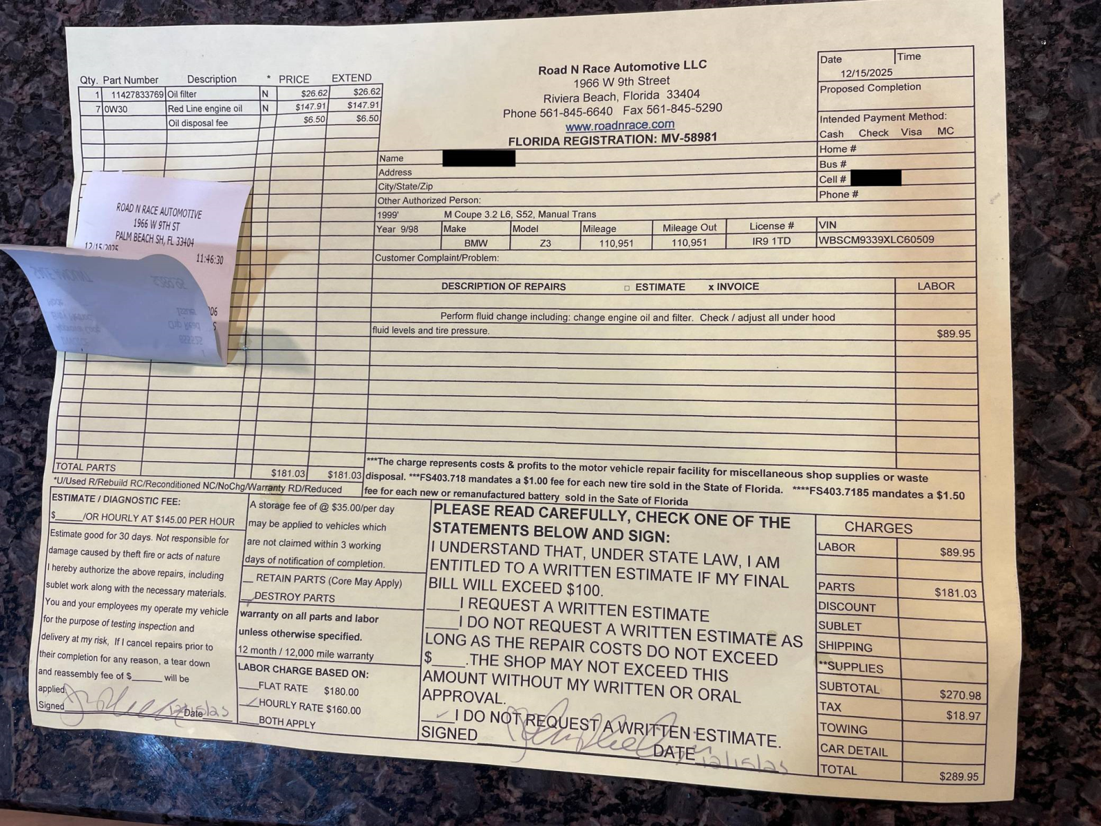 - December 2025 (110,951 miles): Engine oil and filter changed