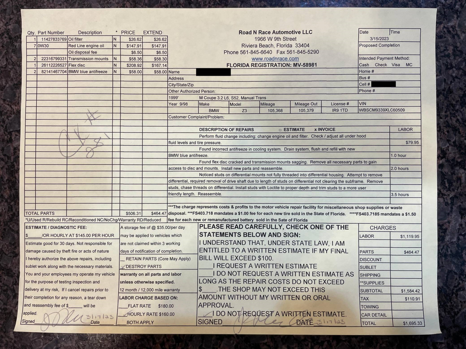 - March 2023 (105,379 miles): Engine oil and filter changed, coolant flushed, flex disc and transmission mounts replaced
