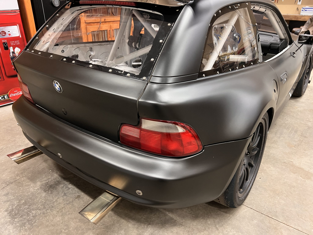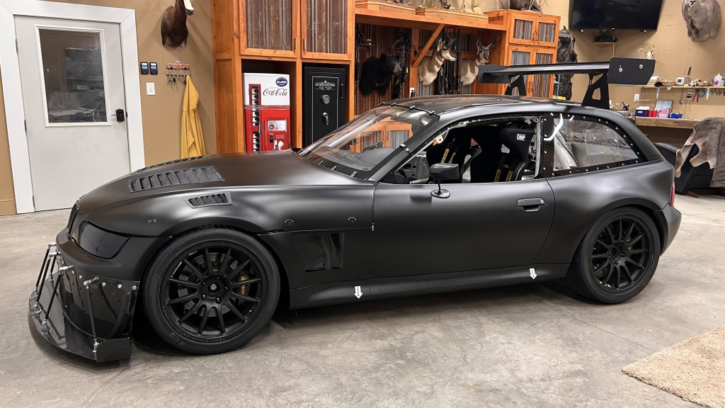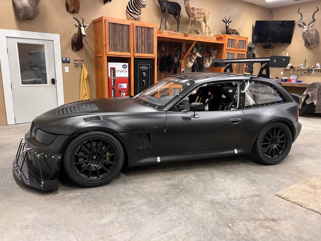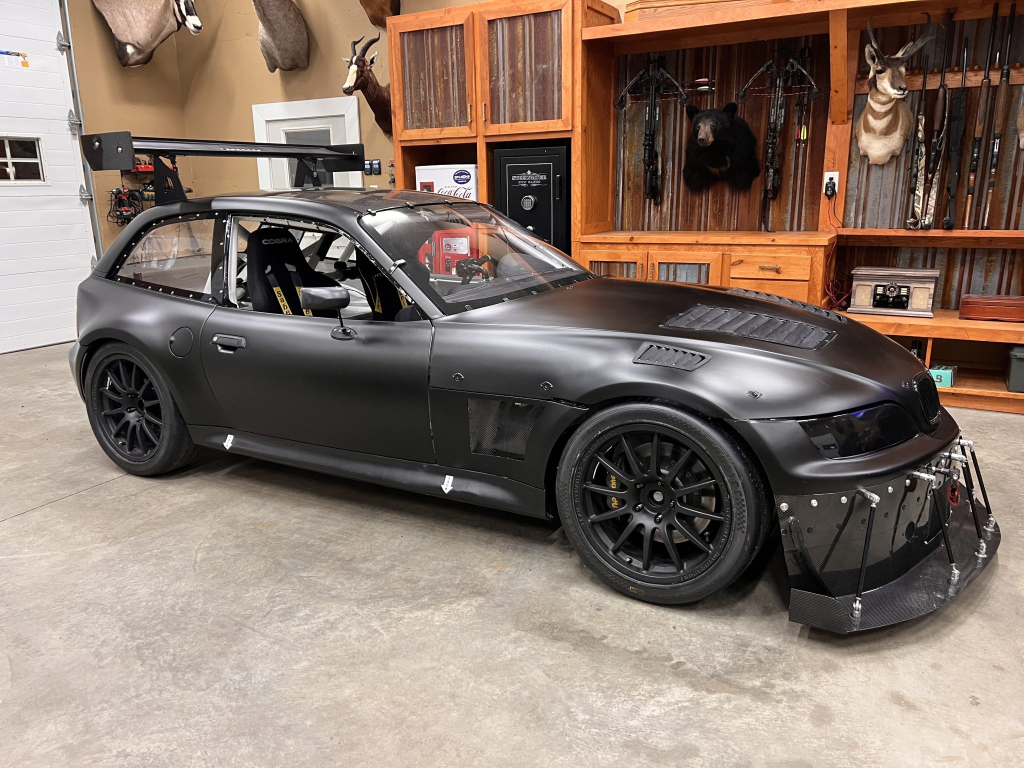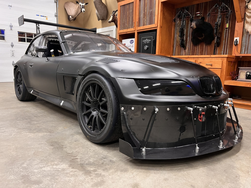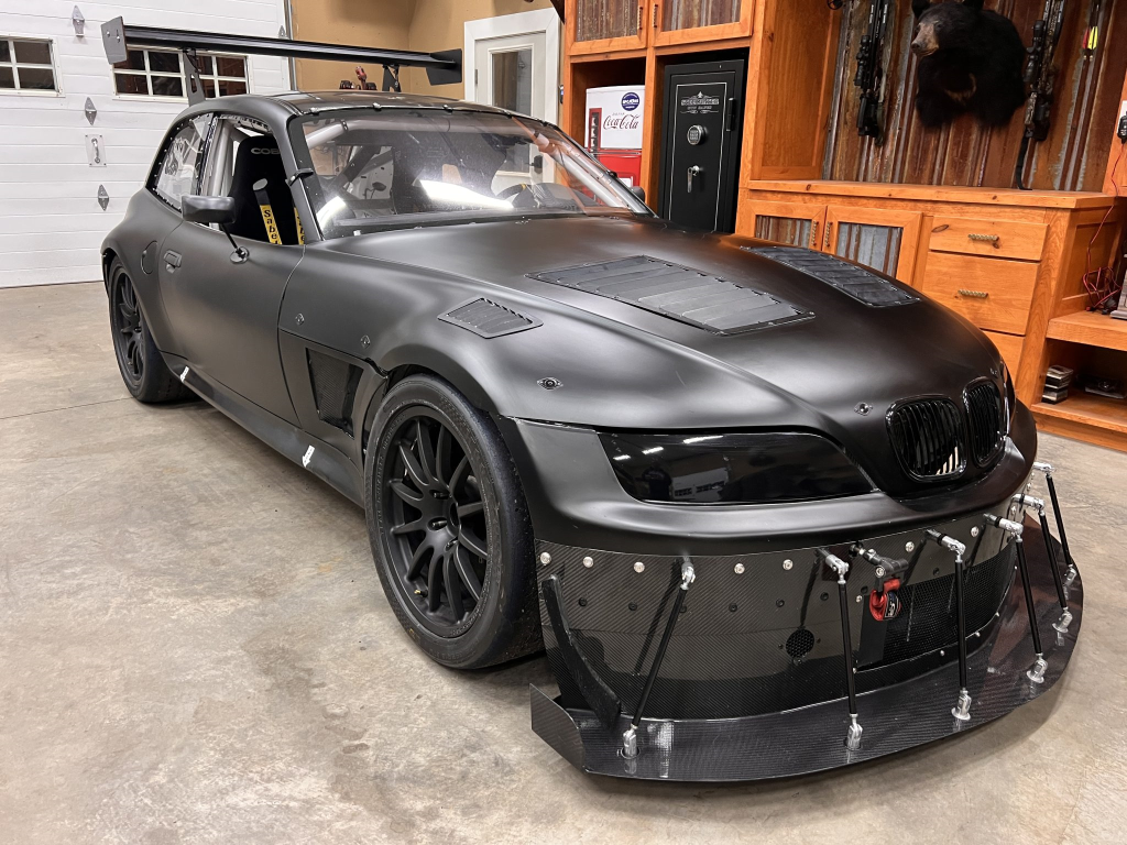 This 2001 BMW M Coupe was built into a track car by its previous owner. The chassis was stripped, stitch-welded, and fitted with carbon-fiber aerodynamic bodywork including a front splitter and rear wing in 2016. It rides on Team Dynamics Motorsport 18″ wheels and has Öhlins coilover suspension, AP Racing brake calipers, and a reinforced rear subframe. Race seats with harnesses are joined by a 12-point custom-fabricated roll cage, a Holley digital dashboard and ECU, and asteering wheel. The 427ci LS-based stroker V8 built by Horsepower Research of McKinney, Texas is fitted with a Dailey Engineering dry-sump oiling system along with a Callies CompStar crankshaft and connecting rods, and it was rebuilt following the seller’s acquisition. The car was also wrapped in matt-black vinyl, Hoosier tires were mounted, and a replacement clutch was fitted for the Tremec T56 six-speed manual transmission, along with a replacement steering wheel, 80 lb/hr injectors, starter, OMP race seat, and both harnesses. Acquired by the seller on BaT in January 2025, this track-prepared M Coupe is now offered at no reserve with spare components, records, and a Maryland title in the seller’s name.