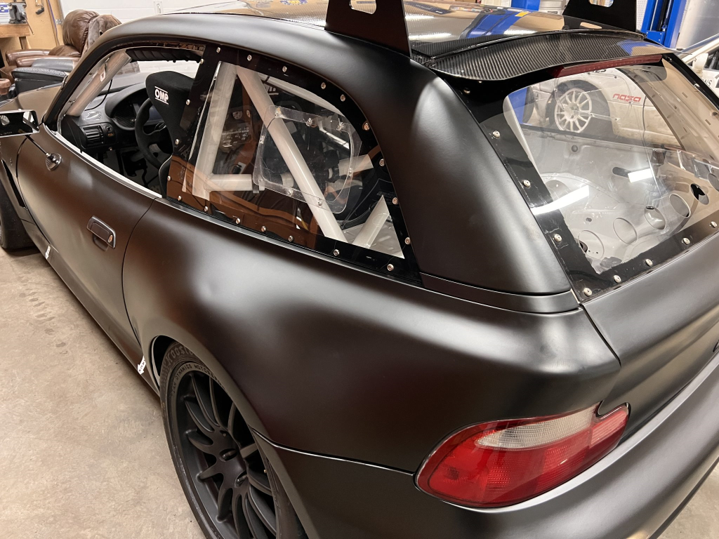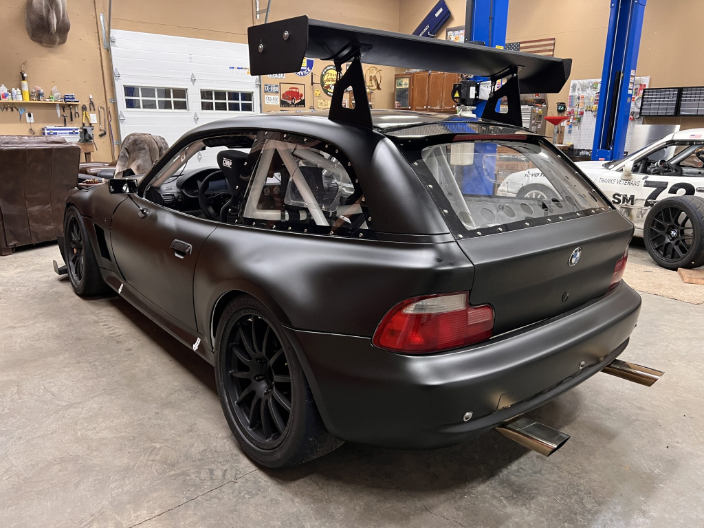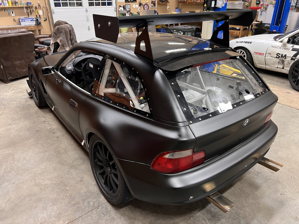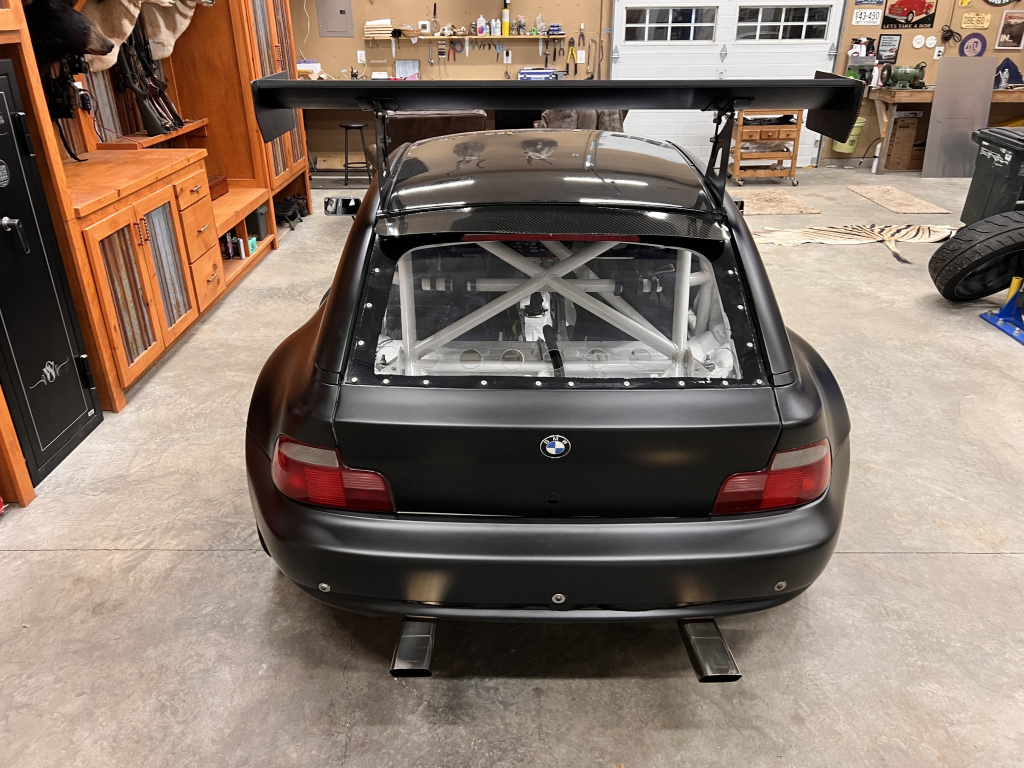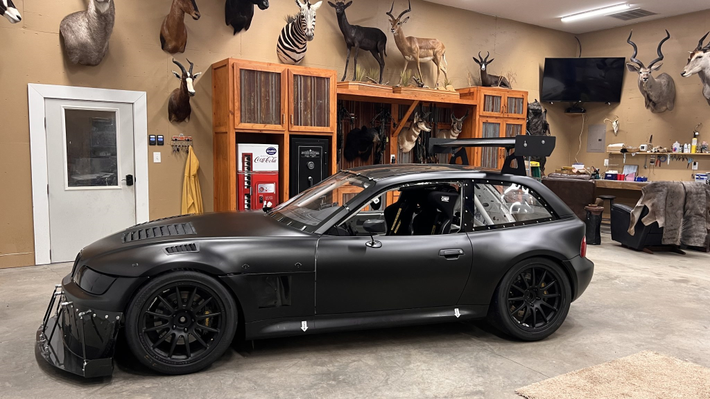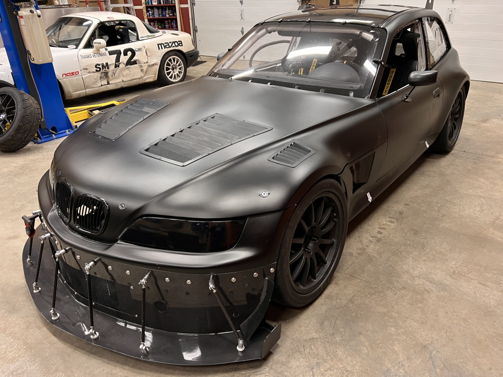 This 2001 BMW M Coupe was built into a track car by its previous owner. The chassis was stripped, stitch-welded, and fitted with carbon-fiber aerodynamic bodywork including a front splitter and rear wing in 2016. It rides on Team Dynamics Motorsport 18″ wheels and has Öhlins coilover suspension, AP Racing brake calipers, and a reinforced rear subframe. Race seats with harnesses are joined by a 12-point custom-fabricated roll cage, a Holley digital dashboard and ECU, and asteering wheel. The 427ci LS-based stroker V8 built by Horsepower Research of McKinney, Texas is fitted with a Dailey Engineering dry-sump oiling system along with a Callies CompStar crankshaft and connecting rods, and it was rebuilt following the seller’s acquisition. The car was also wrapped in matt-black vinyl, Hoosier tires were mounted, and a replacement clutch was fitted for the Tremec T56 six-speed manual transmission, along with a replacement steering wheel, 80 lb/hr injectors, starter, OMP race seat, and both harnesses. Acquired by the seller on BaT in January 2025, this track-prepared M Coupe is now offered at no reserve with spare components, records, and a Maryland title in the seller’s name.