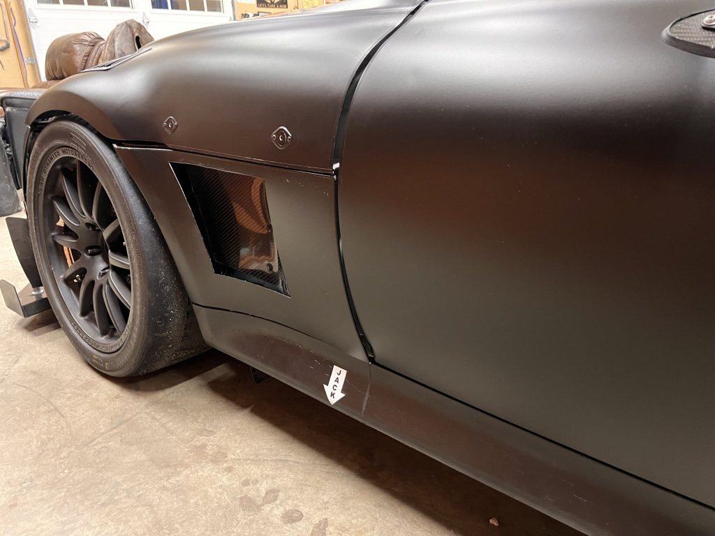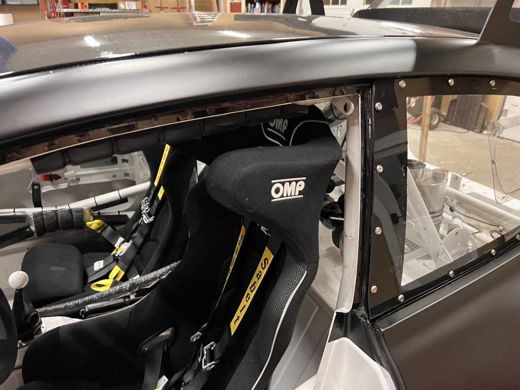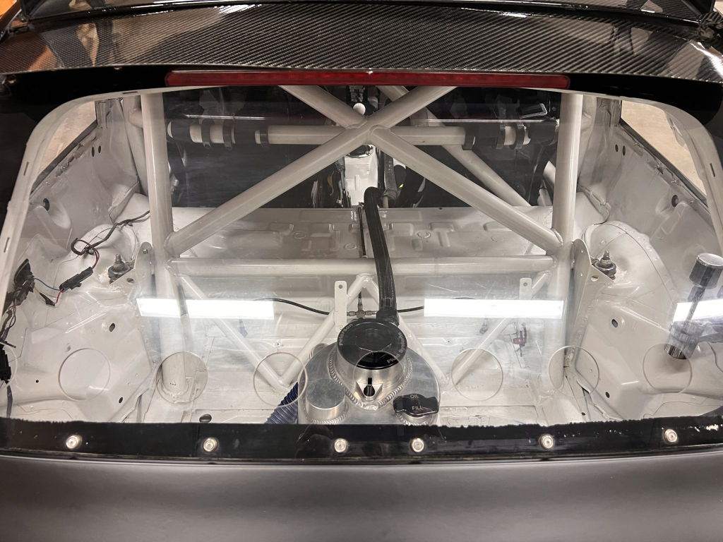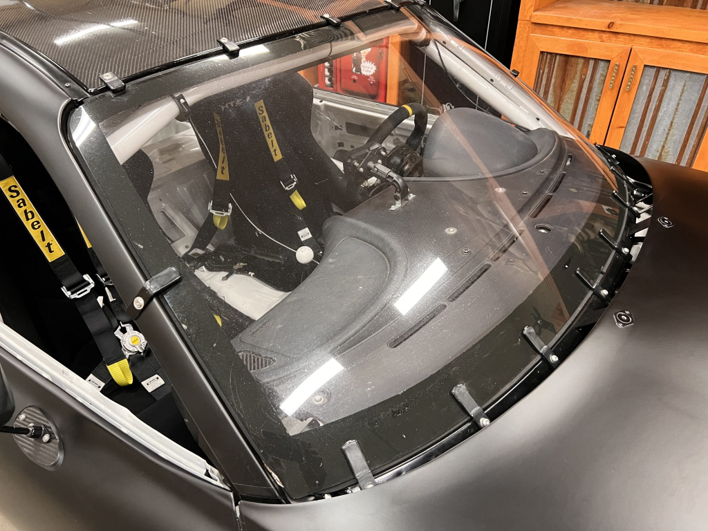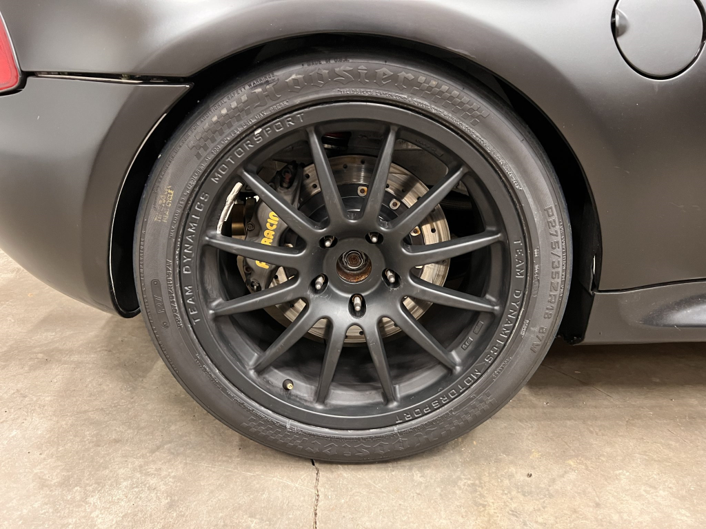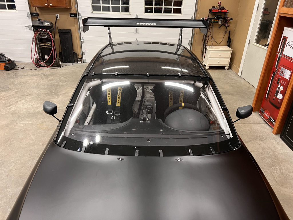 The car has been modified with a polycarbonate windshield, rear and side windows as well as a vented carbon fiber hood attached via Dzus fasteners, a carbon-fiber roof panel, and a rear wing mounted via custom aluminum uprights. Most of the body panels were replaced and the chassis was stripped to a bare shell and stitched-welded in 2016 following a rollover on track. The Carfax report lists an accident in 2007.