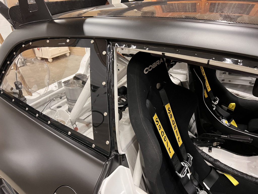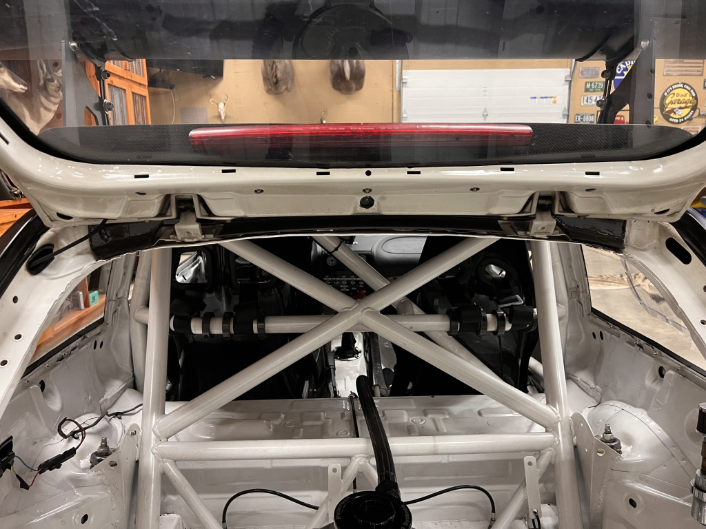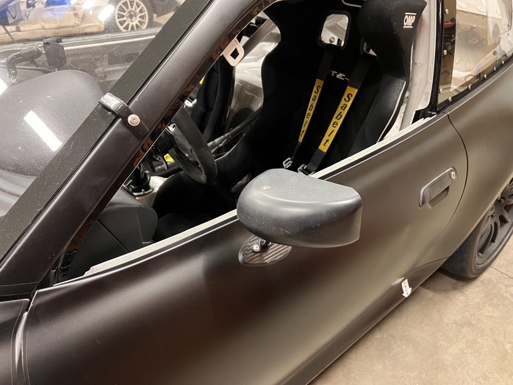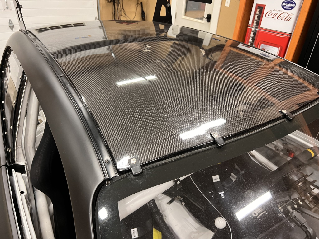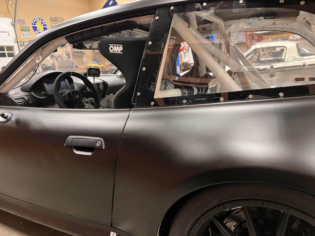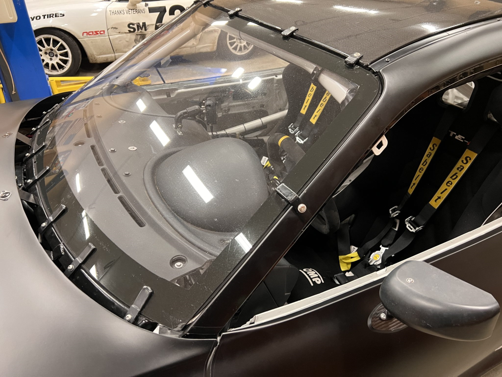 The car has been modified with a polycarbonate windshield, rear and side windows as well as a vented carbon fiber hood attached via Dzus fasteners, a carbon-fiber roof panel, and a rear wing mounted via custom aluminum uprights. Most of the body panels were replaced and the chassis was stripped to a bare shell and stitched-welded in 2016 following a rollover on track. The Carfax report lists an accident in 2007.