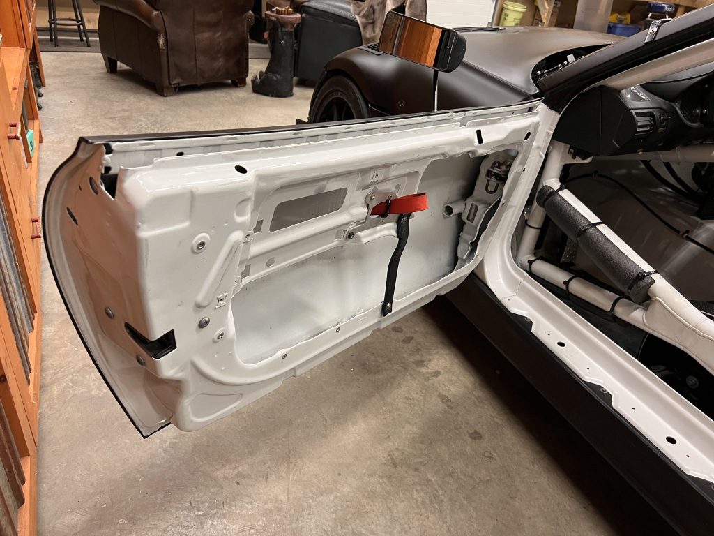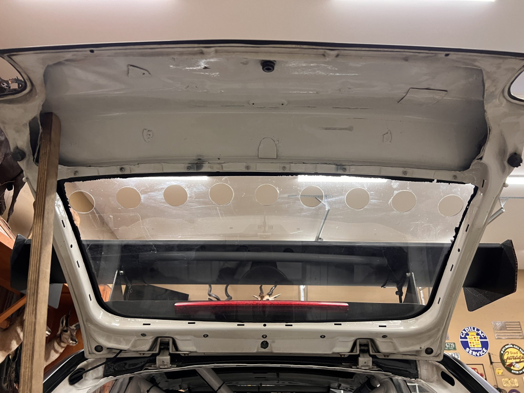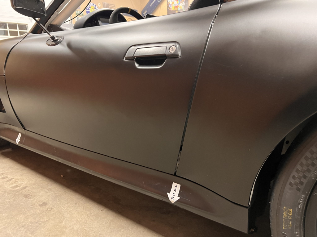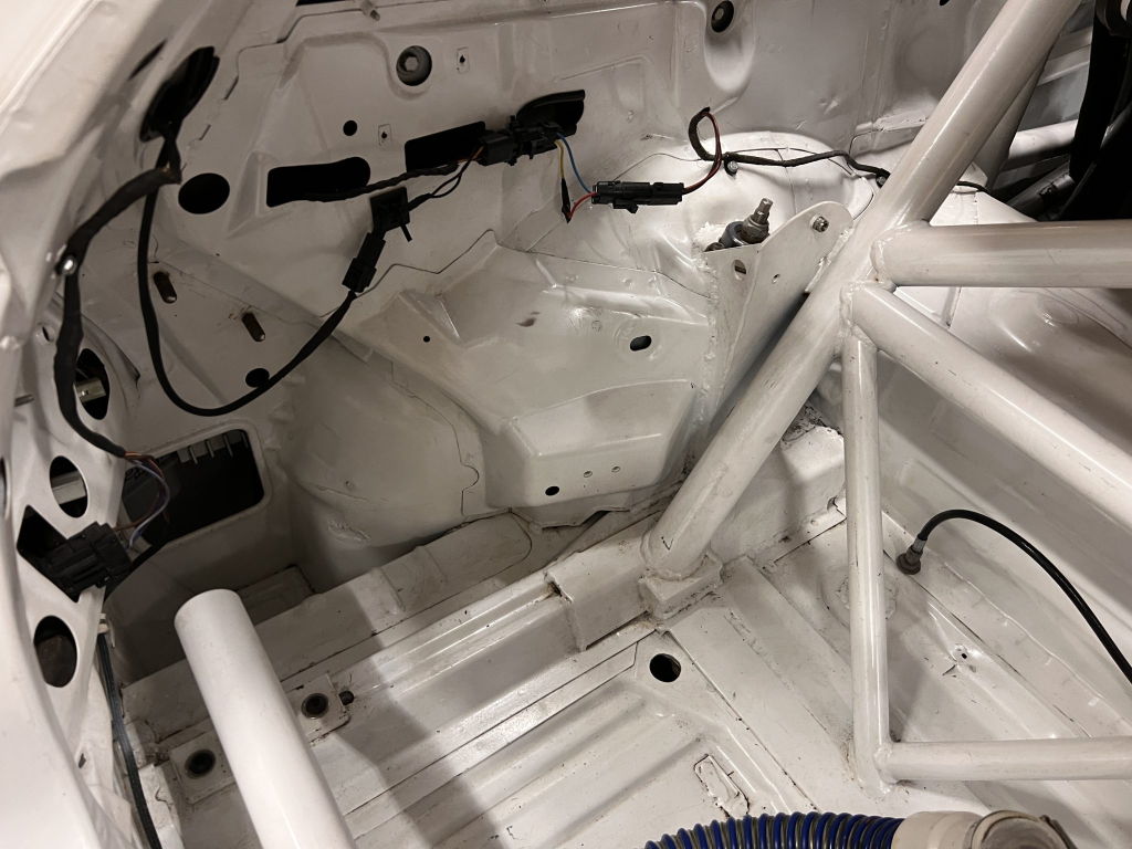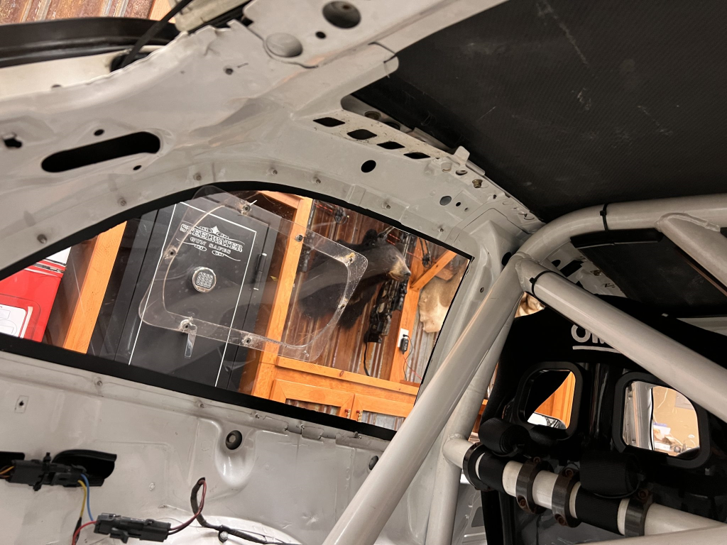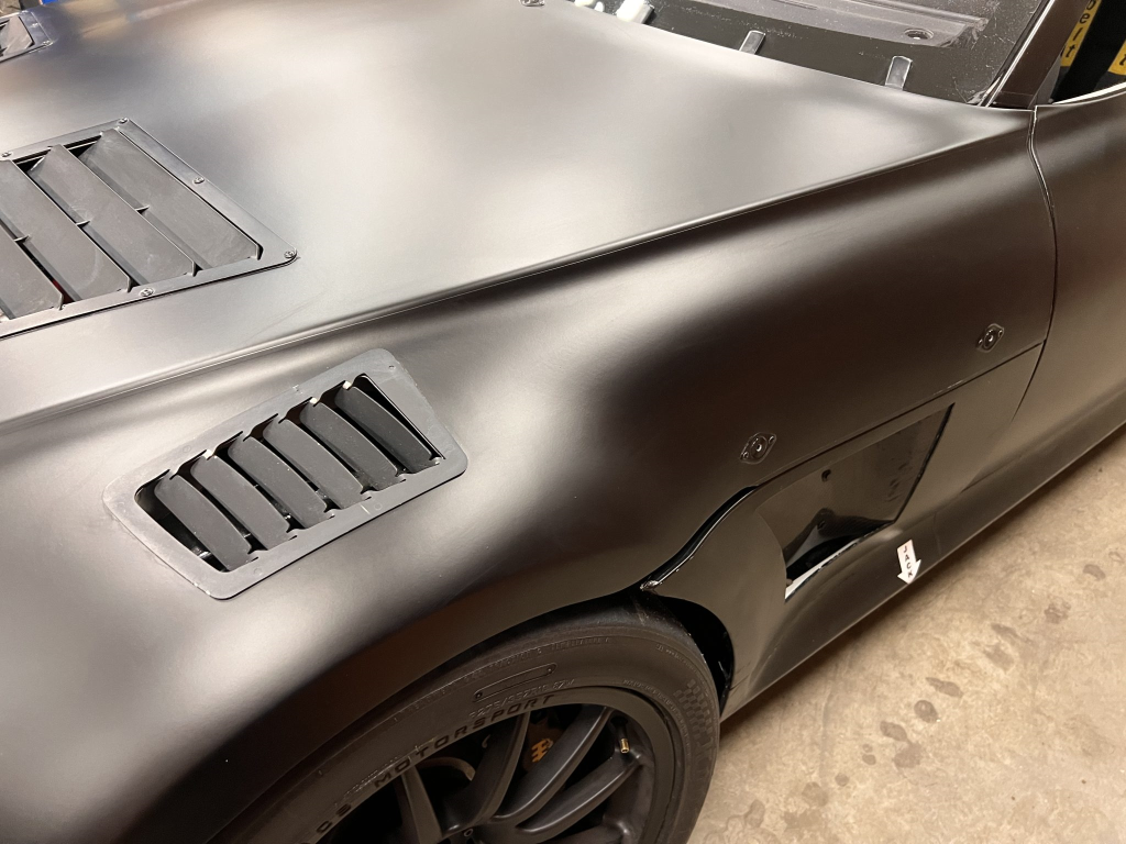 The car has been modified with a polycarbonate windshield, rear and side windows as well as a vented carbon fiber hood attached via Dzus fasteners, a carbon-fiber roof panel, and a rear wing mounted via custom aluminum uprights. Most of the body panels were replaced and the chassis was stripped to a bare shell and stitched-welded in 2016 following a rollover on track. The Carfax report lists an accident in 2007.