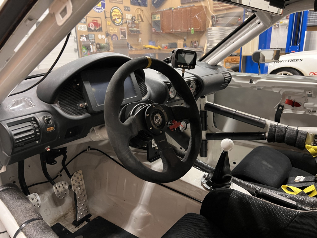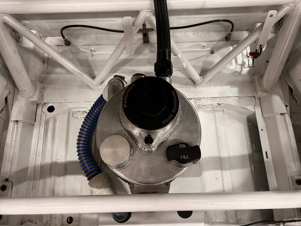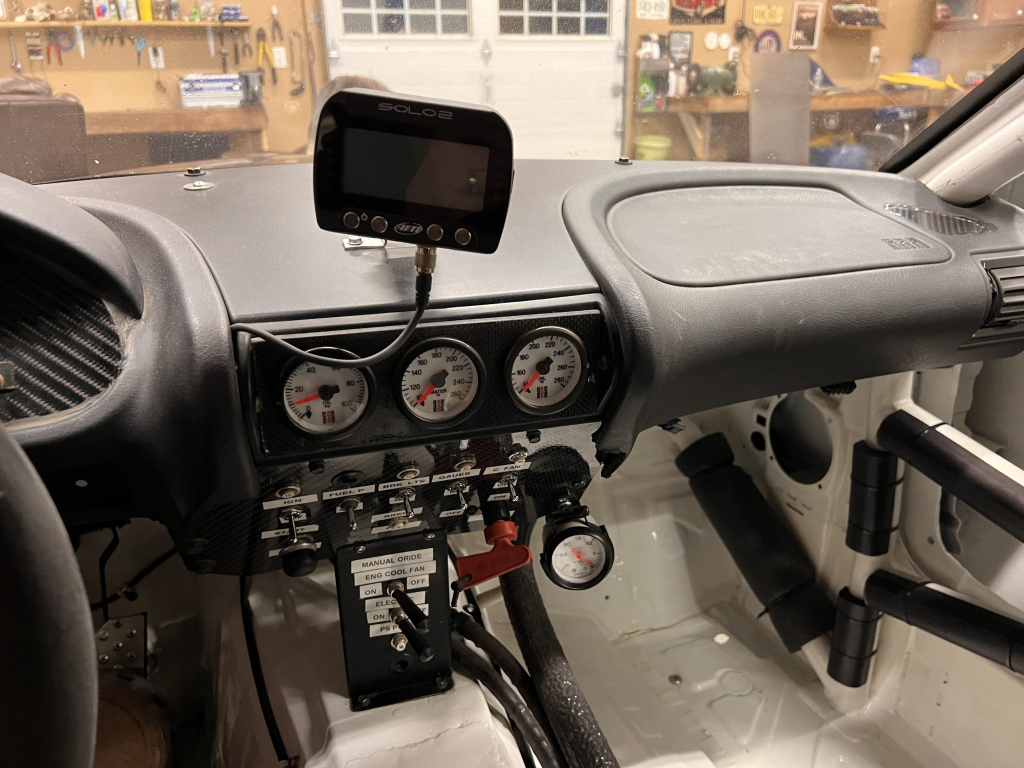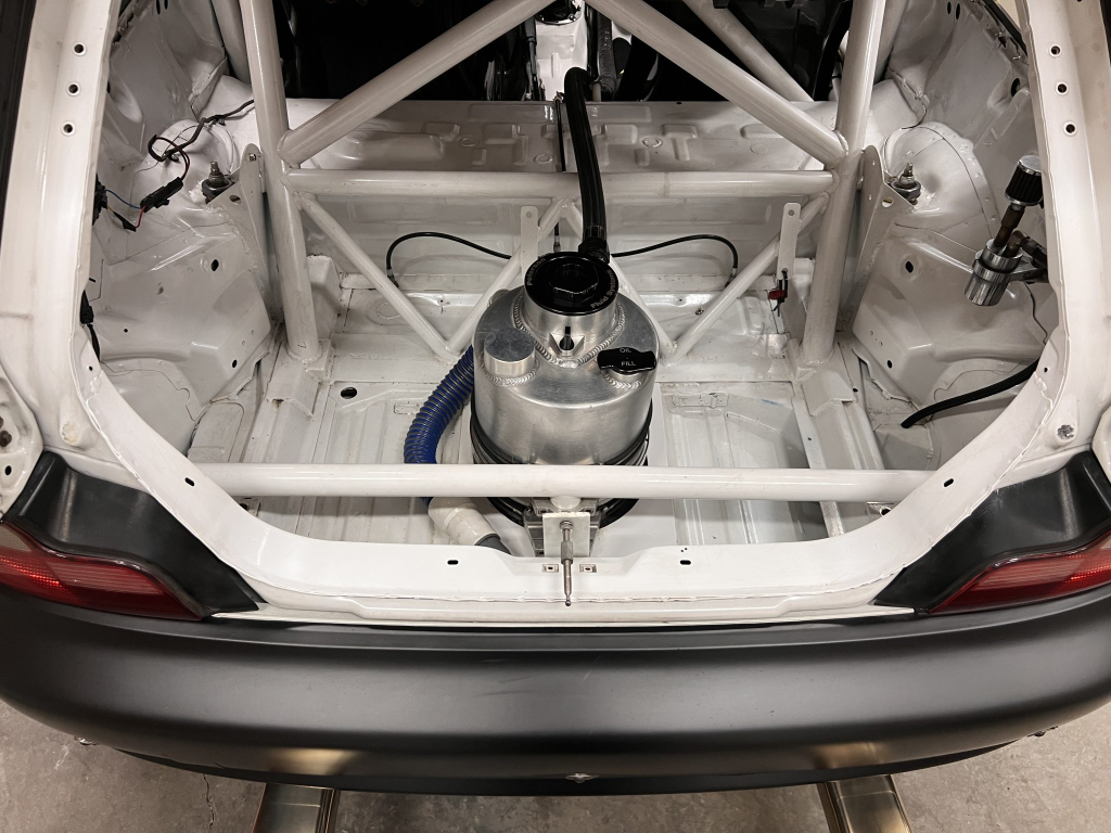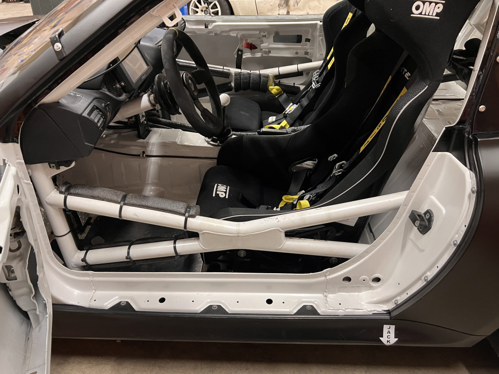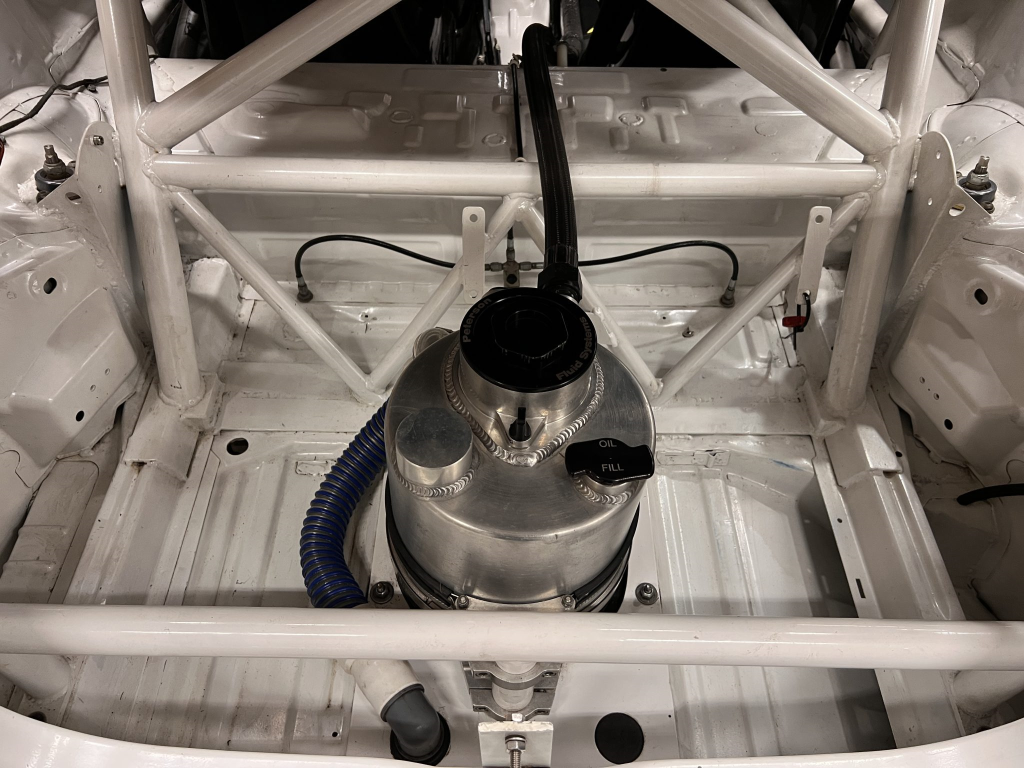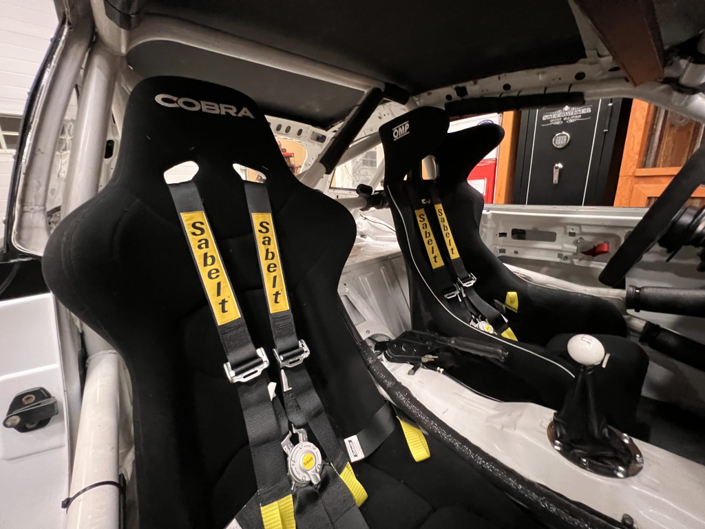Since the last auction, an OMP bucket seat and both matching Sabelt harnesses were fitted. The fabricated roll cage is painted white, and the modified dashboard houses a carbon fiber switch panel, above which is mounted an AiM Solo datalogger. Additional equipment includes a four-panel rearview mirror, alloy pedals, and a rear-mounted Peterson Fluid Systems oil tank for the dry-sump system.