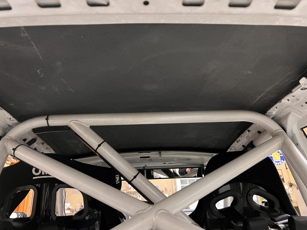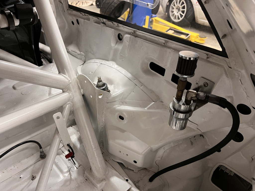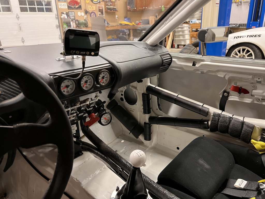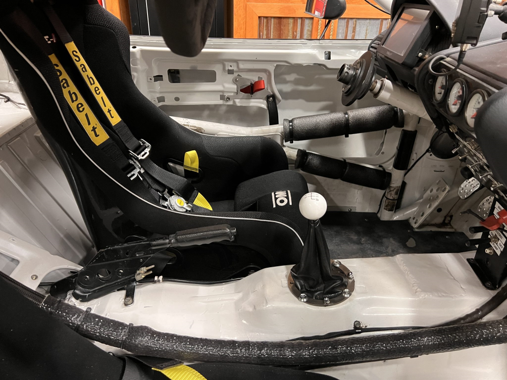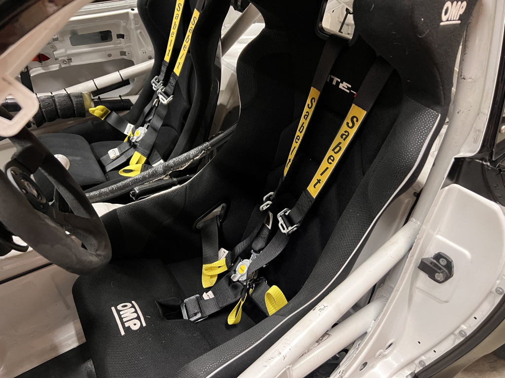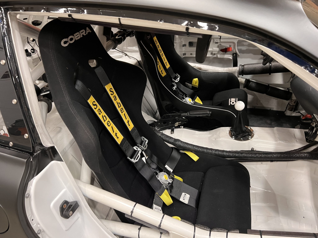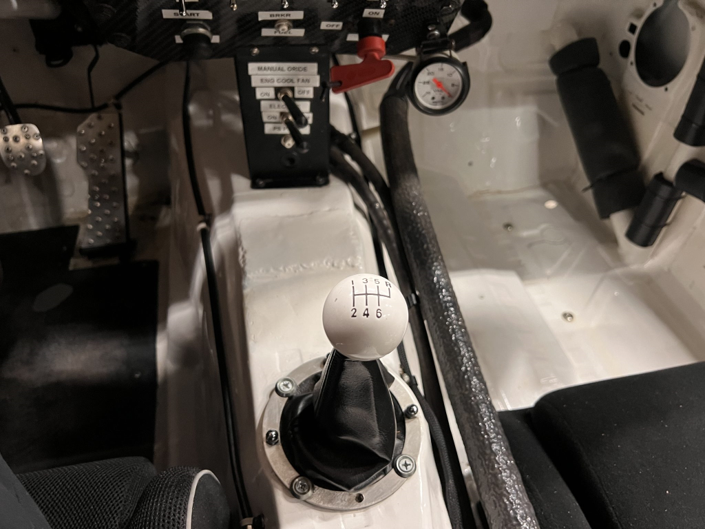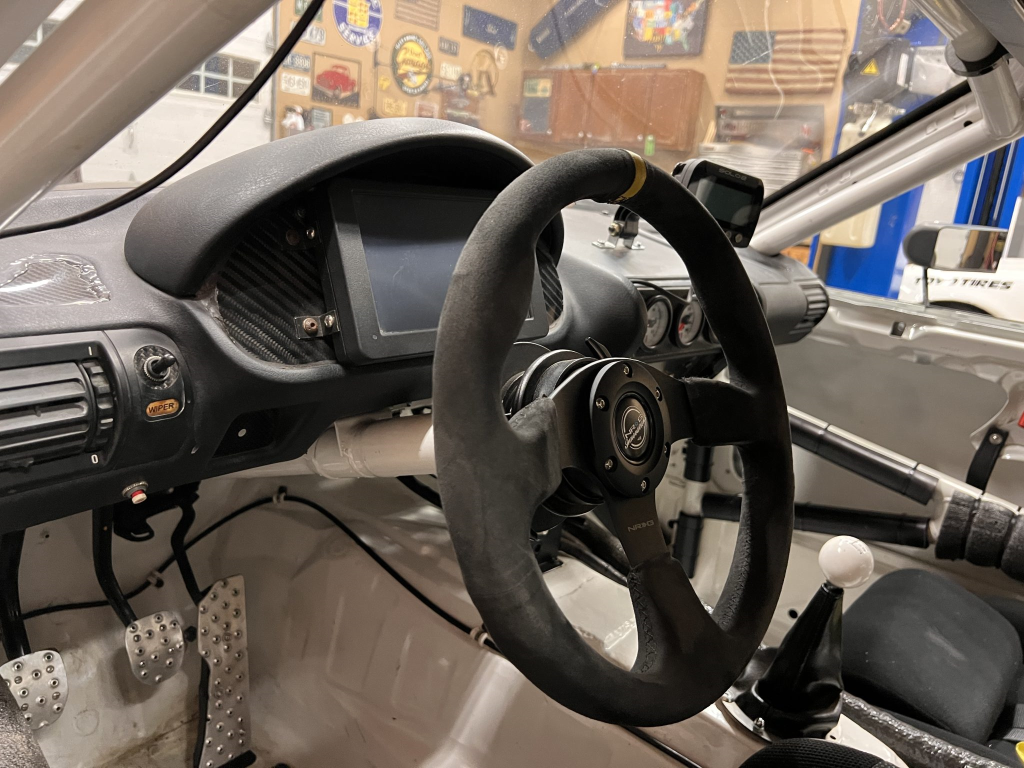 Since the last auction, an OMP bucket seat and both matching Sabelt harnesses were fitted. The fabricated roll cage is painted white, and the modified dashboard houses a carbon fiber switch panel, above which is mounted an AiM Solo datalogger. Additional equipment includes a four-panel rearview mirror, alloy pedals, and a rear-mounted Peterson Fluid Systems oil tank for the dry-sump system.