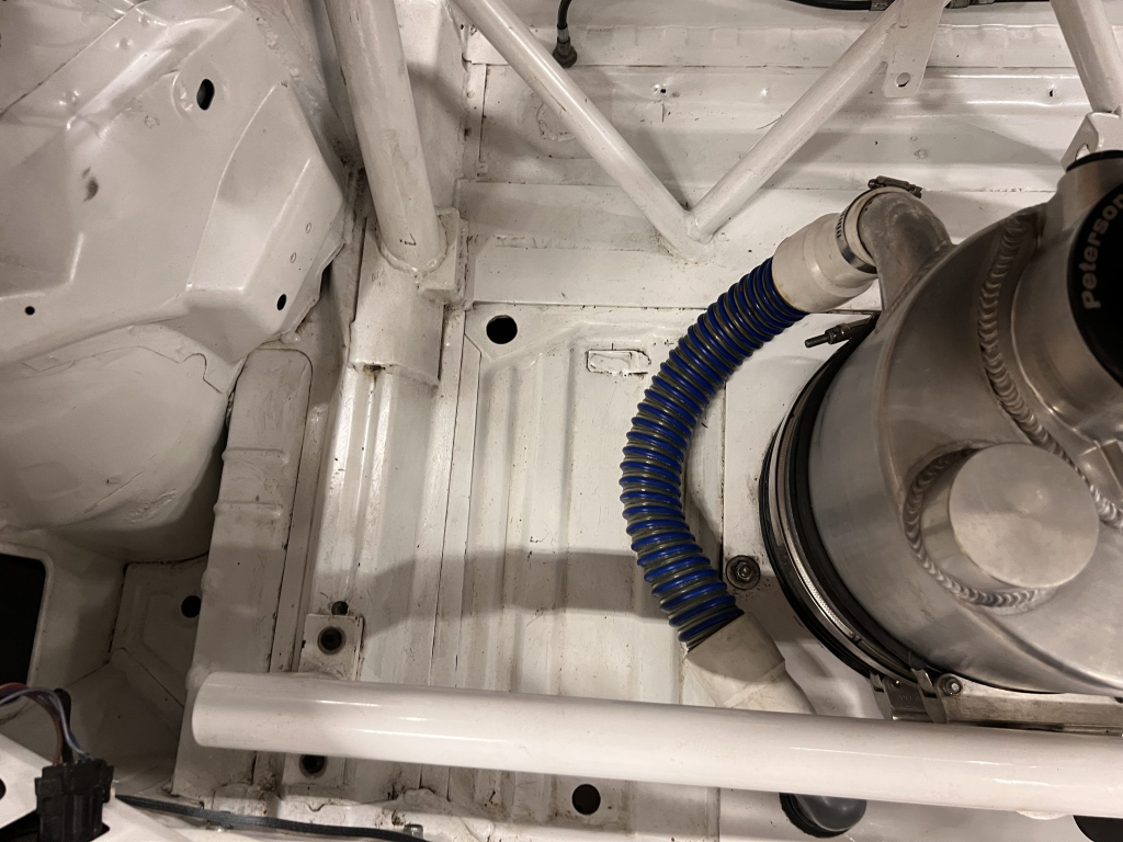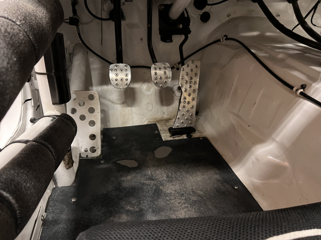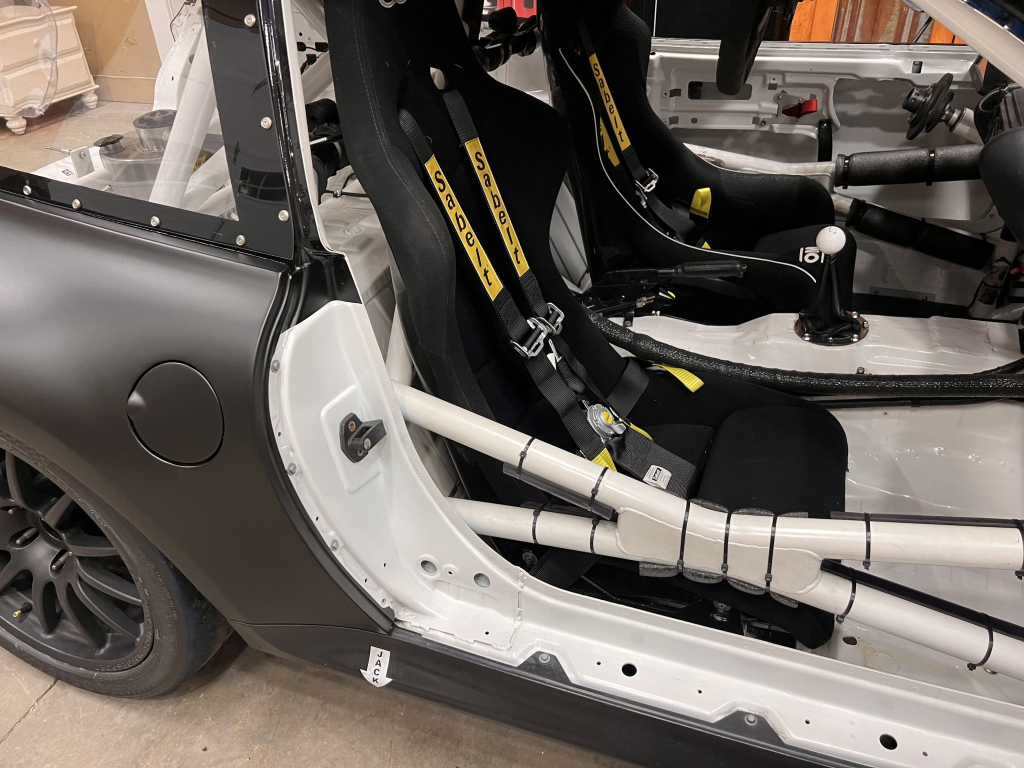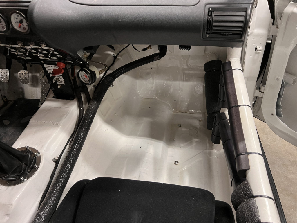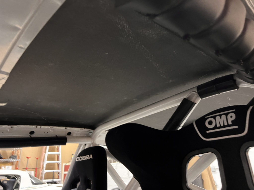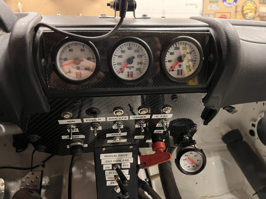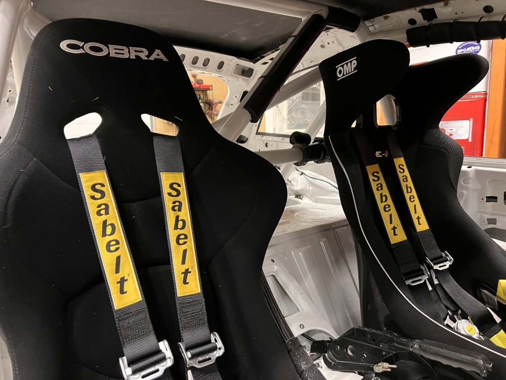 Since the last auction, an OMP bucket seat and both matching Sabelt harnesses were fitted. The fabricated roll cage is painted white, and the modified dashboard houses a carbon fiber switch panel, above which is mounted an AiM Solo datalogger. Additional equipment includes a four-panel rearview mirror, alloy pedals, and a rear-mounted Peterson Fluid Systems oil tank for the dry-sump system.