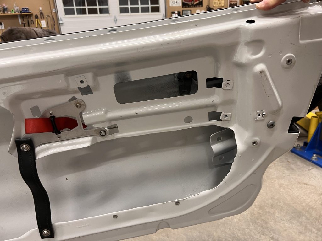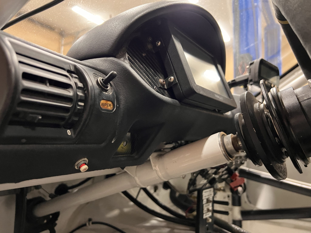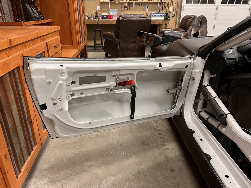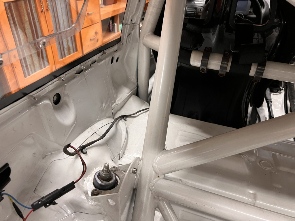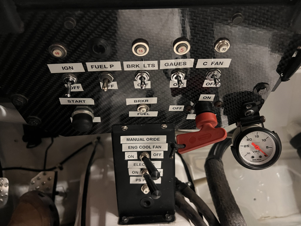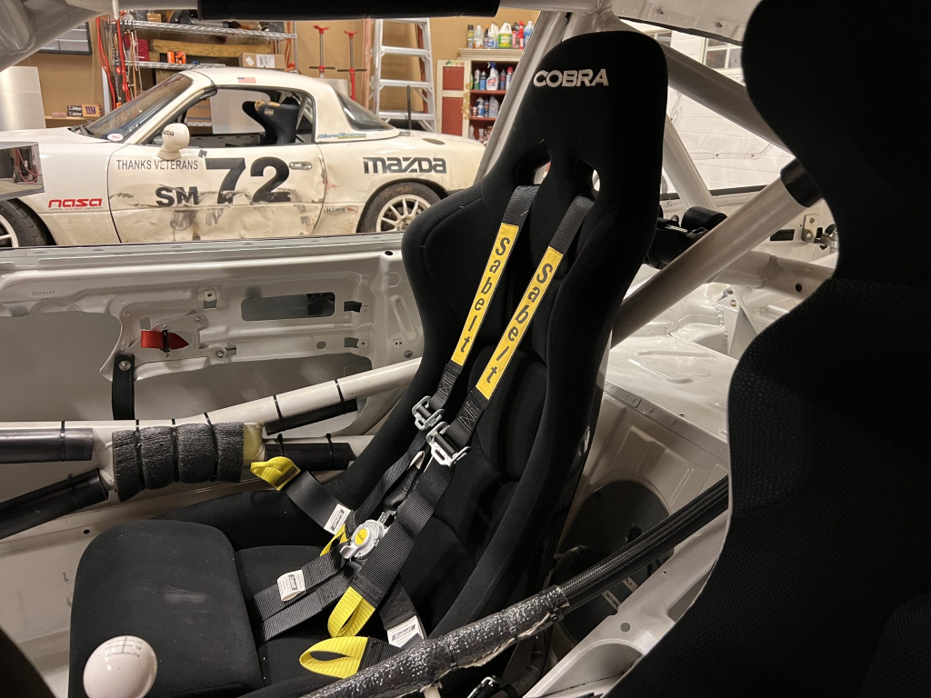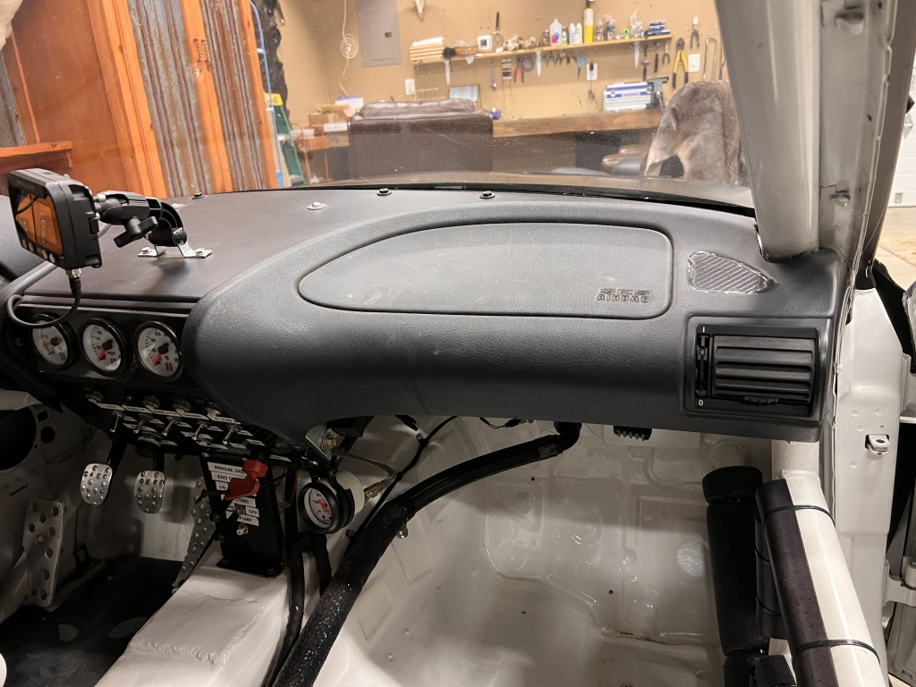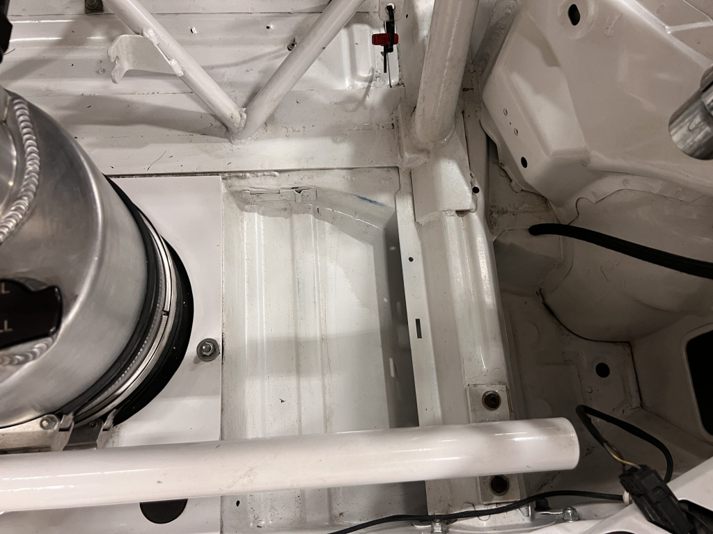Since the last auction, an OMP bucket seat and both matching Sabelt harnesses were fitted. The fabricated roll cage is painted white, and the modified dashboard houses a carbon fiber switch panel, above which is mounted an AiM Solo datalogger. Additional equipment includes a four-panel rearview mirror, alloy pedals, and a rear-mounted Peterson Fluid Systems oil tank for the dry-sump system.