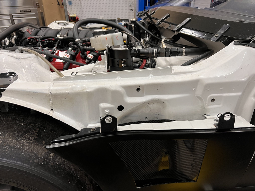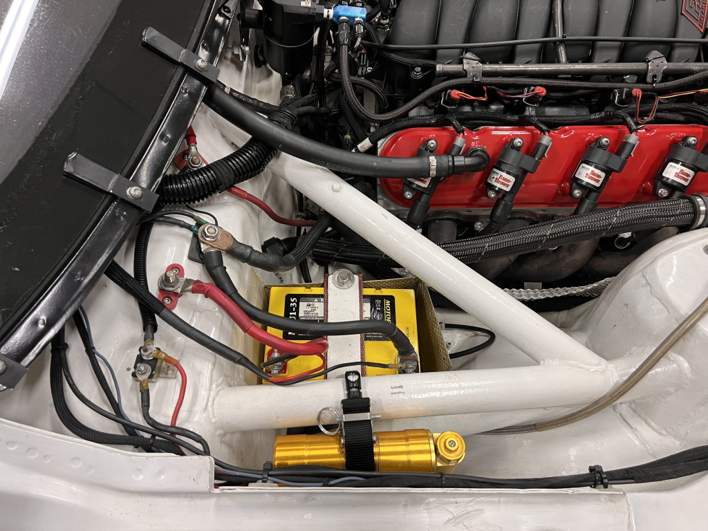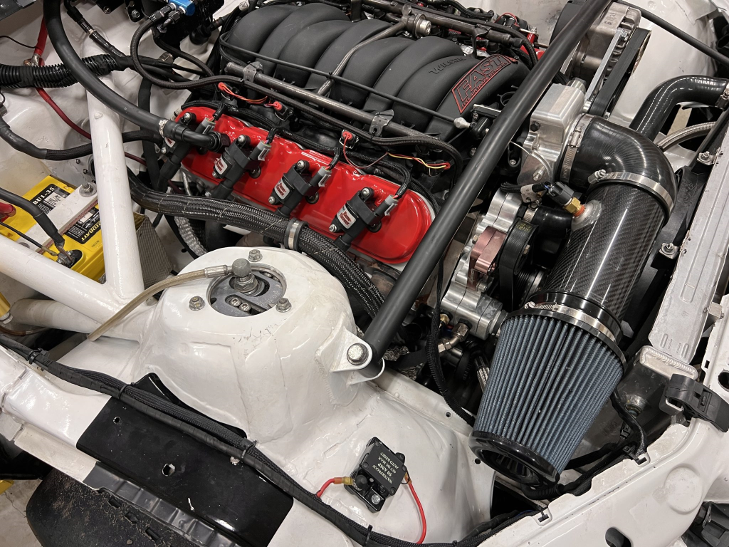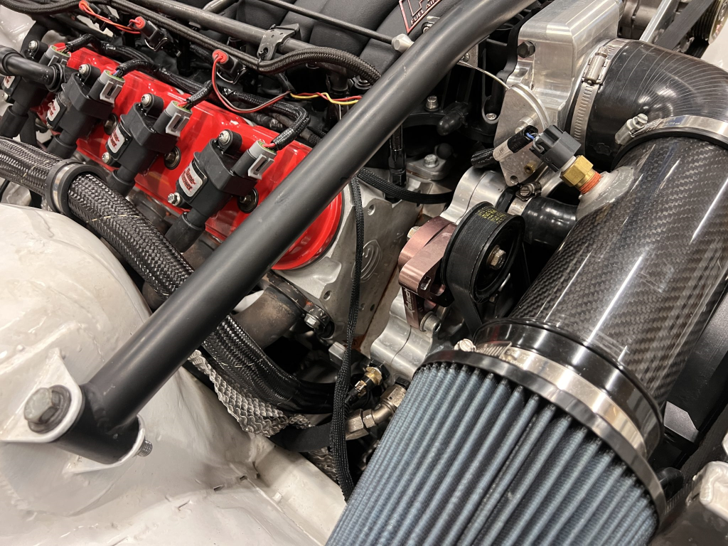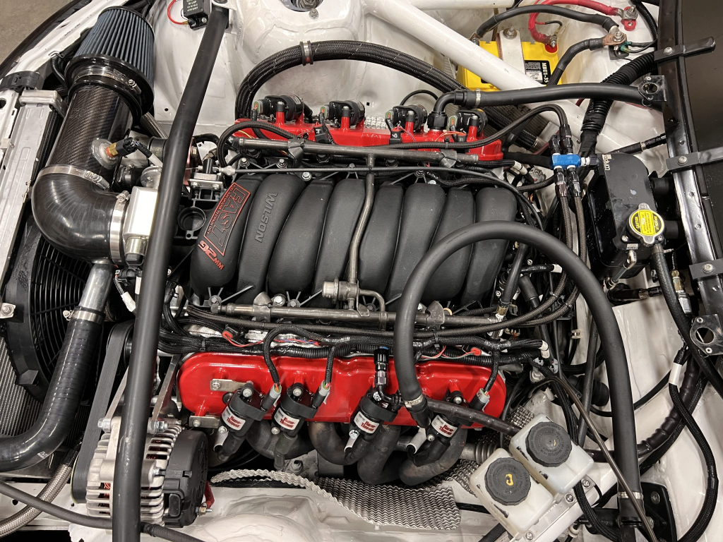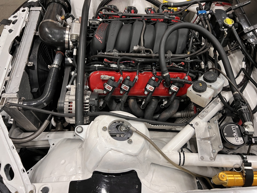 The 427ci LS stroker V8 was built by Horsepower Research of McKinney, Texas, in October 2024. The block was fitted with Darton LS7 dry liners and a balanced Callies CompStar crankshaft before being reassembled with Callies LS CompStar connecting rods, HPR Performance cylinder heads, and a 620/632 Comp Cams camshaft. The engine is equipped with a rebuilt and upgraded dry-sump oiling system from Dailey Engineering.
