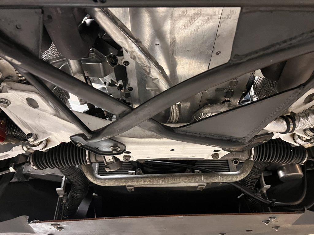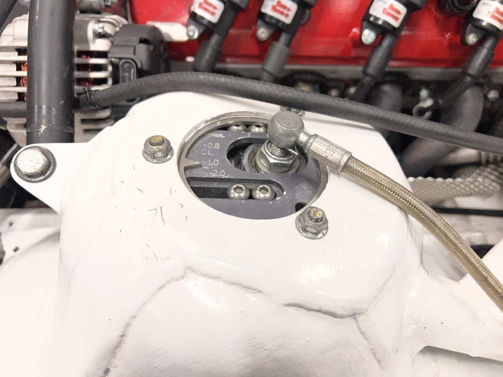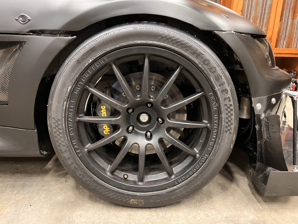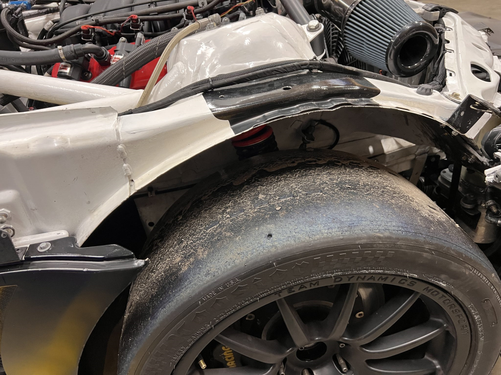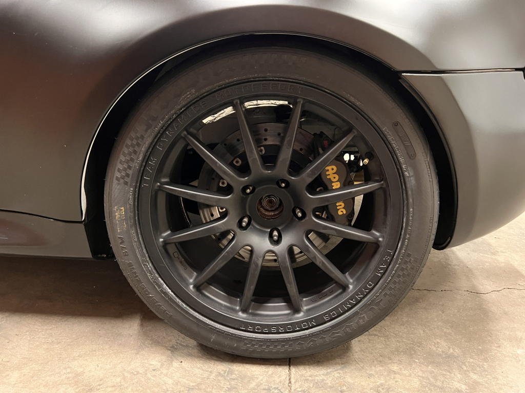Team Dynamics Motorsport 18″ wheels are secured over Turner Motorsport 86mm studs and have Hoosier rubber mounted. Four-piston AP Racing calipers and 332x32mm rotors are mounted at each corner and utilize stainless-steel lines, a Chase Bays adjustable bias valve, TMS cooling plates, and Wilwood pads. The brake booster has been removed. Reinforements have been added to the front and rear sway bar mounts, the front and rear subframes, the front X-brace, and rear trailing arms. The rear trailing arms and subframe were modified to accommodate fully adjustable DTM-style spherical bushings, while the front subframe was revised to accommodate an MRT Engineering front suspension kit comprised of a solid mount control arm bushing with spherical bushings throughout and billet aluminum control arms and tie rods with bump steer correction. TMS solid aluminum rear subframe bushings have been installed along with a Rogue Engineering differential cover with TMS solid aluminum bushings.