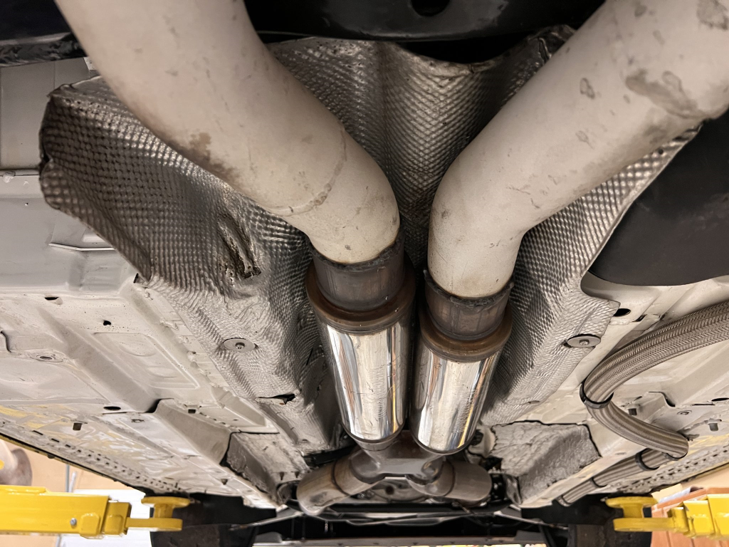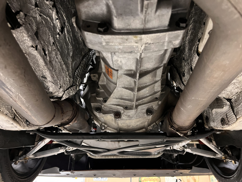 The Tremec T56 six-speed transmission is linked to a Diffsonline limited-slip differential with 3.73:1 gears and solid aluminum mounts. A McLeod twin-disc clutch was installed by the seller in July 2025, and the exhaust system features custom stainless-steel headers, dual 4″ resonators, and Borla mufflers with 3″ stainless steel piping.