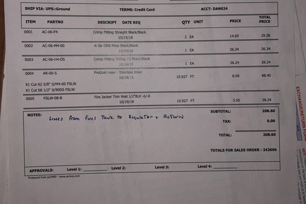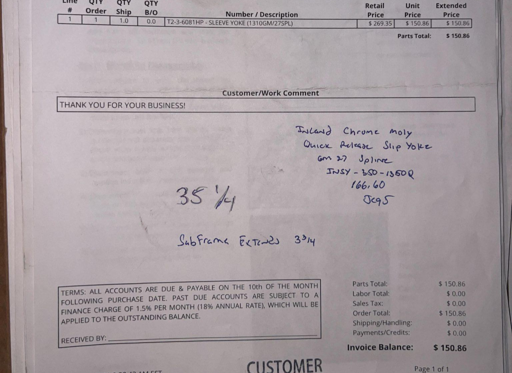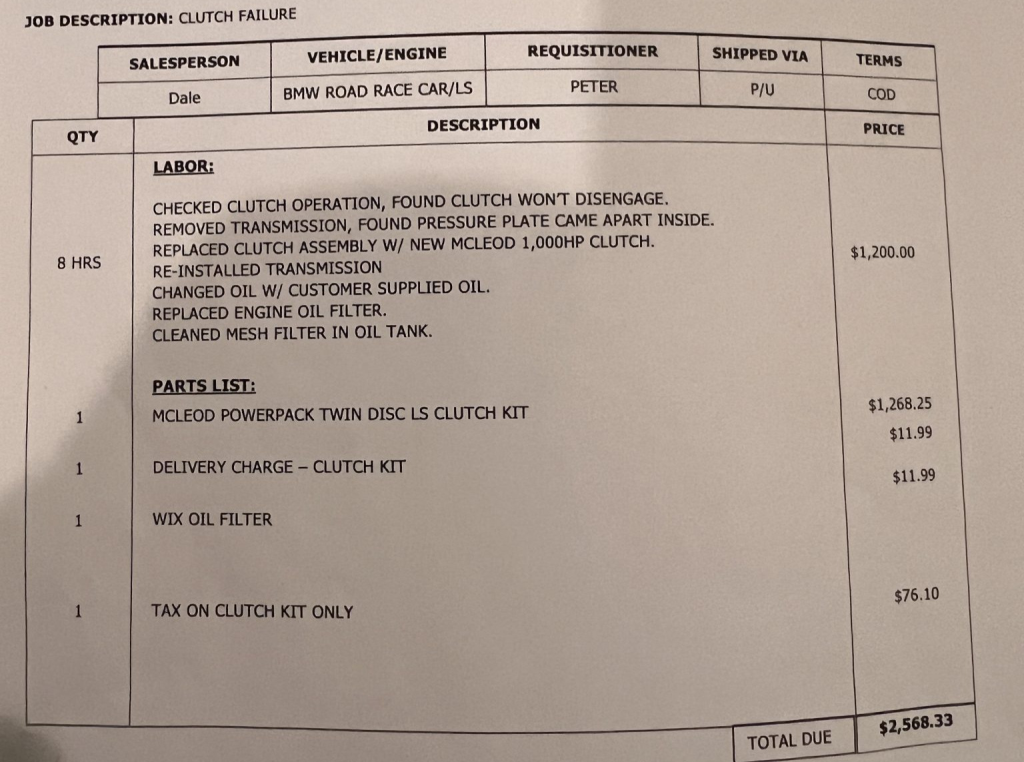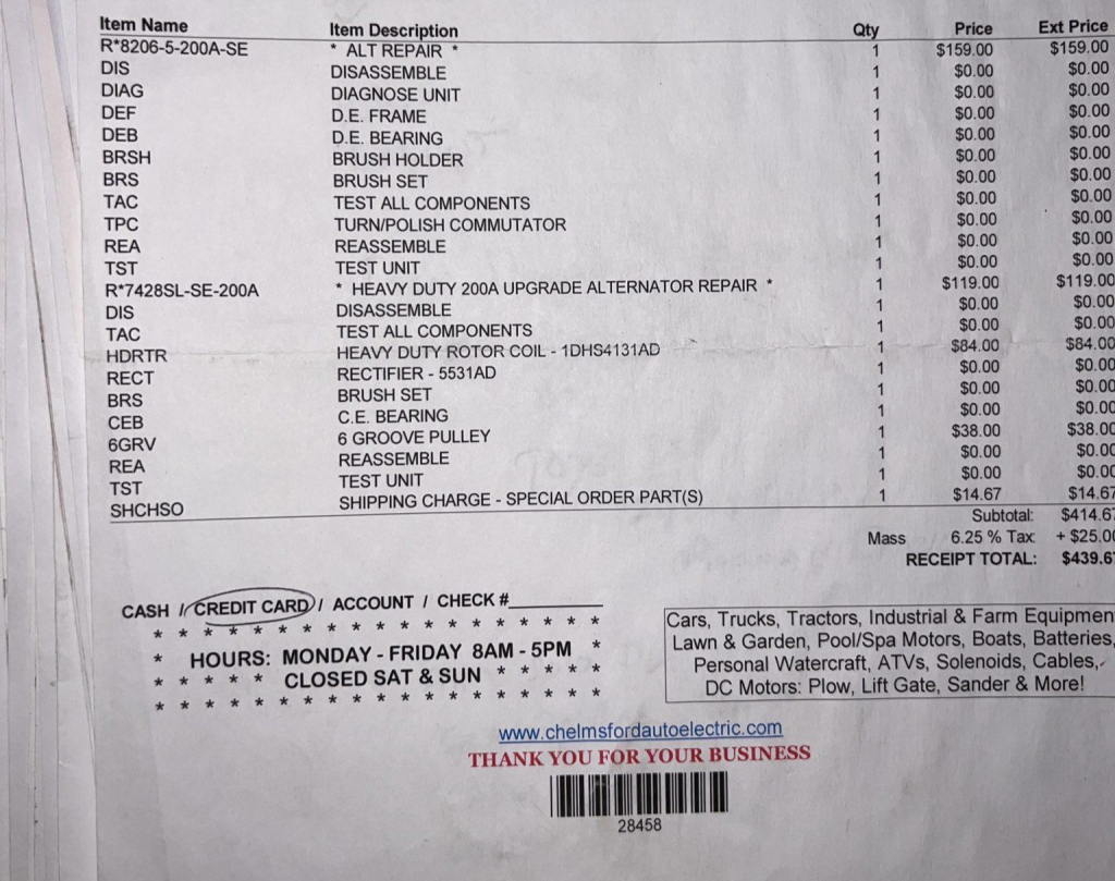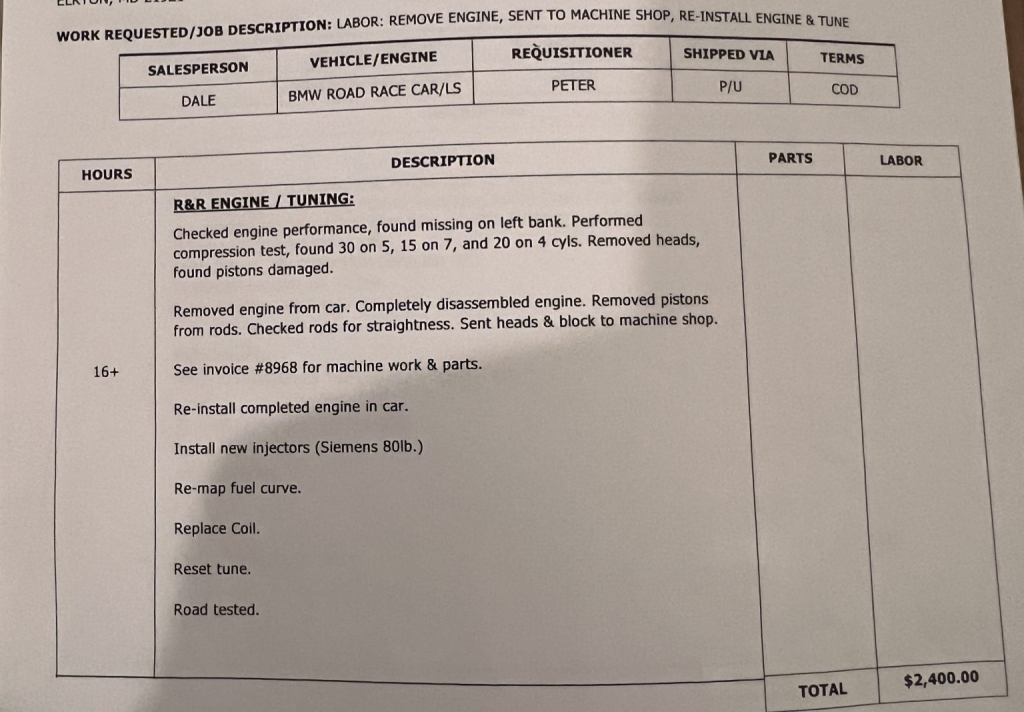 In June 2025, the engine was removed and rebuilt. Two valves were replaced, the crankshaft was polished, the block and heads were resurfaced, and Clevite bearings were installed along with Manley valves and custom pistons. 80 lb/hr injectors were also fitted and the starter was replaced, and the previous owner noted the following components: