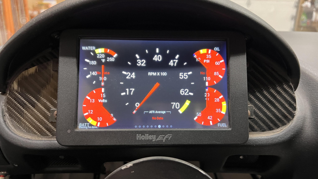 An NRG Innovations steering wheel was also installed by the seller. The Holley digital dashboard is mounted ahead of the driver, with additional gauges for coolant temperature, oil pressure, and oil temperature mounted in place of the center air vents. A crankcase vacuum gauge has also been added. The car is not equipped with an odometer, and total mileage is unknown.