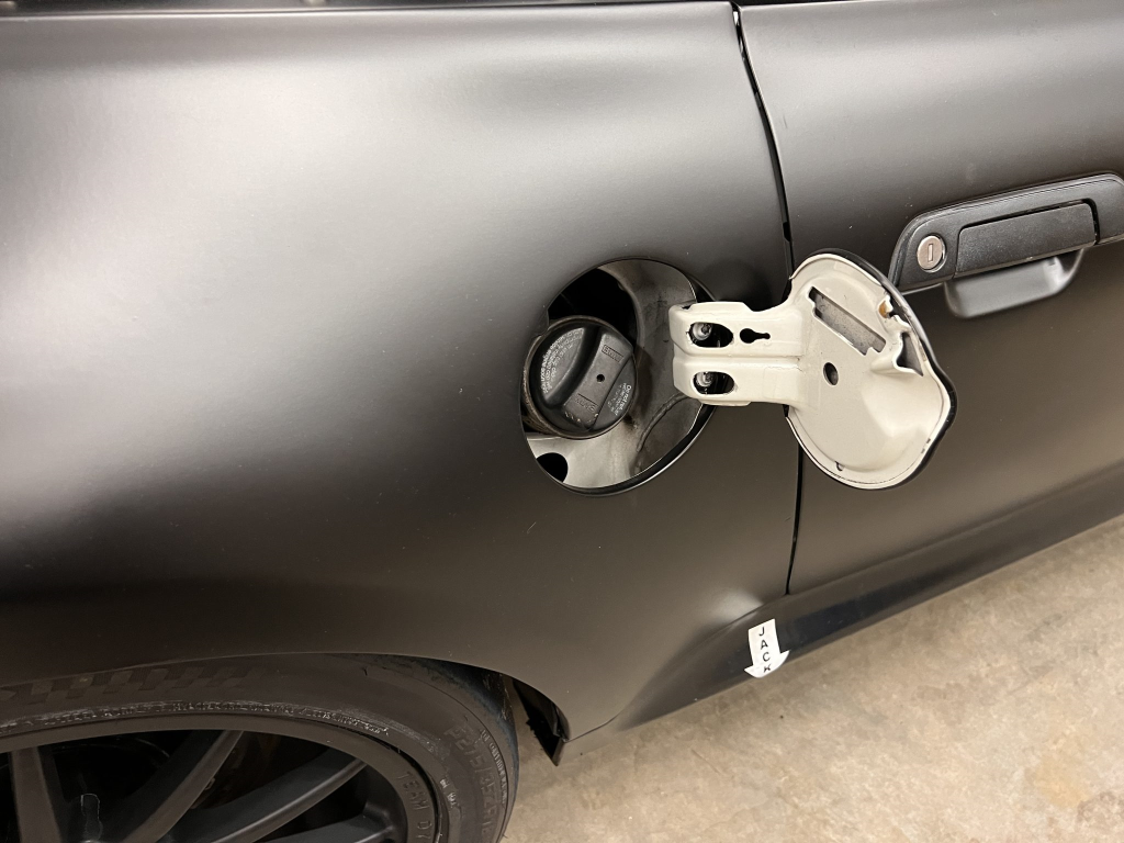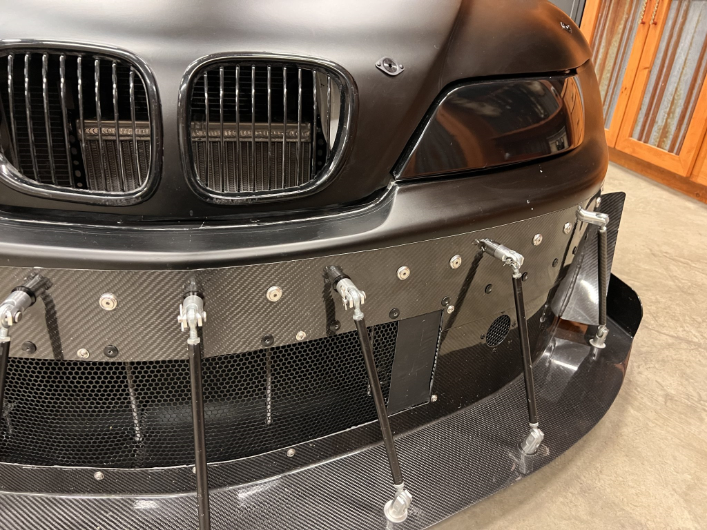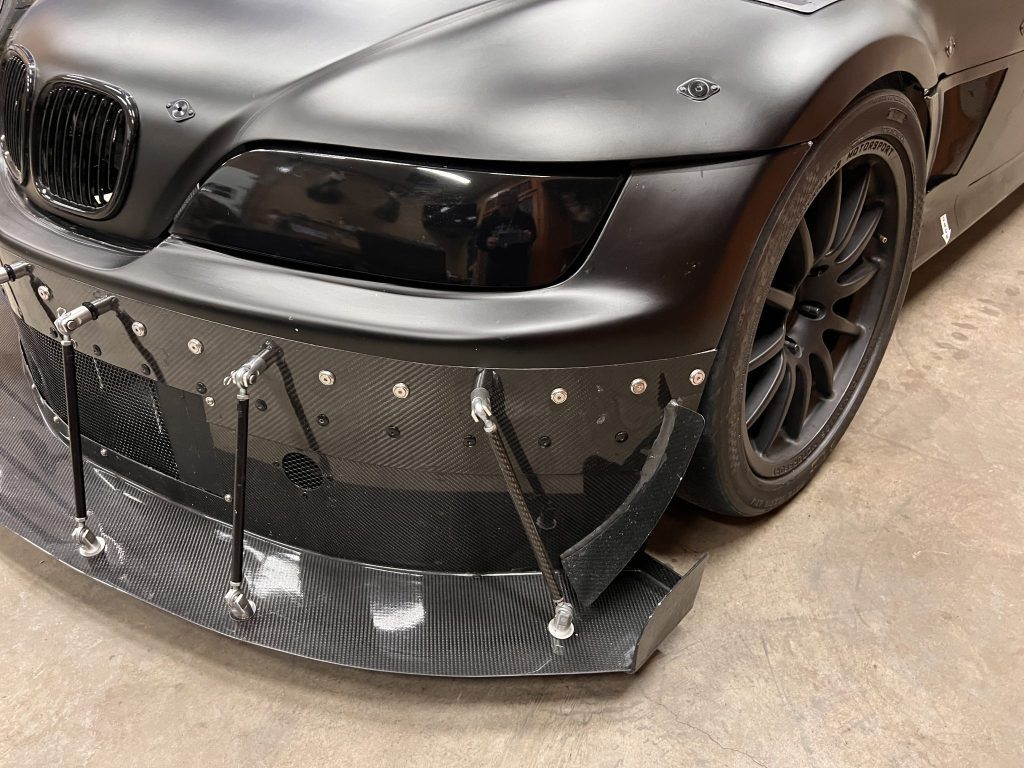The front bumper assembly has been modified and replaced with a carbon-fiber air dam/splitter with canards, end plates, and support rods. Noted flaws include a scrape on the corner of the front bumper cover. Since the last auction, the aluminum rear diffuser was removed and the body was wrapped in matte-black vinyl.